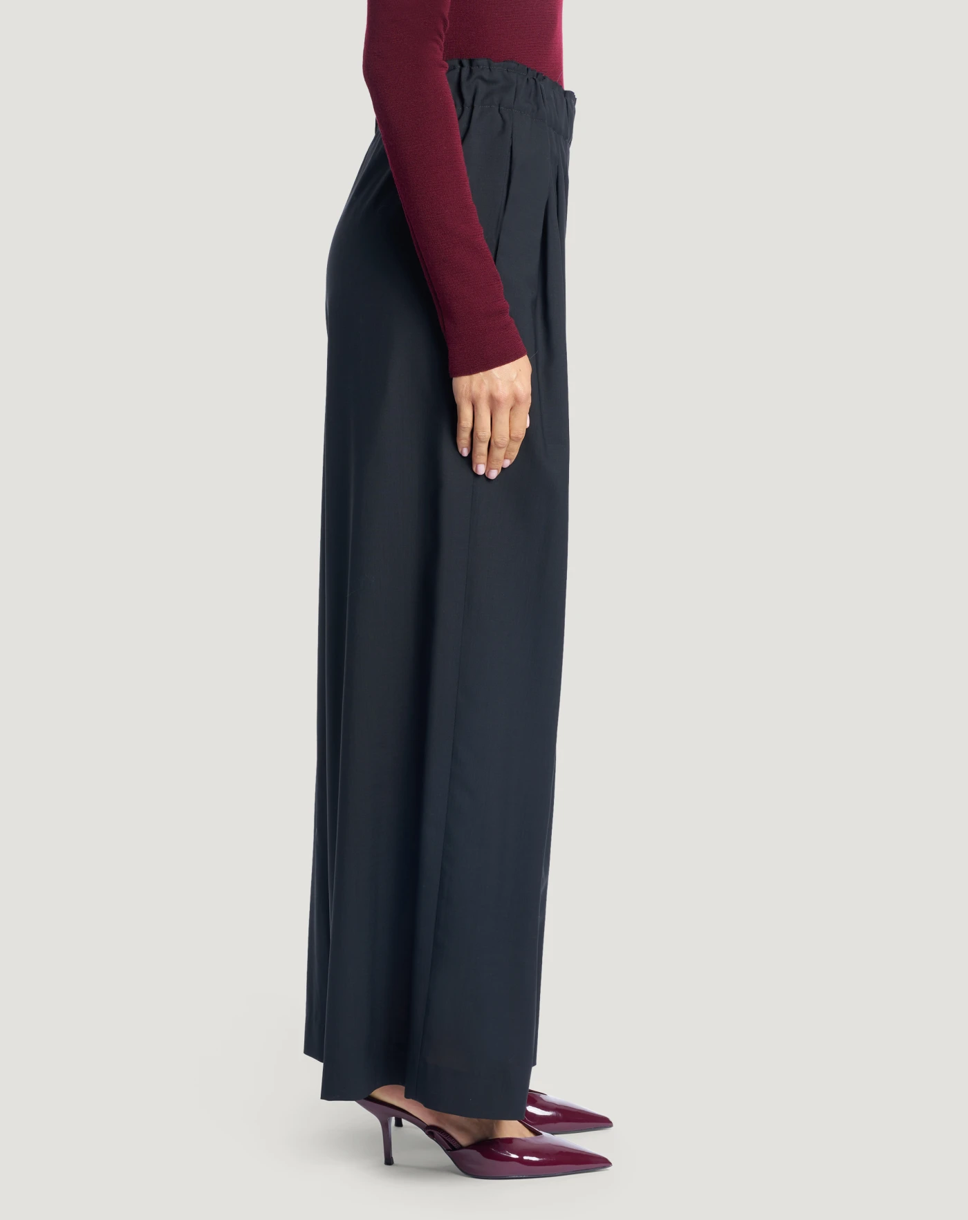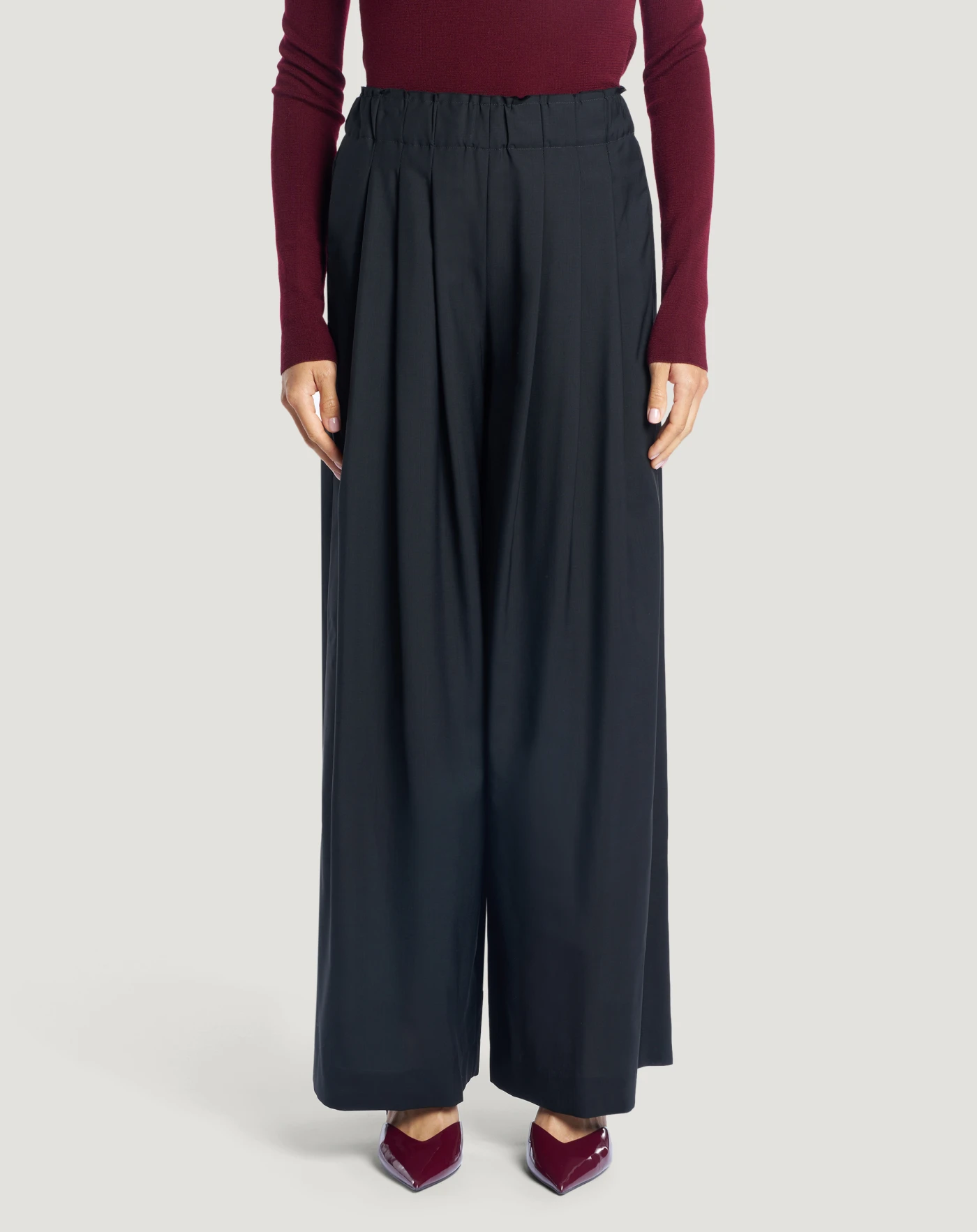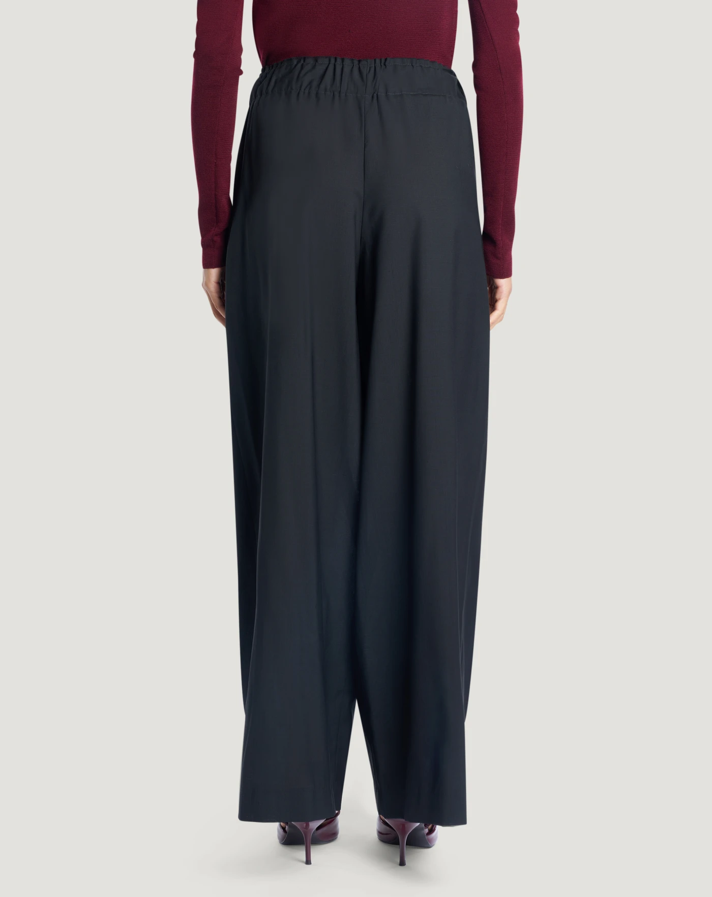 暖かく軽量で、テーラードスタイルの魅力が香る、スーパーライトピュアウール製のパンツです。腰回りにタックが入りウエストにゴムを加えた、はき心地抜群のゆったりとしたシルエットです。ブラックの色合いは、ルックにダイナミックで洗練されたタッチを加えるのに最適です。