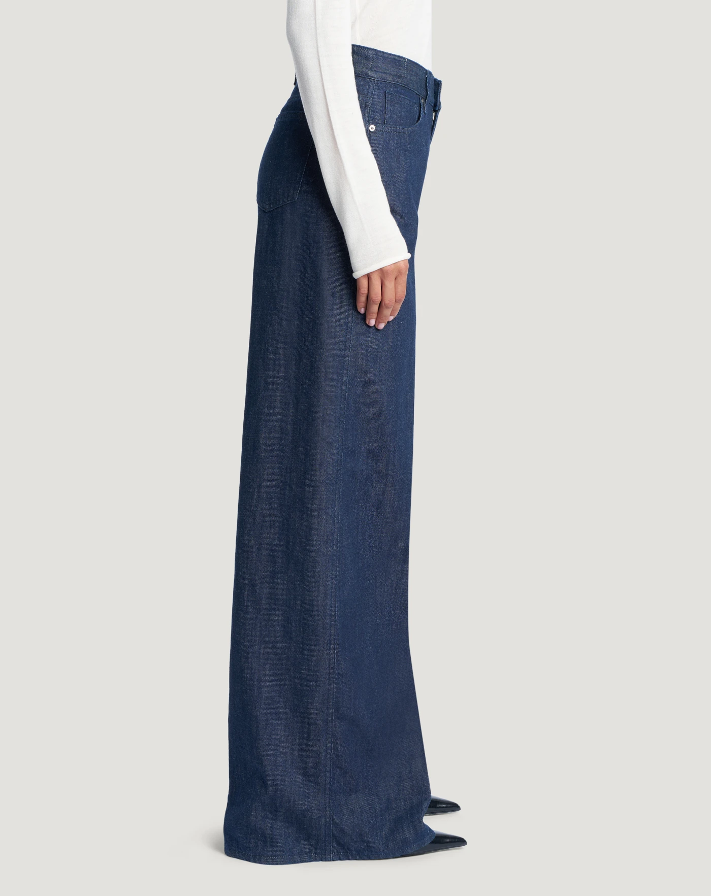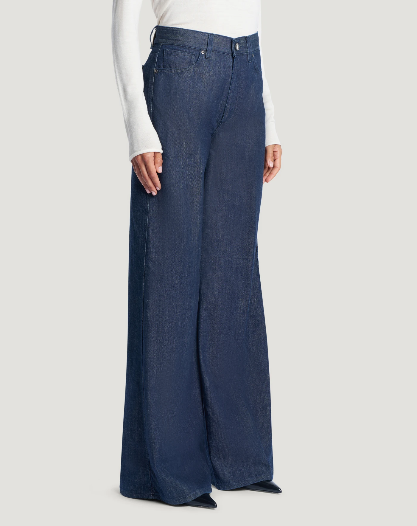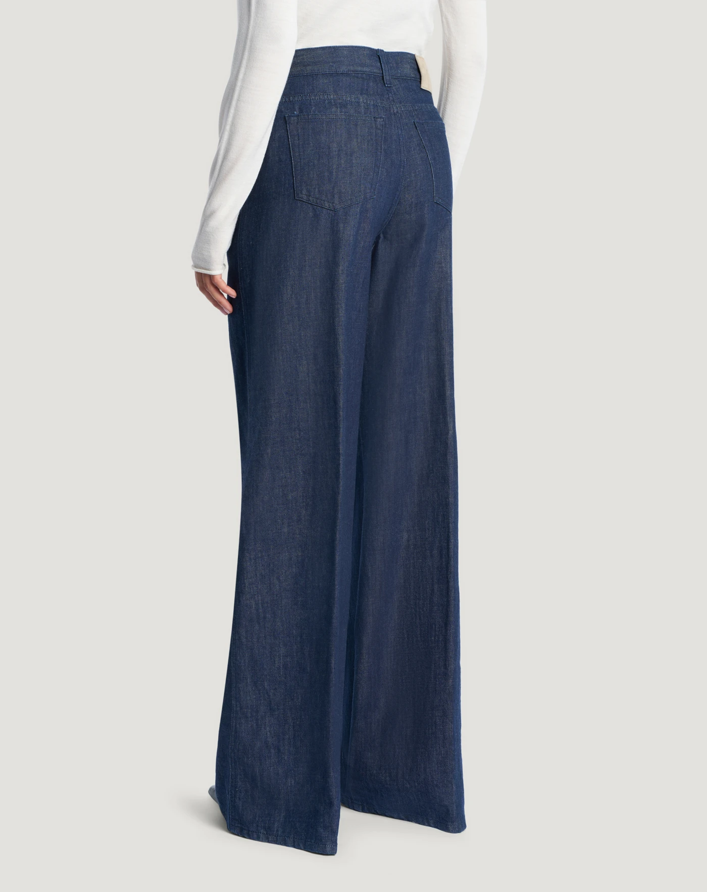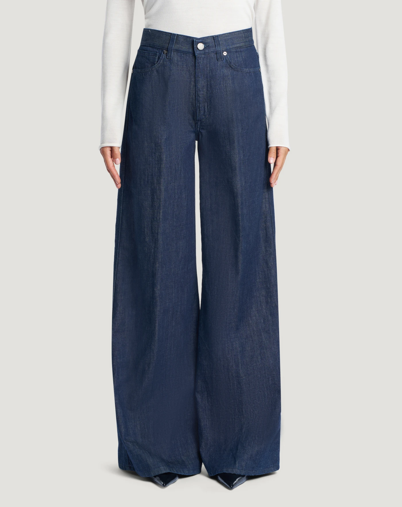 ノンストレッチのしっかりとしたコットンデニム製のジーンズです。上品でエレガントな均一のダークウォッシュ仕上げの一本です。ハイウエスト、ゆったりしたフィット、センタープレス入りのモデルで、スタイルを一気にランクアップしてくれるテーラード風のデザインが魅力です。
