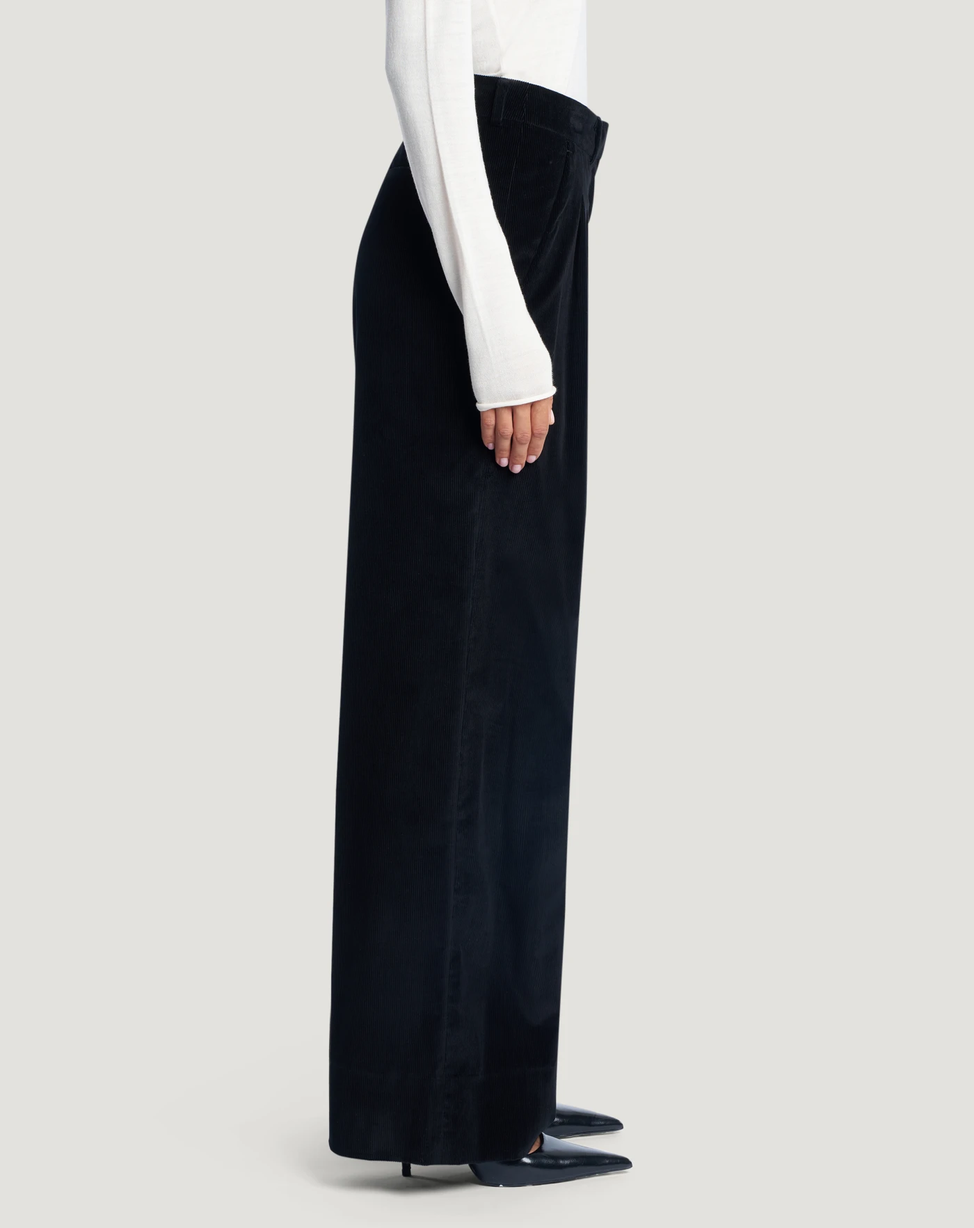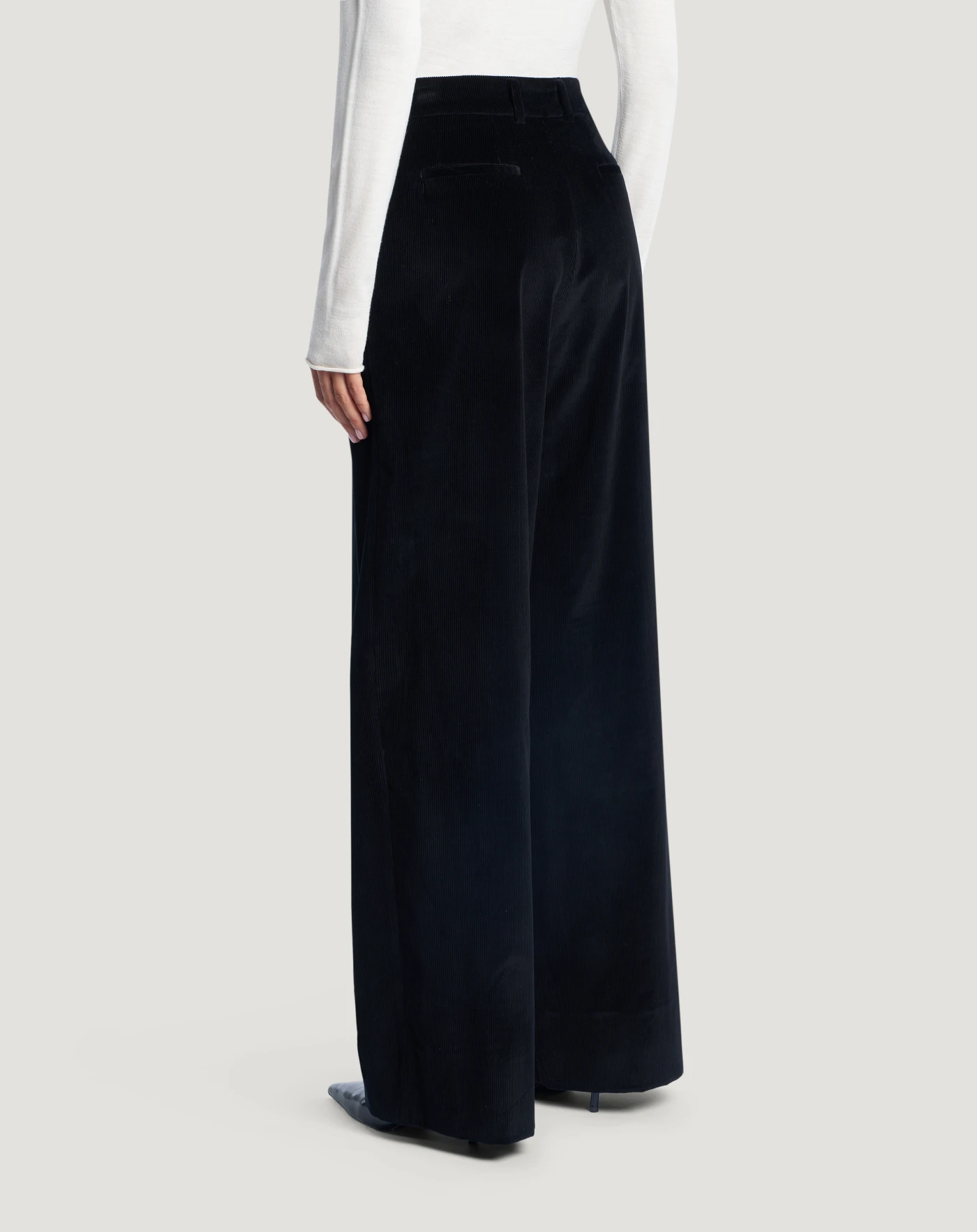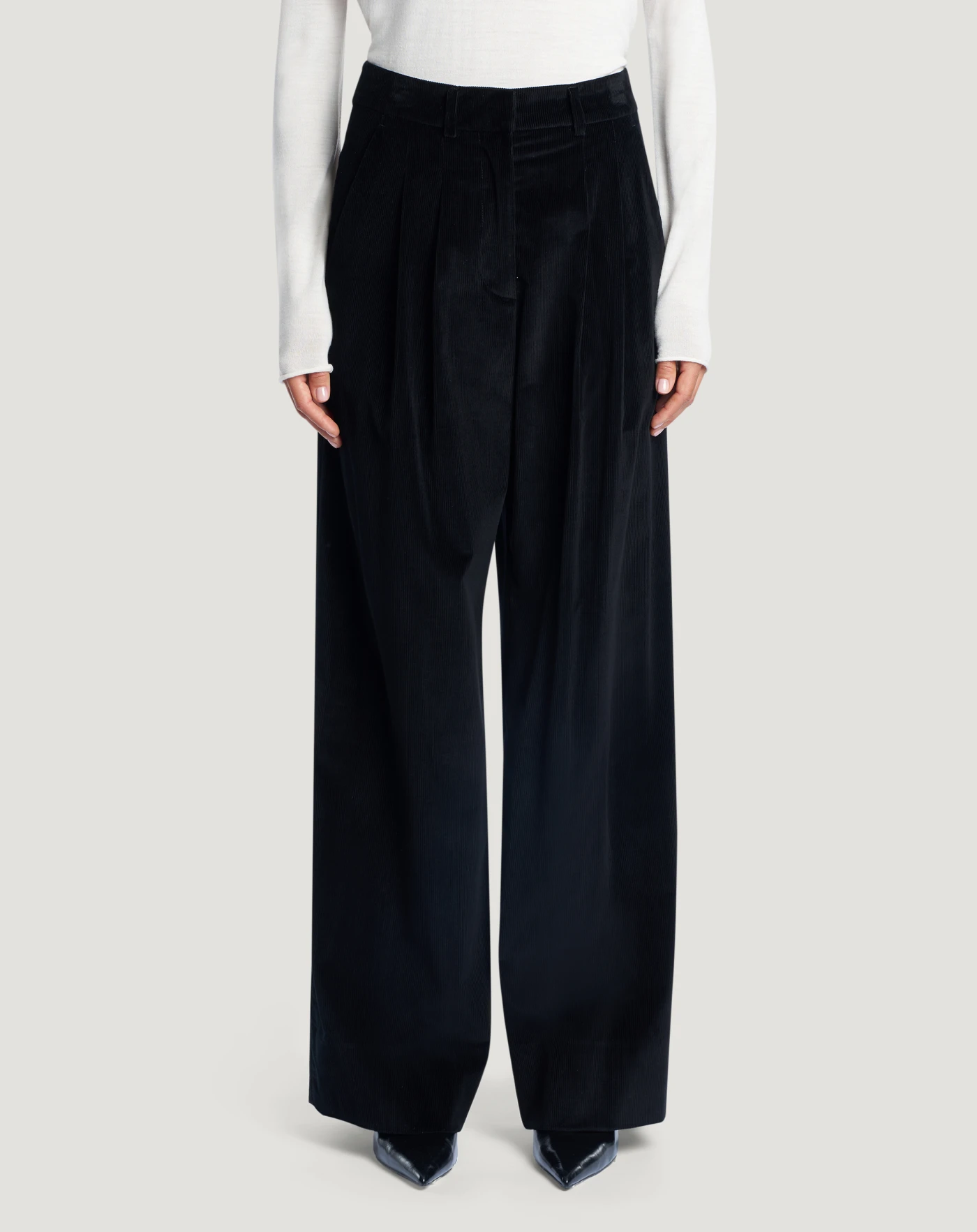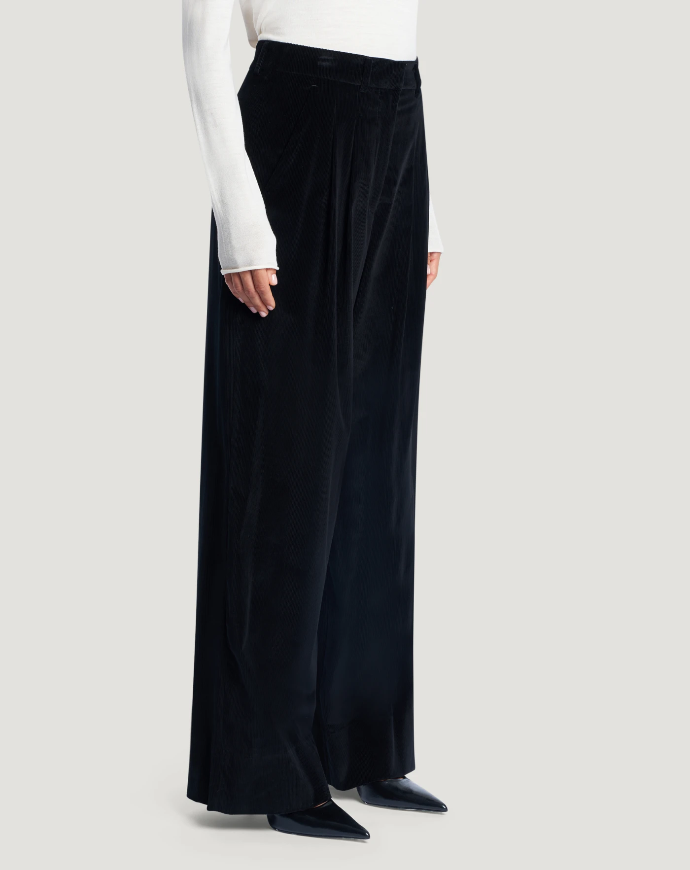 ストレッチが効いたコットン混の細畝コーデュロイ製のパンツです。とても柔らかな手触りと明るいカラーに心奪われる一本です。フロントにタックを入れて動きを出したワイドレッグモデルです。ブラックの色合いは、ルックを旬の雰囲気に仕上げてくれます。