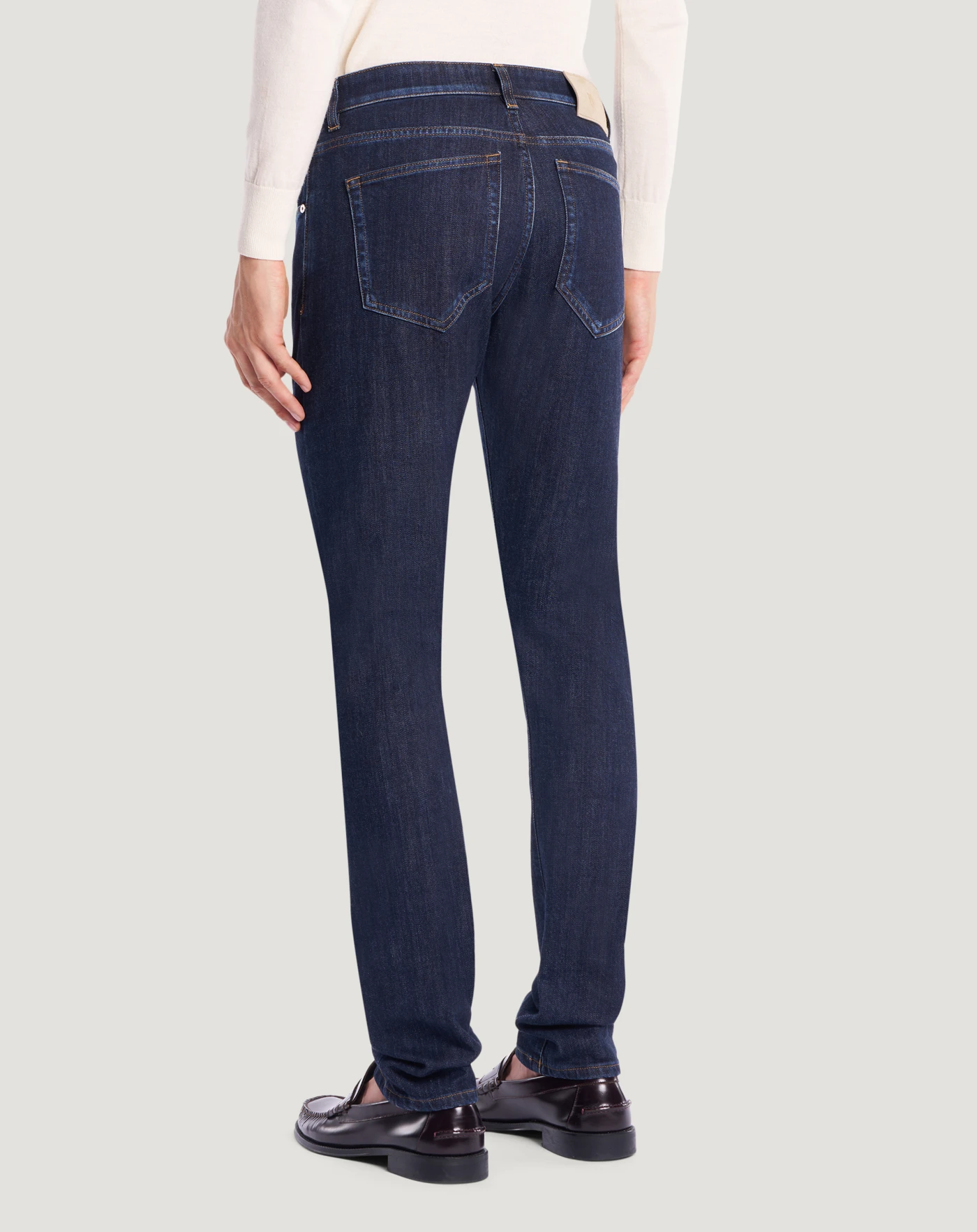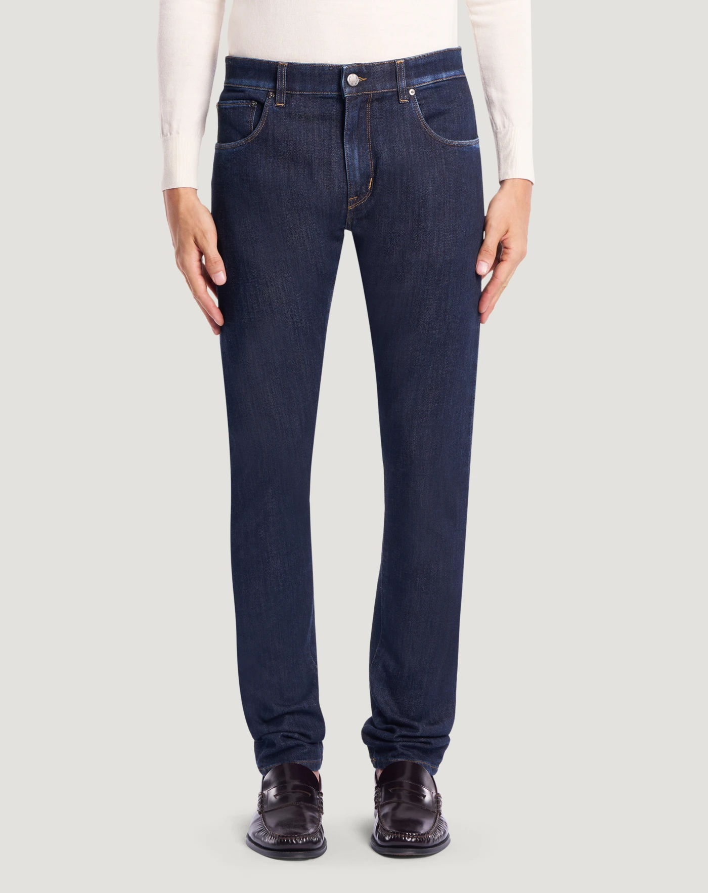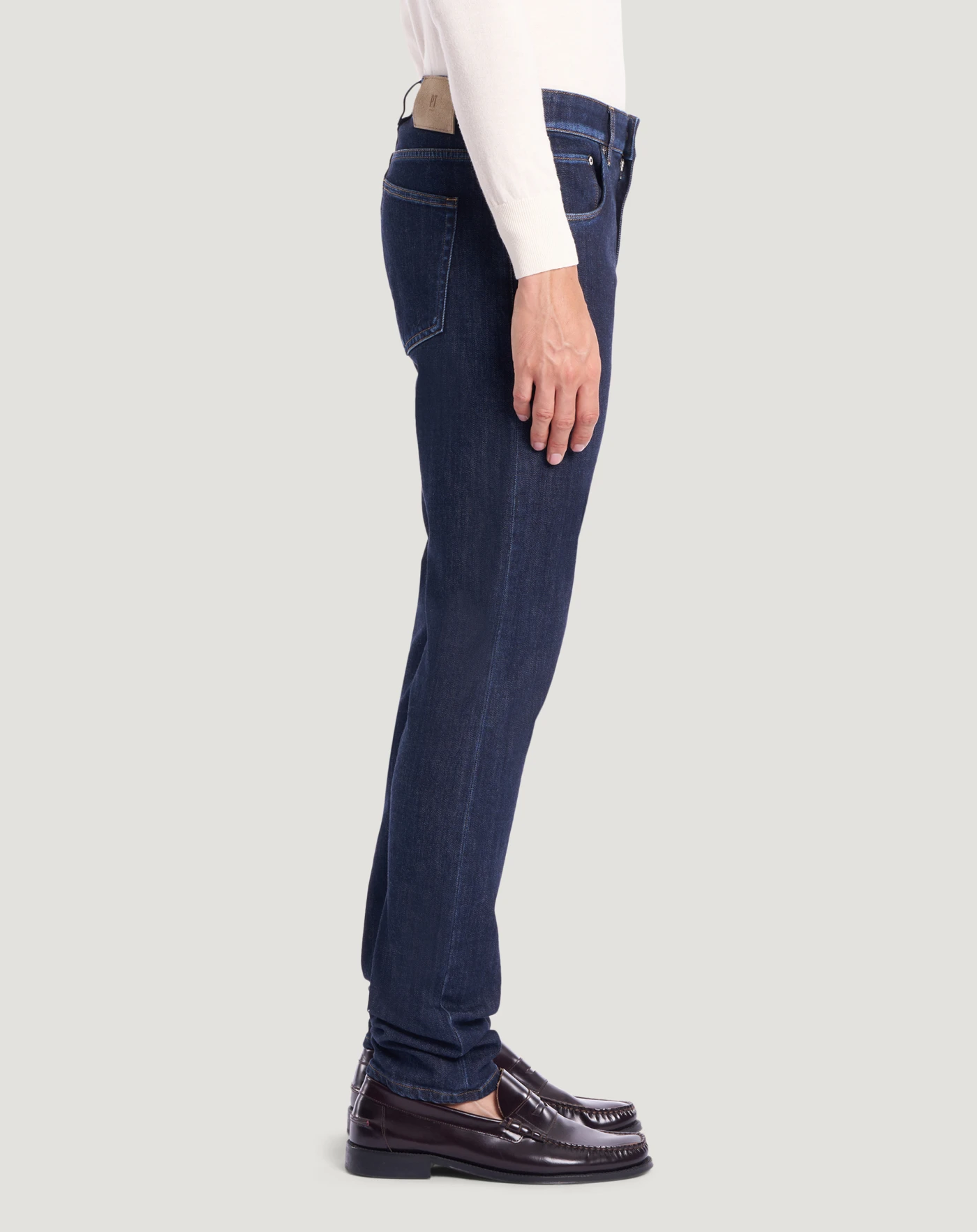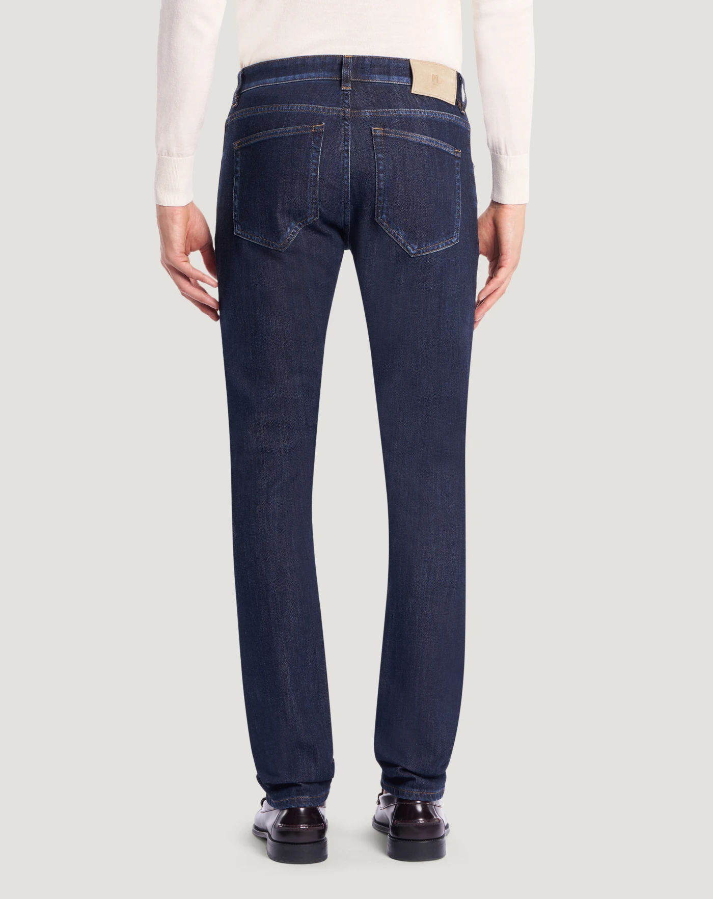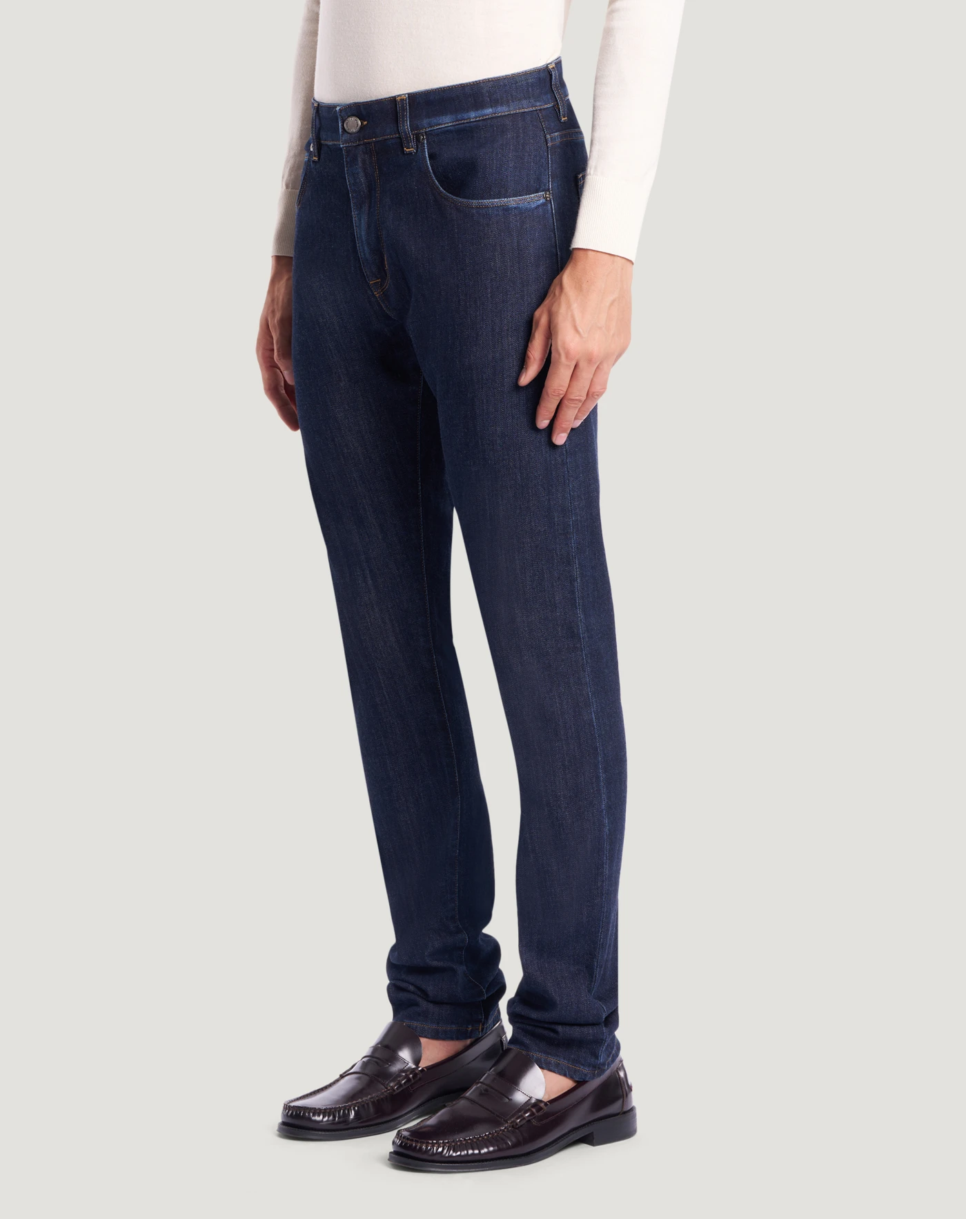コットンとカシミヤ混紡のストレッチデニム製のジーンズです。均一なダークウォッシュ加工を施した柔らかい上質な生地を使用、エレガントなテーラードスタイルのモデルです。レギュラーウエスト、スリムレッグのファイブポケットモデルで、特別な日のルックにも活躍します。