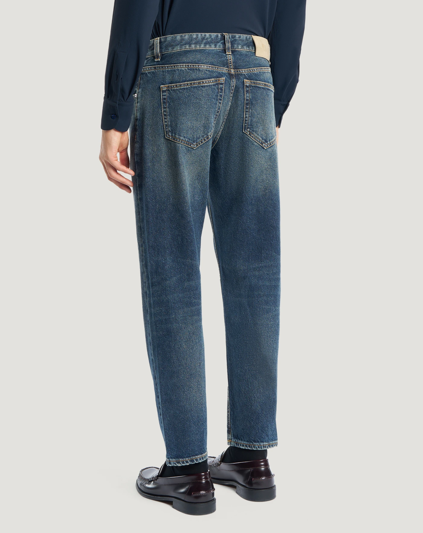 ノンストレッチの快適で丈夫なピュアコットンデニム製(11.5オンス)のジーンズです。マーブル模様のようなウォッシュ加工、タバコ色のステッチが特徴のデザインです。テーパードレッグ、レギュラーウエスト、裾を折り返したモデルで、カジュアルな装いを個性的に仕上げるのに最適です。