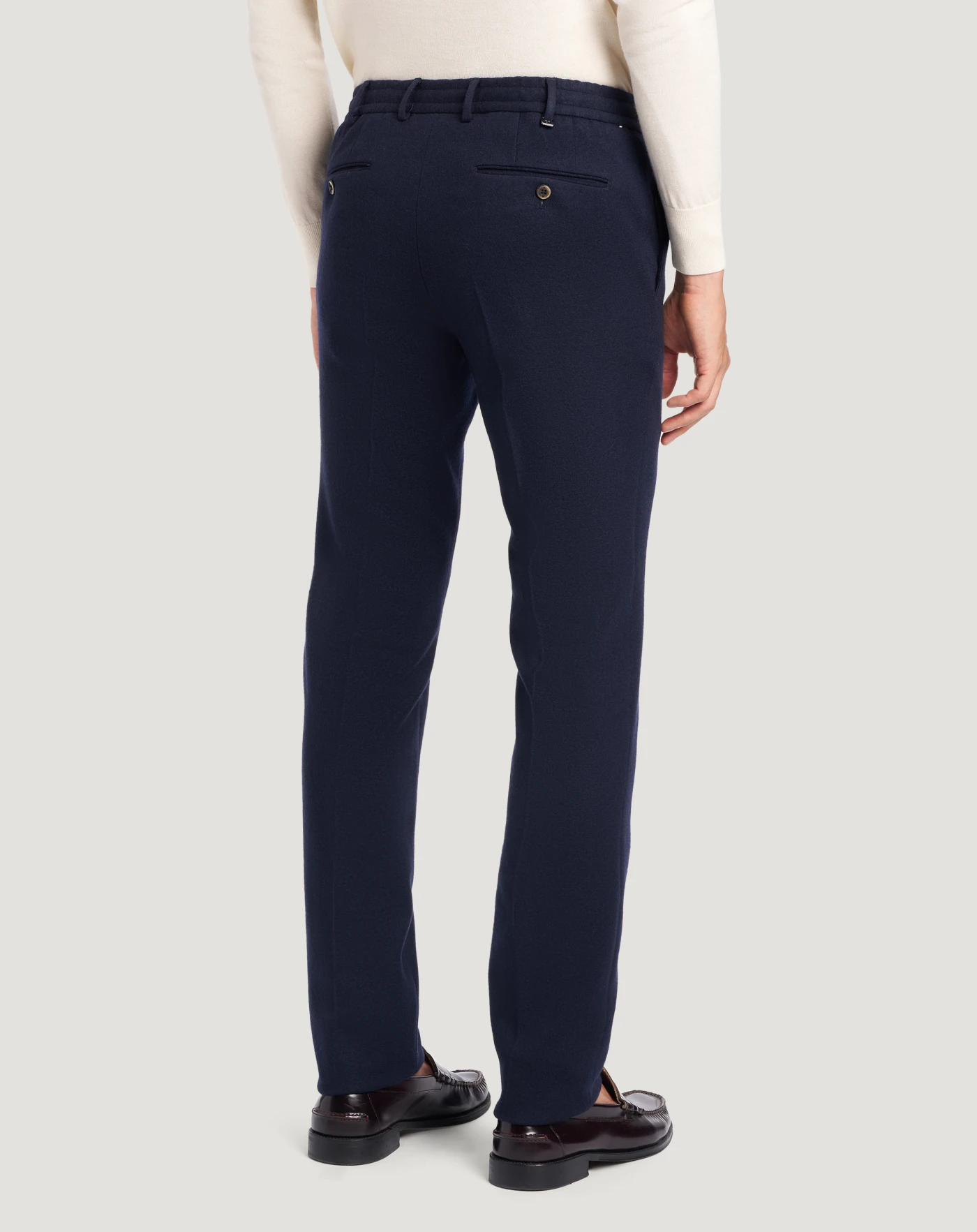 Trousers in deluxe wool jersey with a soft, enveloping feel that guarantees elegance without constraints.The garment is delivered unstitched, so that it can be finished to suit your length and style through simple tailoring. With a smooth front and elasticated drawstring waist, they combine practicality and style.