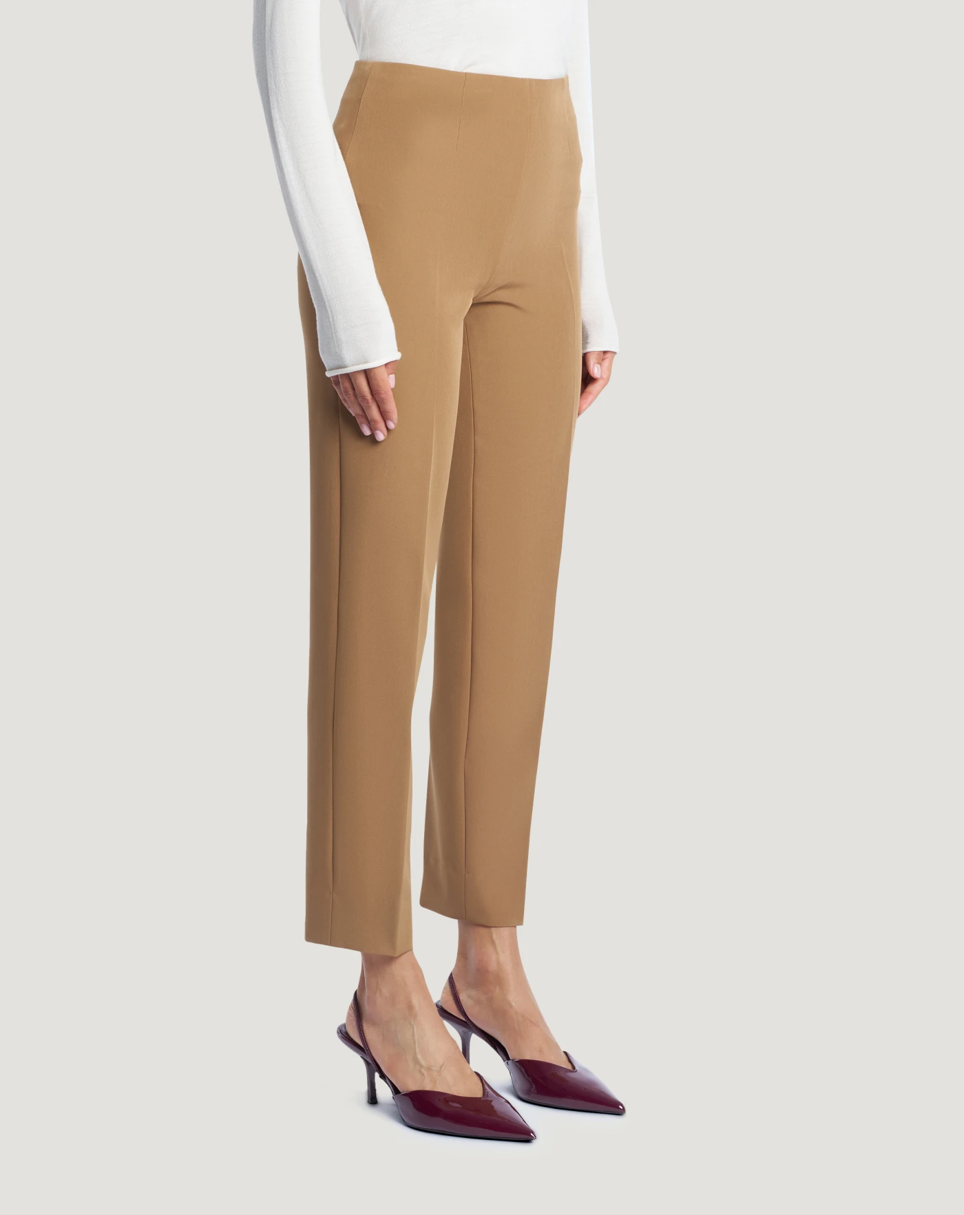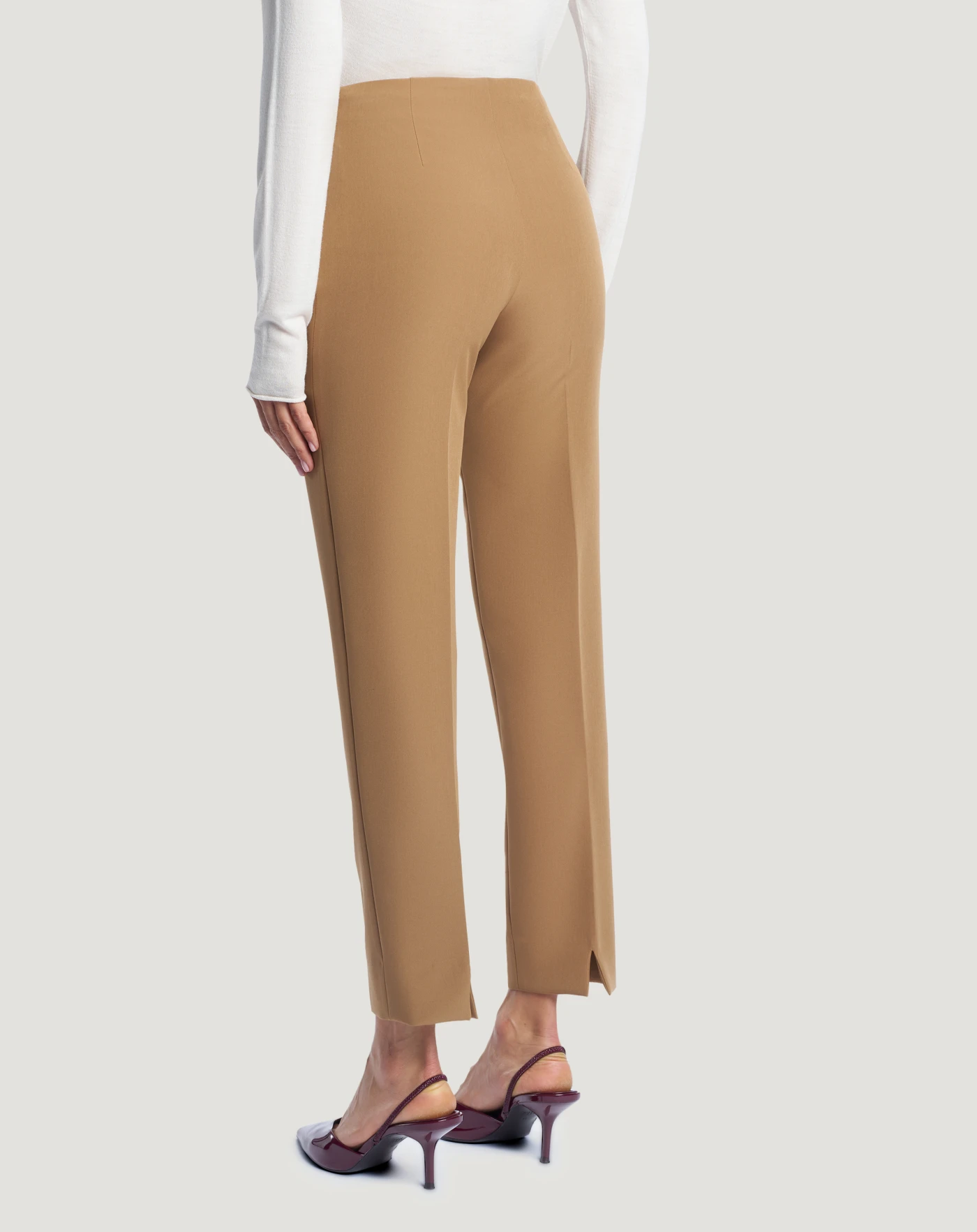 Trousers in fluid stretch tricotine, a very soft fabric that’s pleasant to the touch and combines durability with elasticity.Featuring a high waist, skinny fit and the leg ends are slit at the back, a modern and elegant detail. In the honey variant for refined daytime or office looks.
