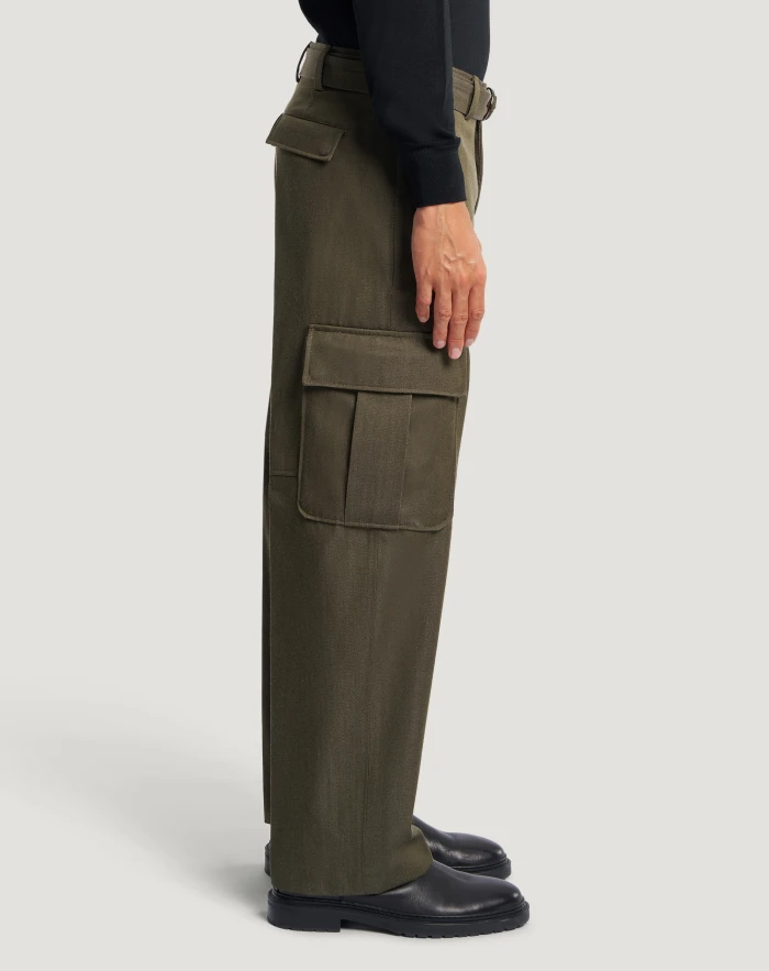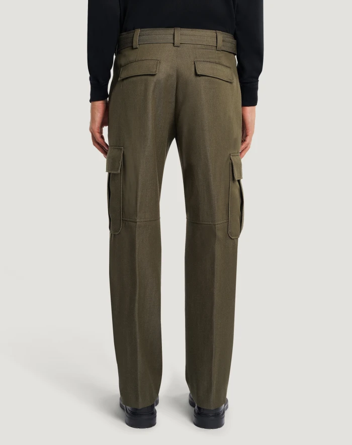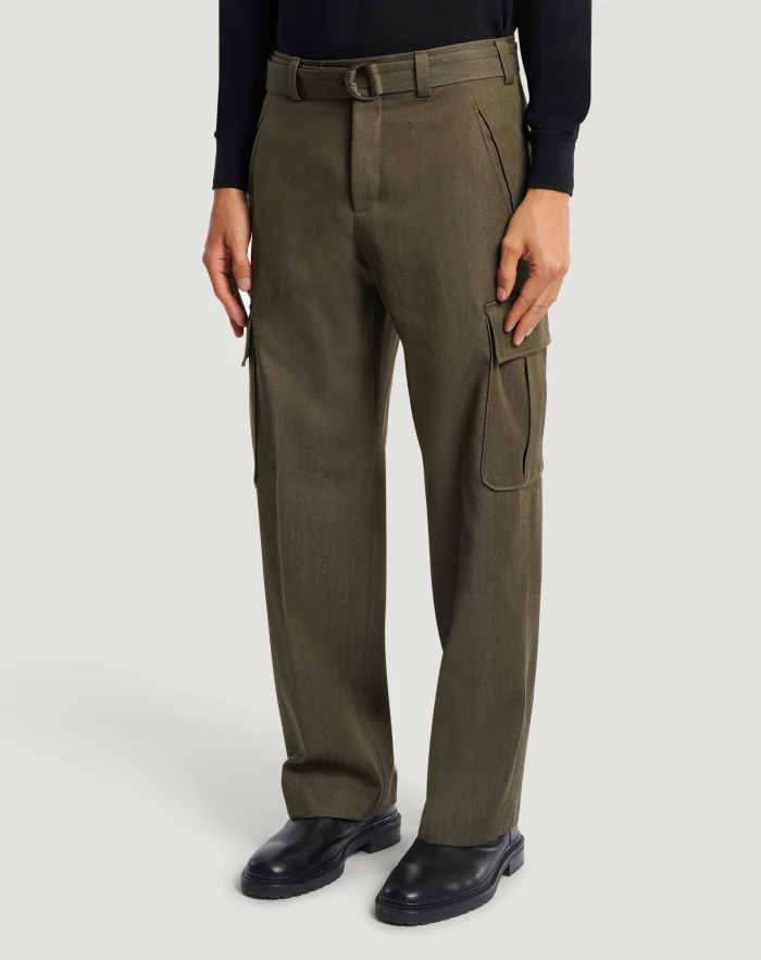 Trousers in wool and cotton, a refined, durable and contemporary fabric with a denim effect.Unique design with a straight fit, cargo pockets at the sides and matching belt that instantly elevate your style. Wear them with the matching jacket.