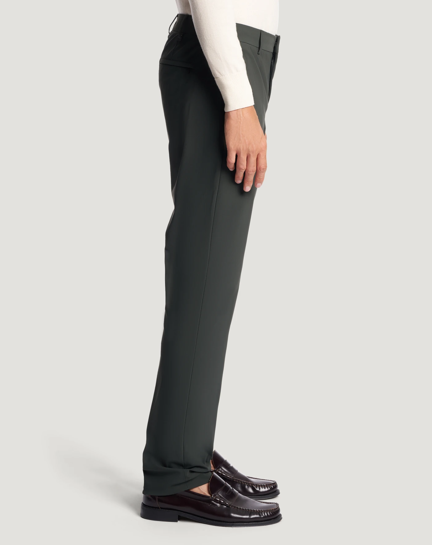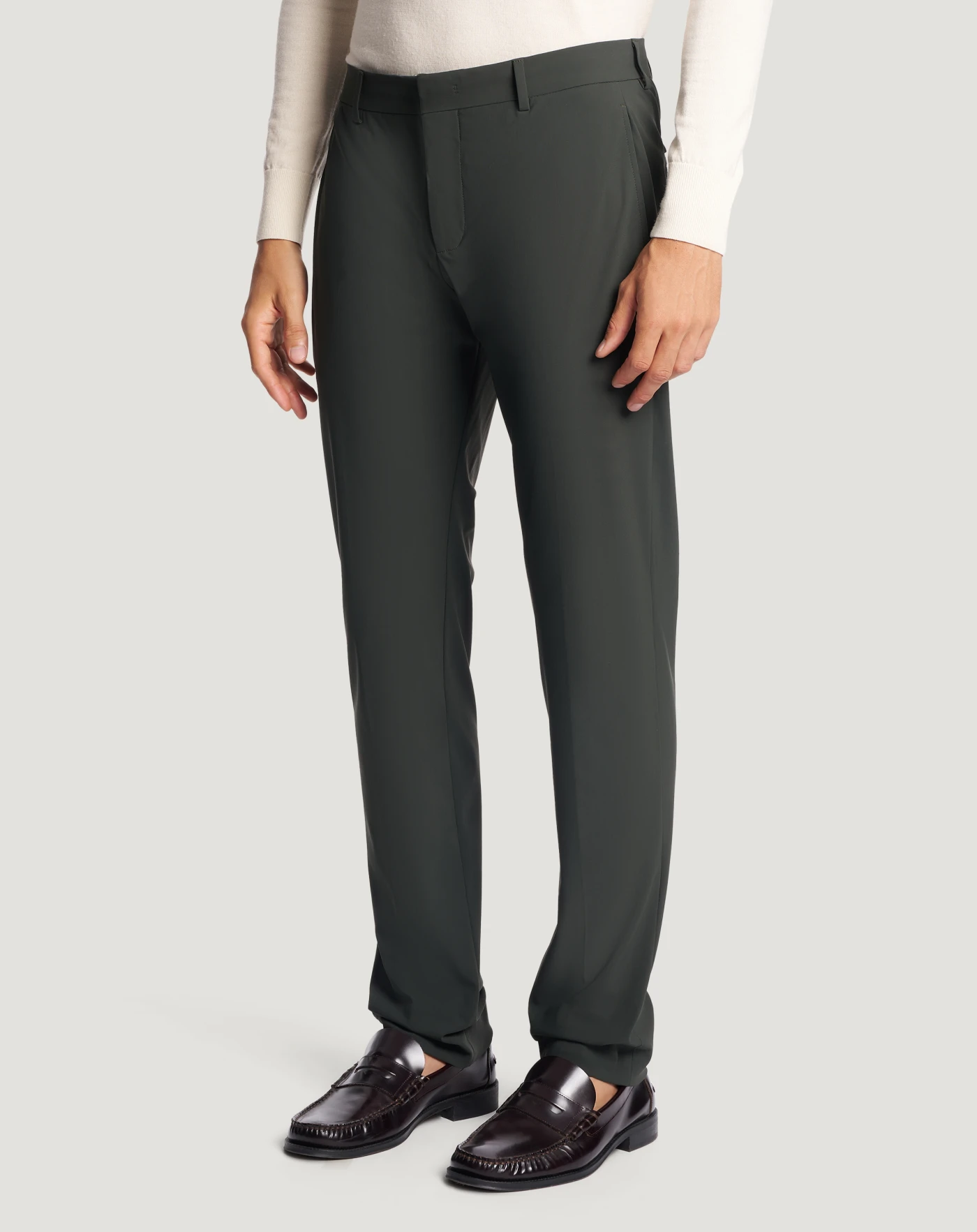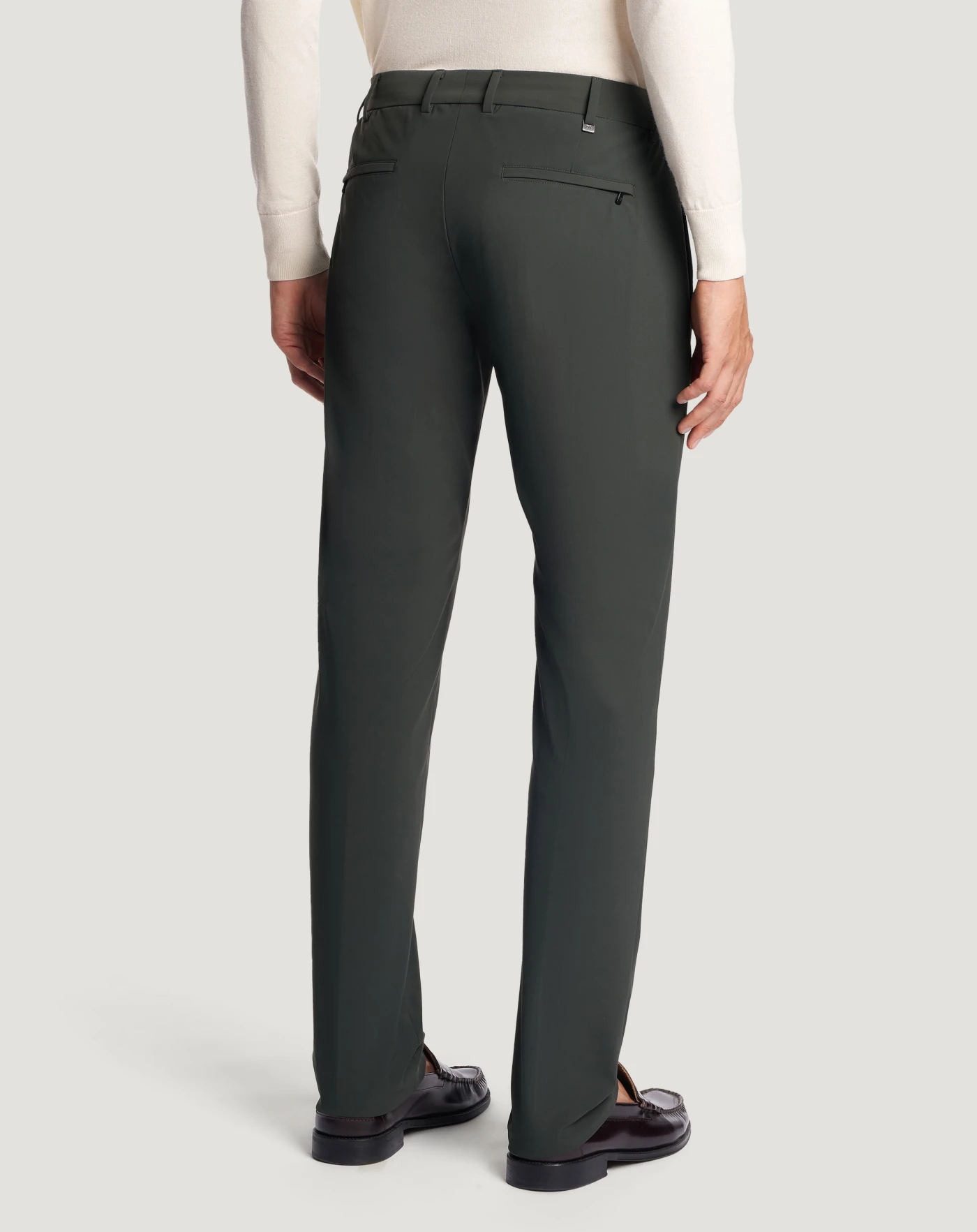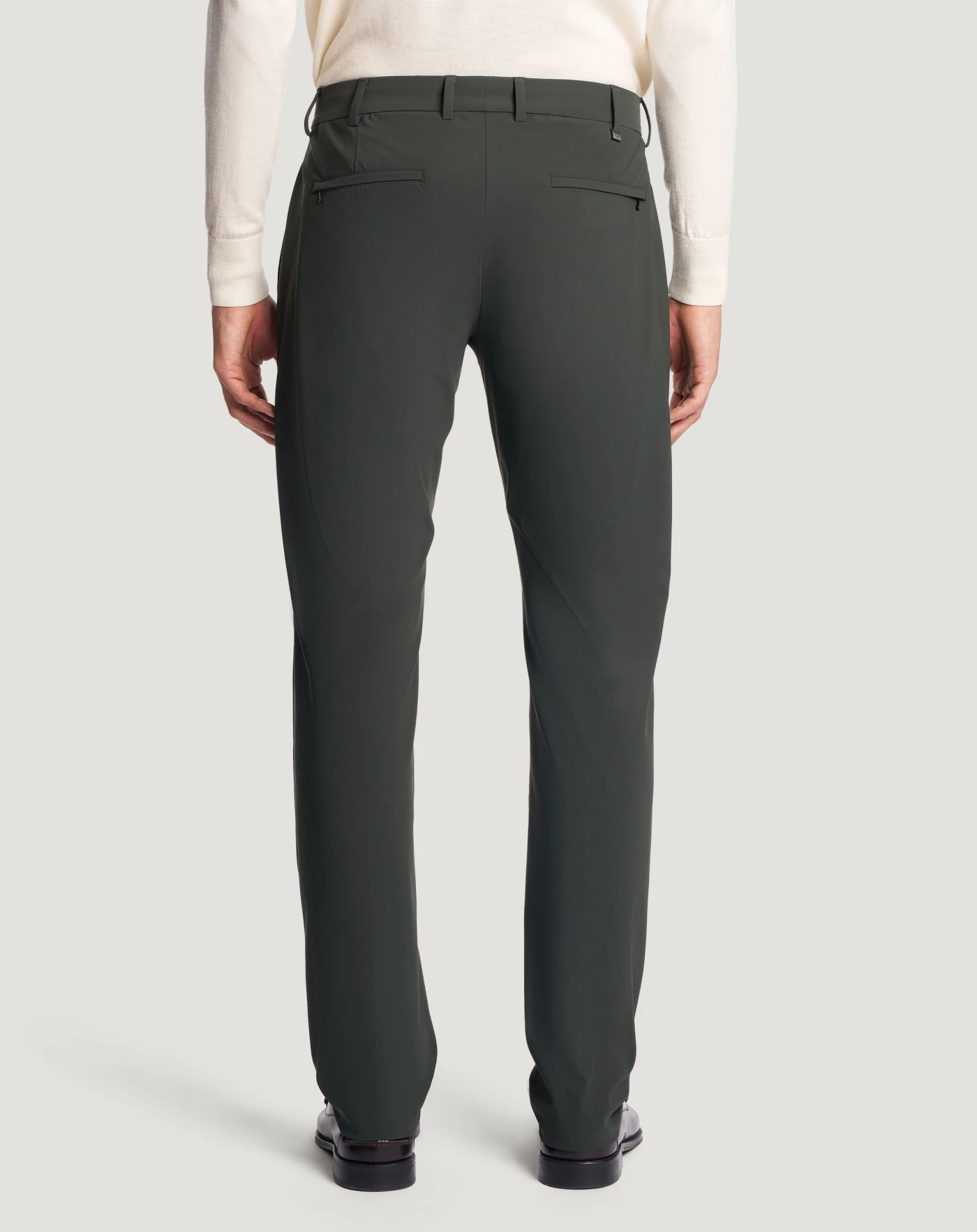 Trousers in kinetic stretch jersey, a compact and fluid knitted fabric with an elasticated structure that naturally follows the body's movements.With a slim fit, smooth front, zipped pockets at the back for an ankle-length tailored model with refined details.