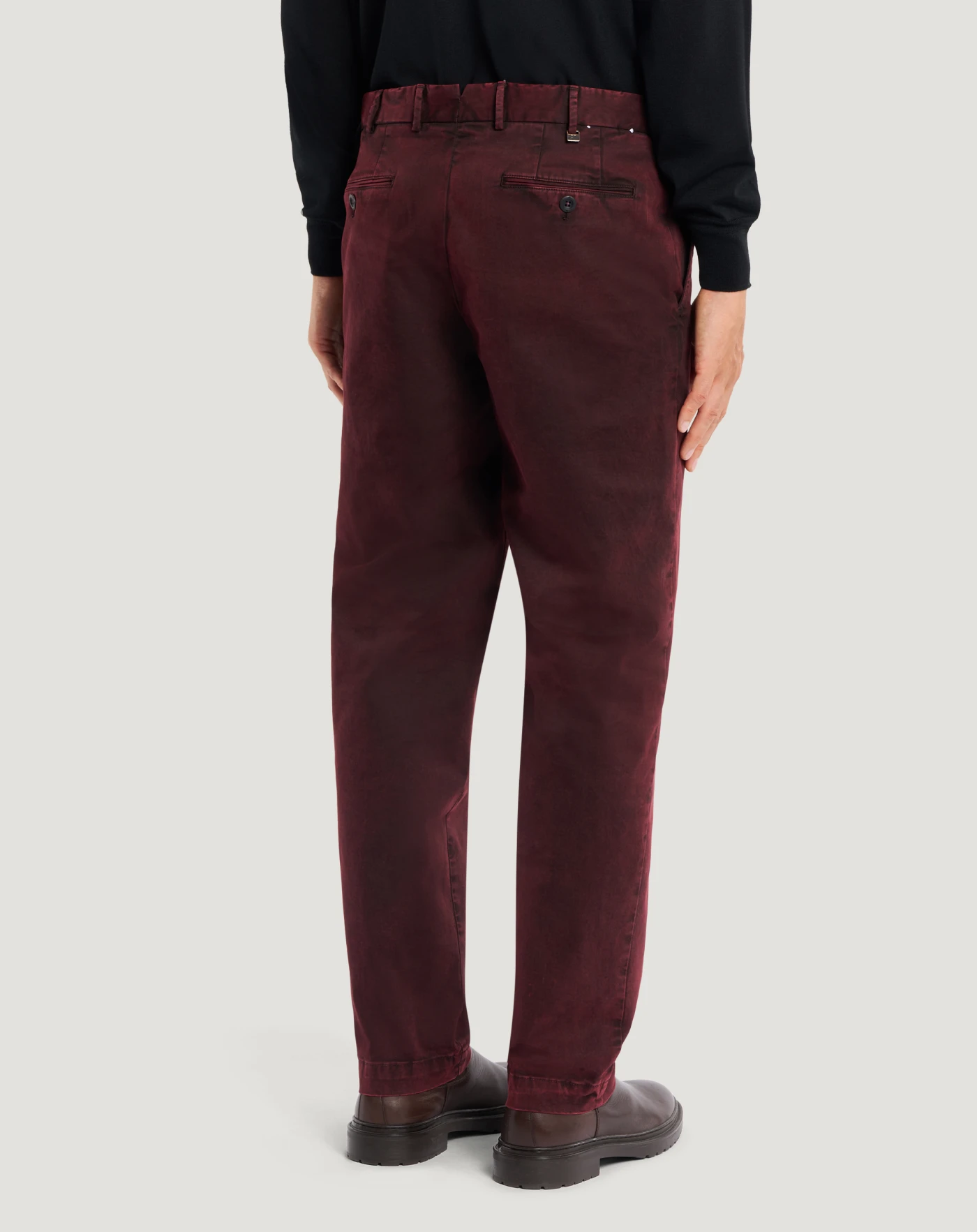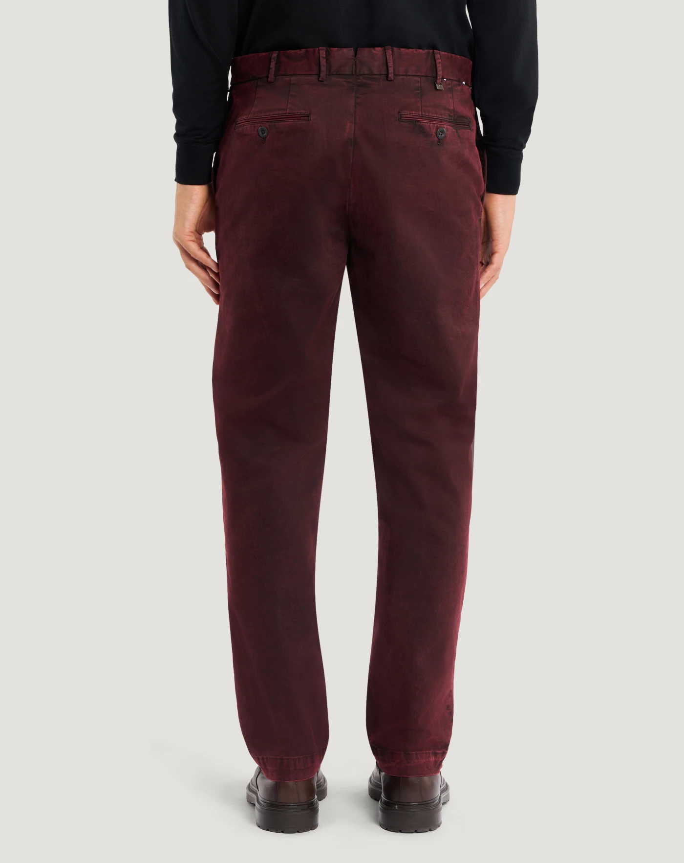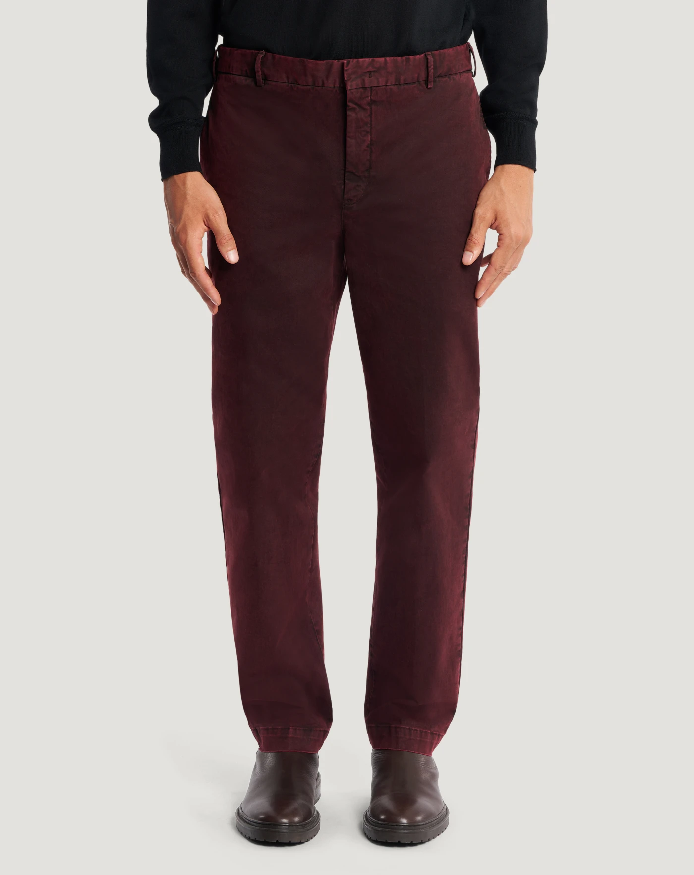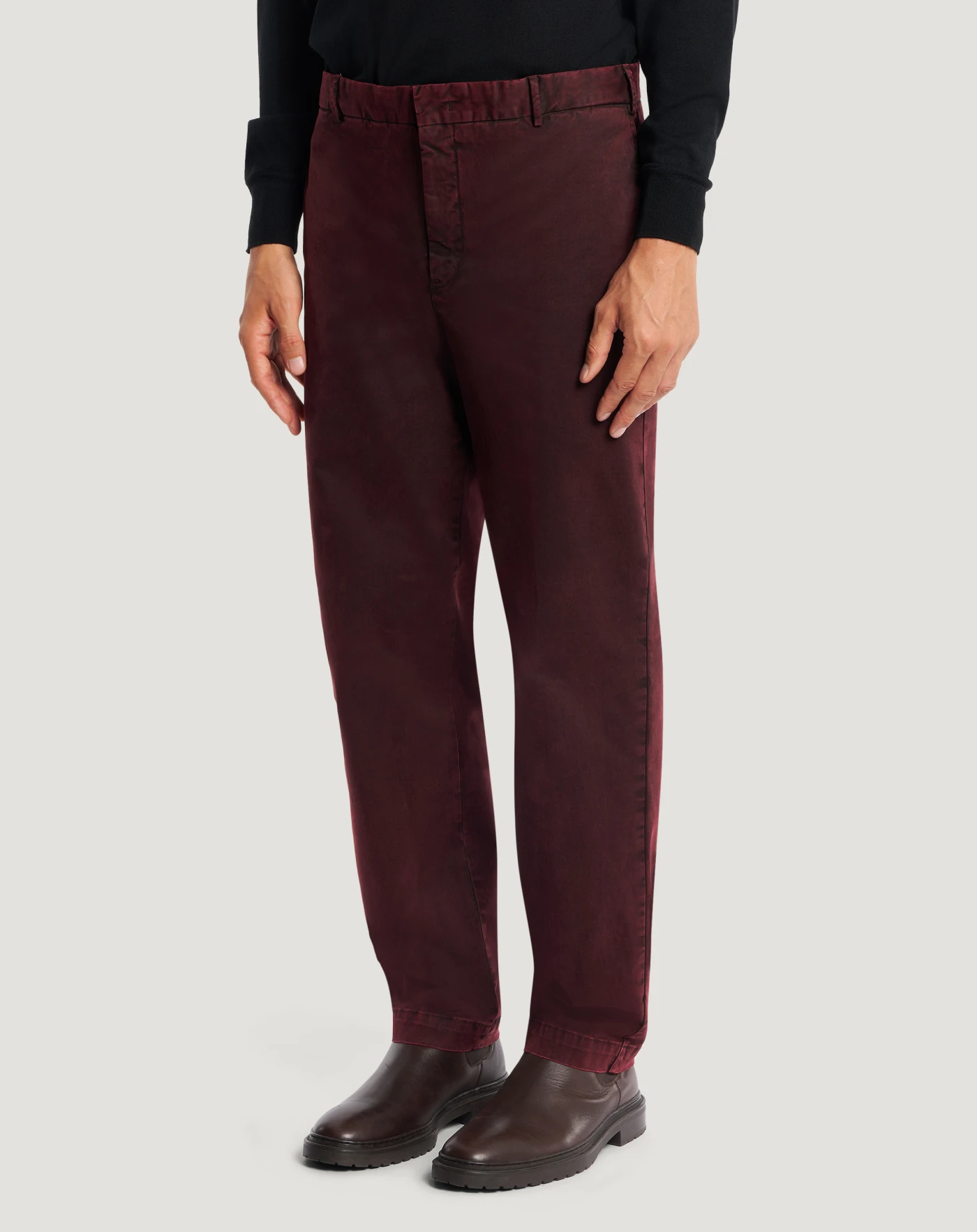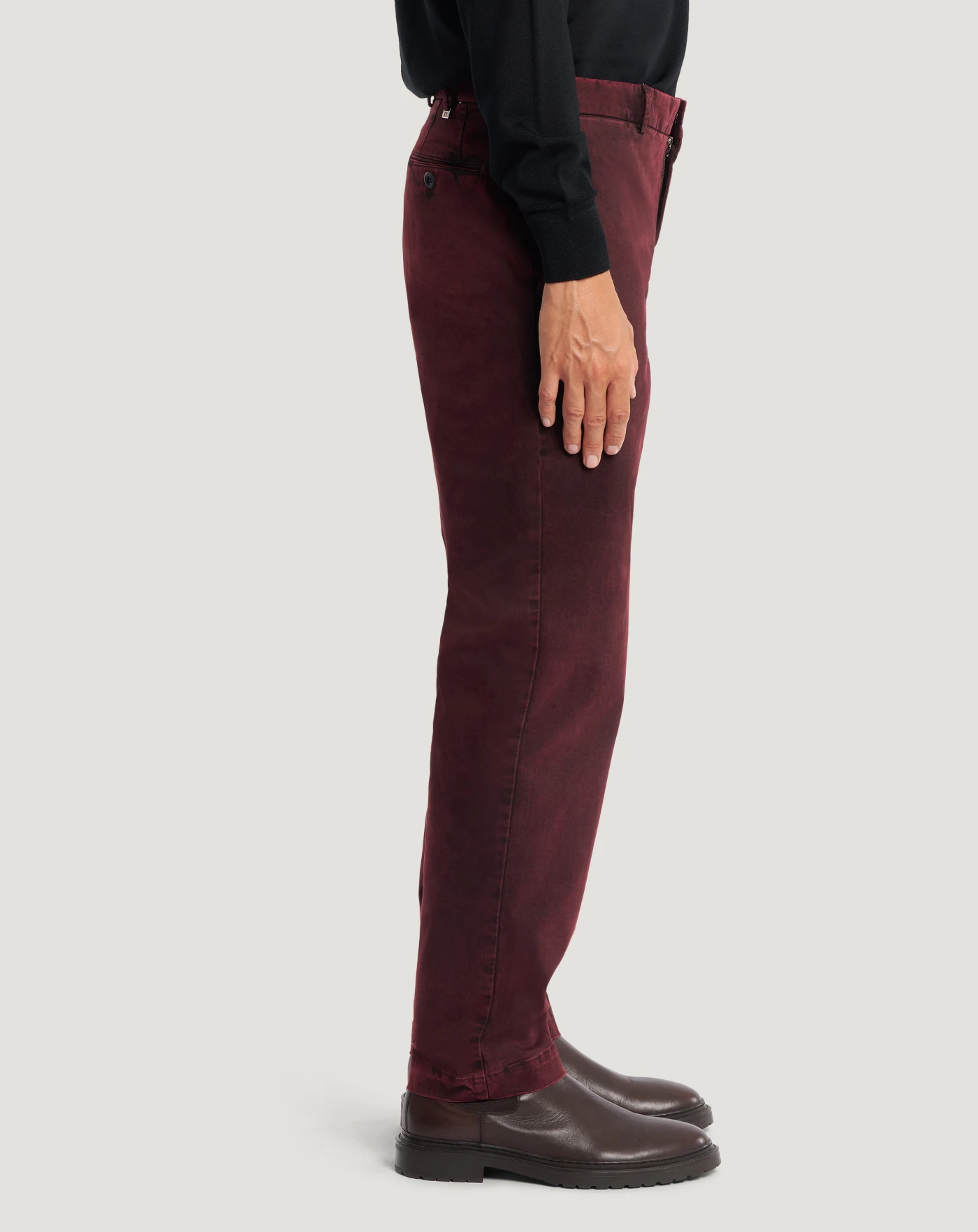 Trousers in compact stretch gabardine, with a smooth, even texture. Thanks to the compact yarn and the addition of stretch fibres, it combines elegance and comfort in a technical yet refined fabric. With a carrot fit and pressed crease, they feature a modern and versatile look. In the burgundy variant, to add a sophisticated chromatic note to your style.