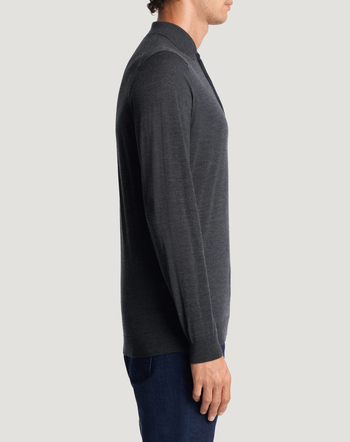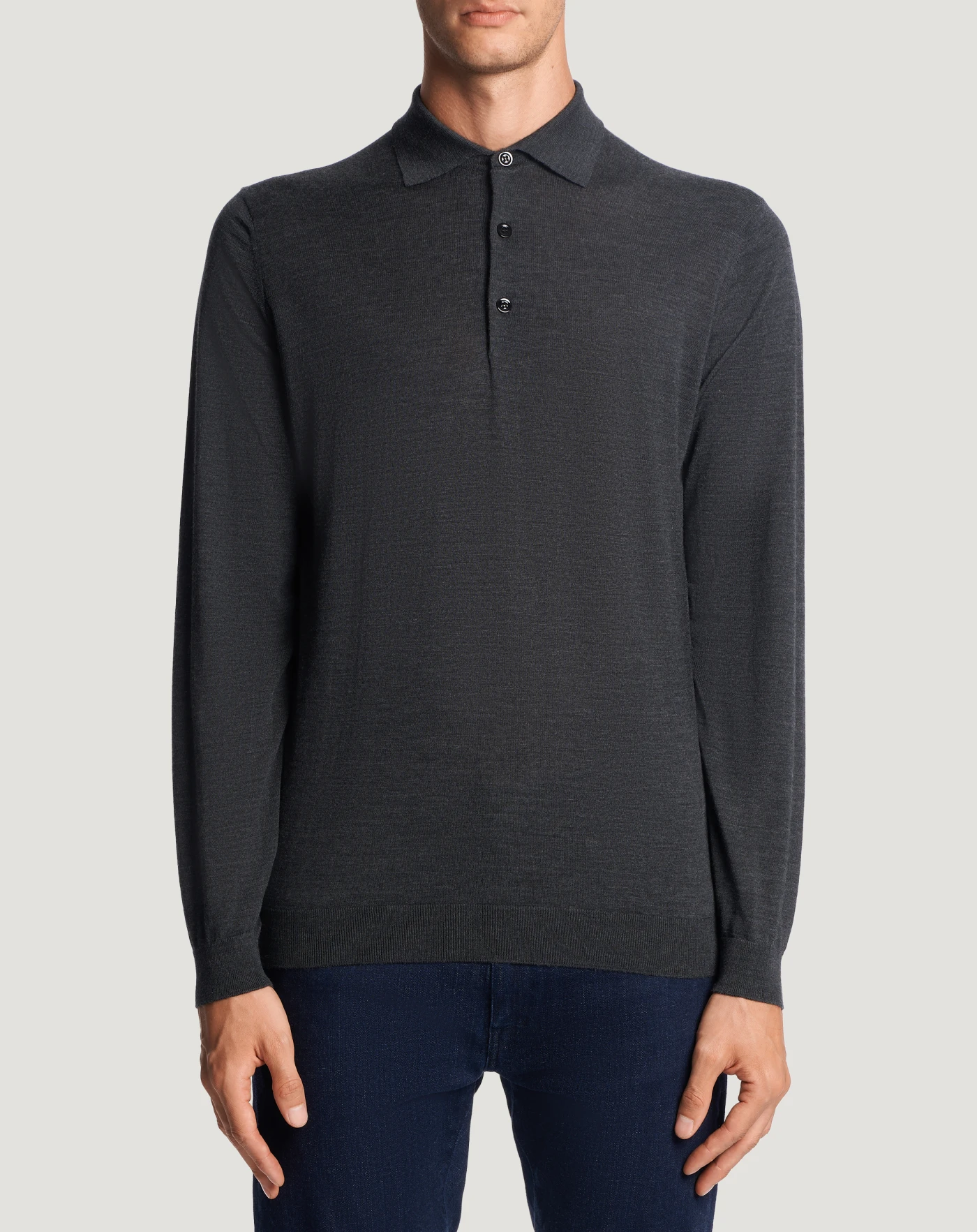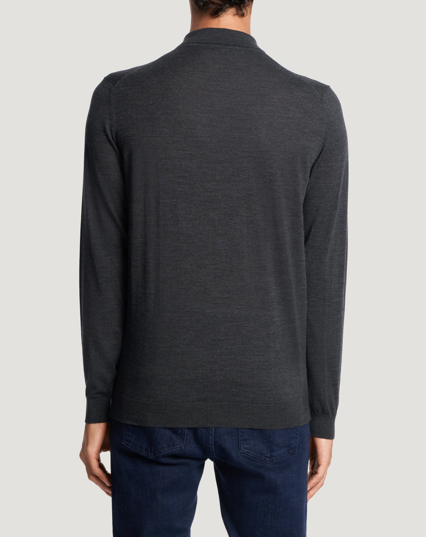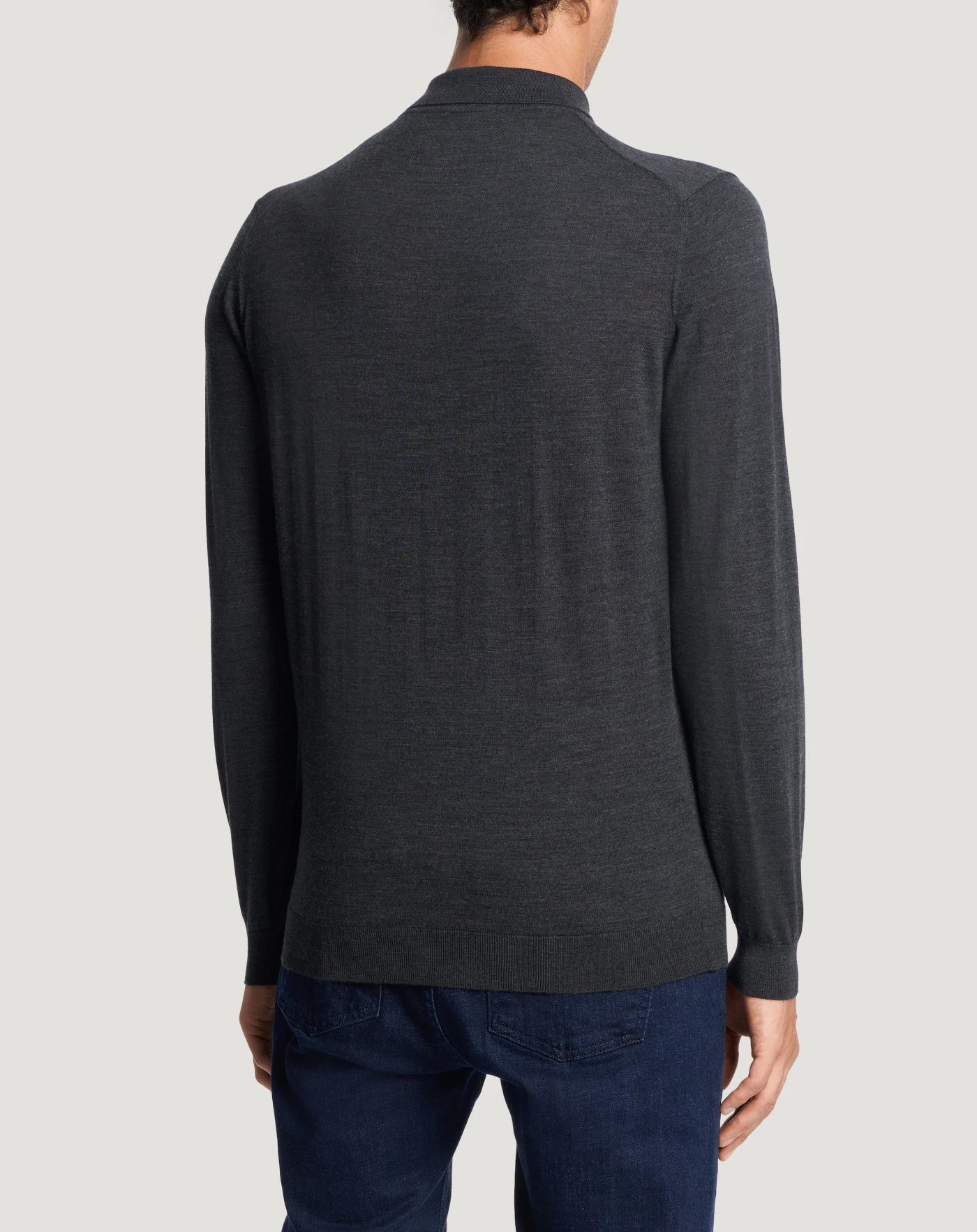Polo neck jumper in pure Super 180 wool, impalpably refined and with fineness of 16, for a very light and comfortable garment.With collar and buttons, its essential and versatile design and slim fit can complete formal and casual looks. In the grey variant for effortless elegance.