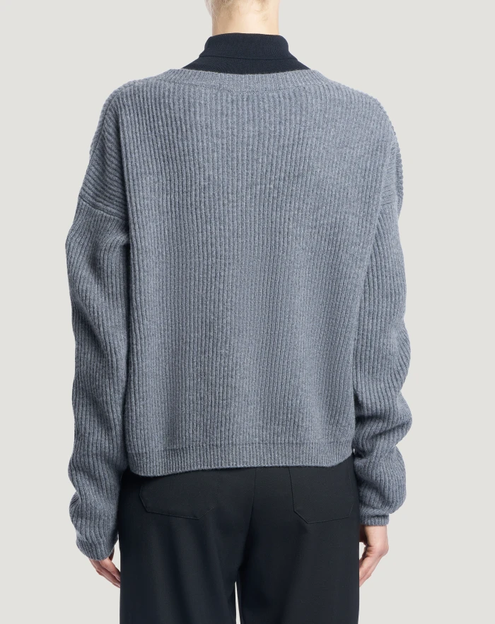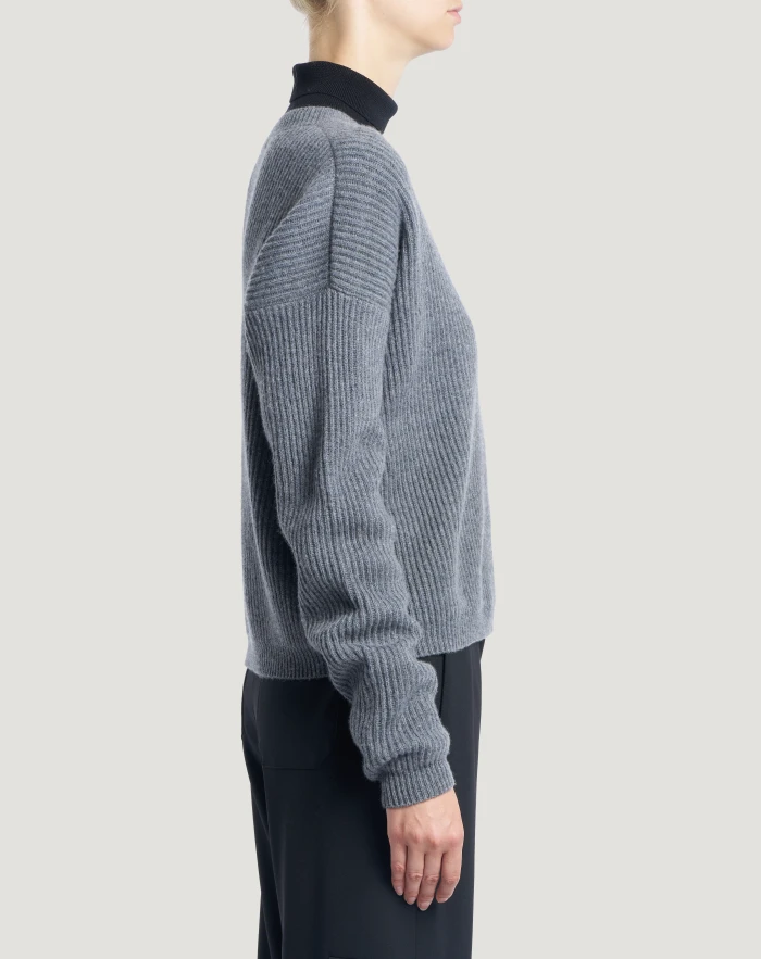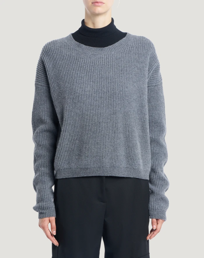 Fisherman’s rib jumper in wool and cashmere tricot, a soft and refined yarn.Boxy fit, round neck and dropped shoulders for a versatile model suitable for any occasion. In grey to enhance any outfit.