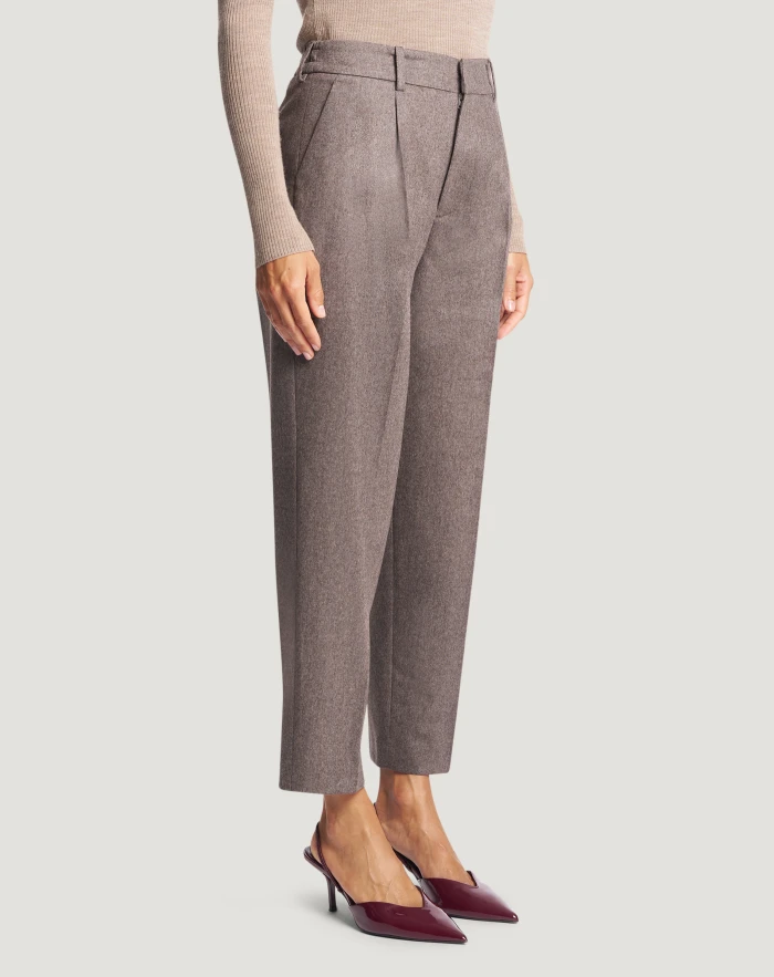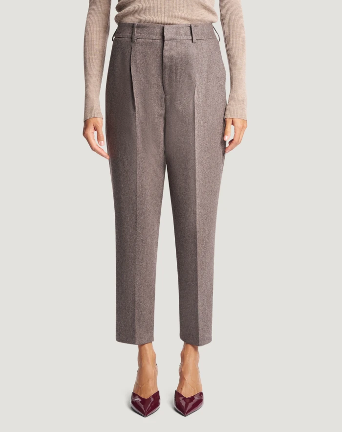 Trousers in wool and cashmere flannel, a soft, warm fabric that will complete seasonal looks to perfection.With pleats at the front and elasticated back, the dove grey variant will brighten up an elegant style.