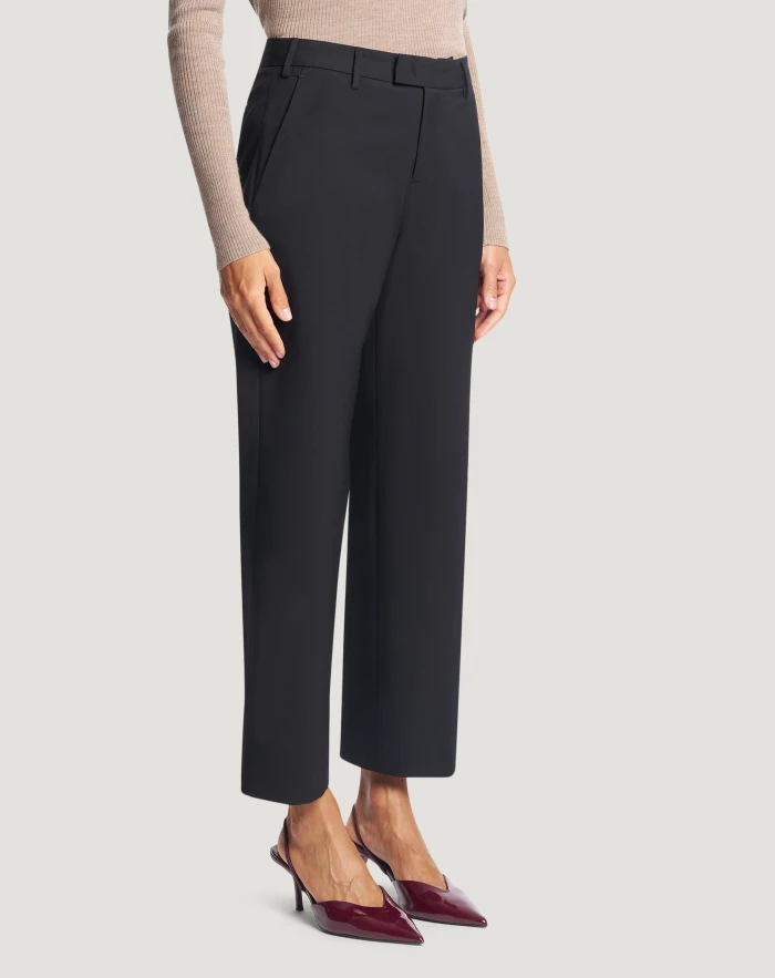 Trousers in bi-stretch Batavia wool, a fabric distinguished by a stretch weave that adapts to the body’s movements, ensuring a look that is both elegant and comfortable yet lightweight.With their straight, slim fit, choose the black variant for a versatile all-rounder in your wardrobe. Wear them with a matching jacket.