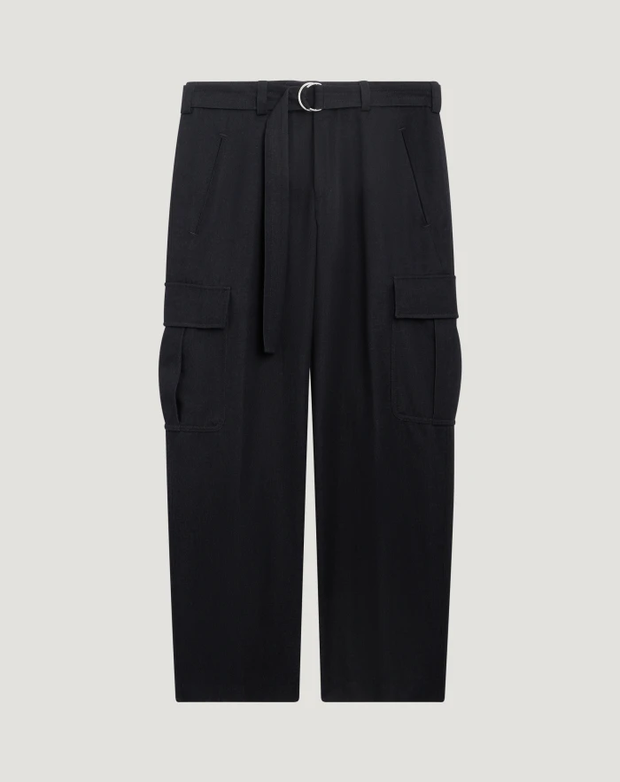 Trousers in wool and cotton, a refined, durable and contemporary fabric with a denim effect.Unique design with a straight fit, cargo pockets at the sides and matching belt that instantly elevate your style. Wear them with the matching jacket.