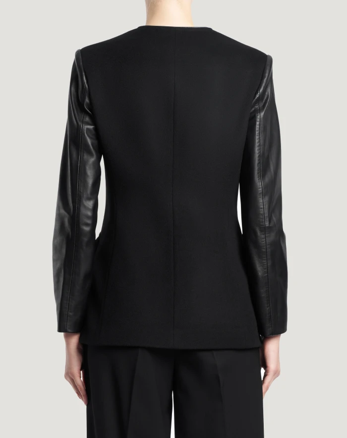 Jacket in wool and cashmere drap, a fine, warm and comfortable fabric. The nappa leather sleeves give the model an urban touch.The slim fit with four patch pockets make it a versatile garment with personality for any occasion.