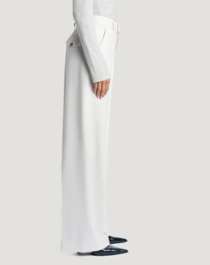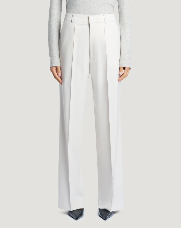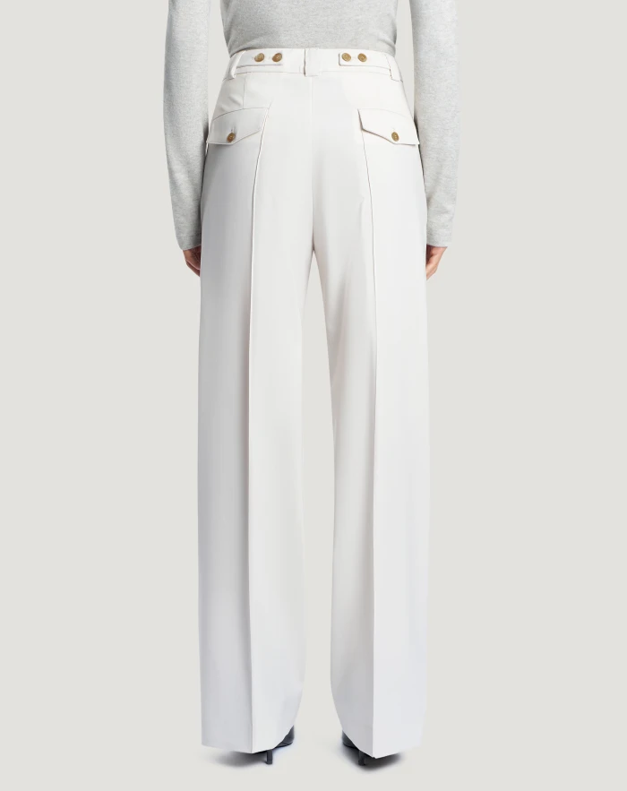 Trousers in bi-stretch Batavia wool, a fabric distinguished by a stretch weave that adapts to the body’s movements, ensuring a look that is both elegant and comfortable yet lightweight.With a straight fit, front pleats and flap pockets at the back, their tailored look instantly elevates your style.