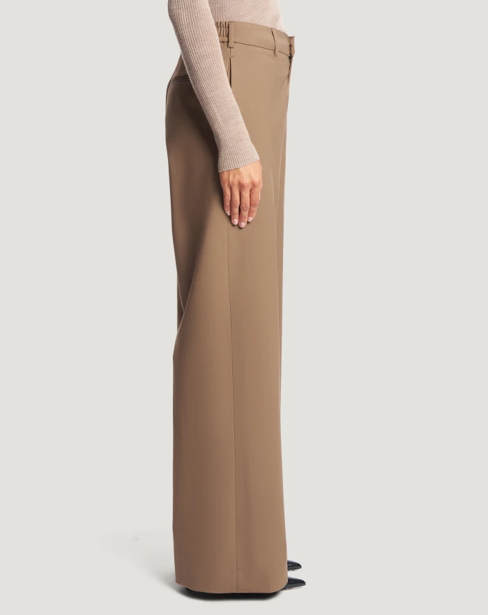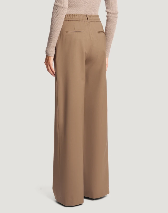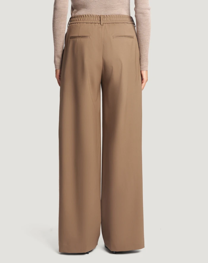 Trousers in bi-stretch Batavia wool, a fabric distinguished by a stretch weave that adapts to the body’s movements, ensuring a look that is both elegant and comfortable yet lightweight.With a relaxed fit and elasticated waist at the back, their style is both tailored and casual. In the brown variant for edgy, elegant looks.