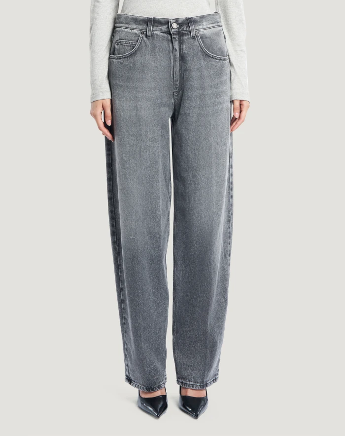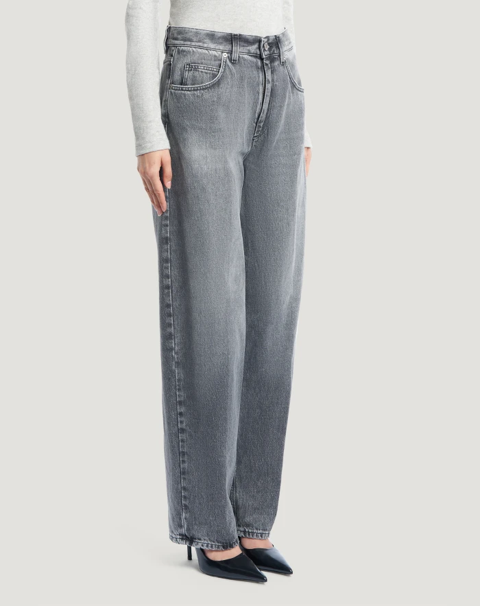 Jeans in black cotton denim, a firm, soft, lightweight (10 oz) fabric that is pleasant to wear and with a grey wash featuring obvious fading.With a high waist and carrot fit, they have a contemporary flair that instantly elevates your style.