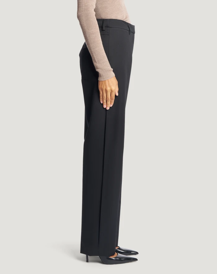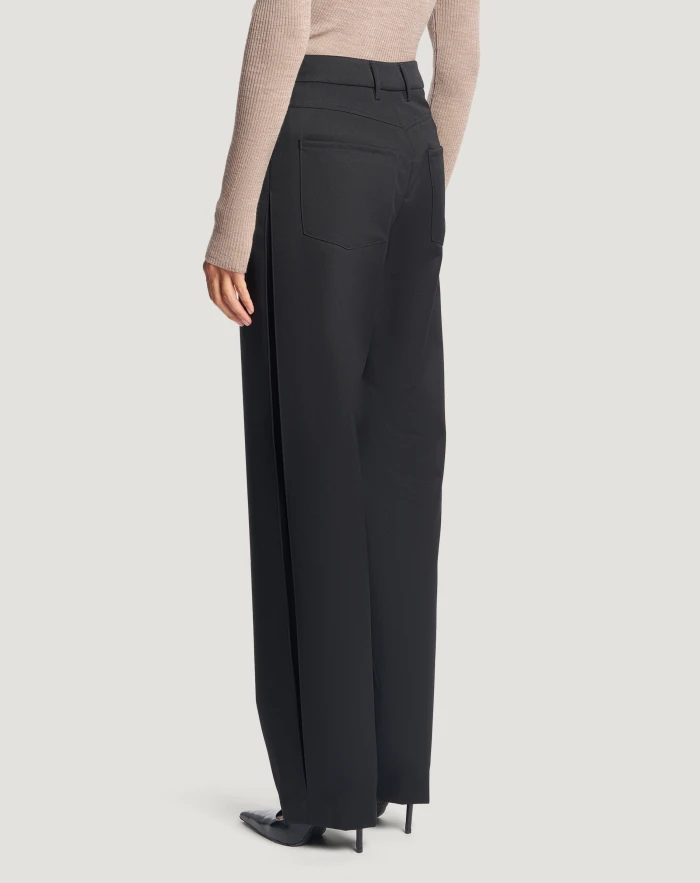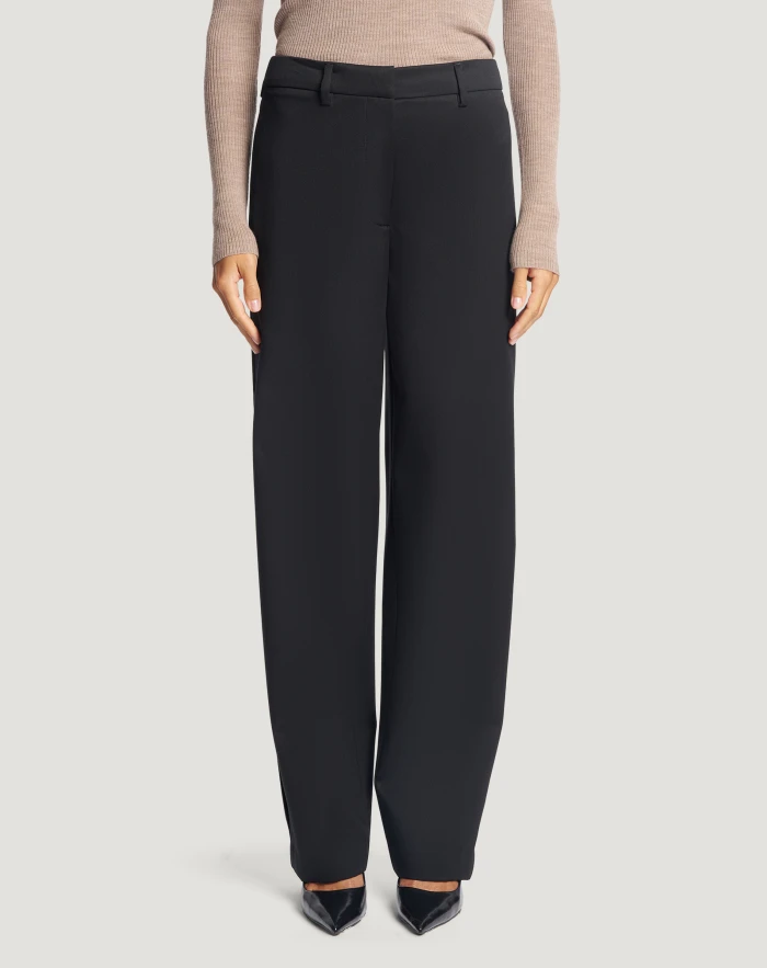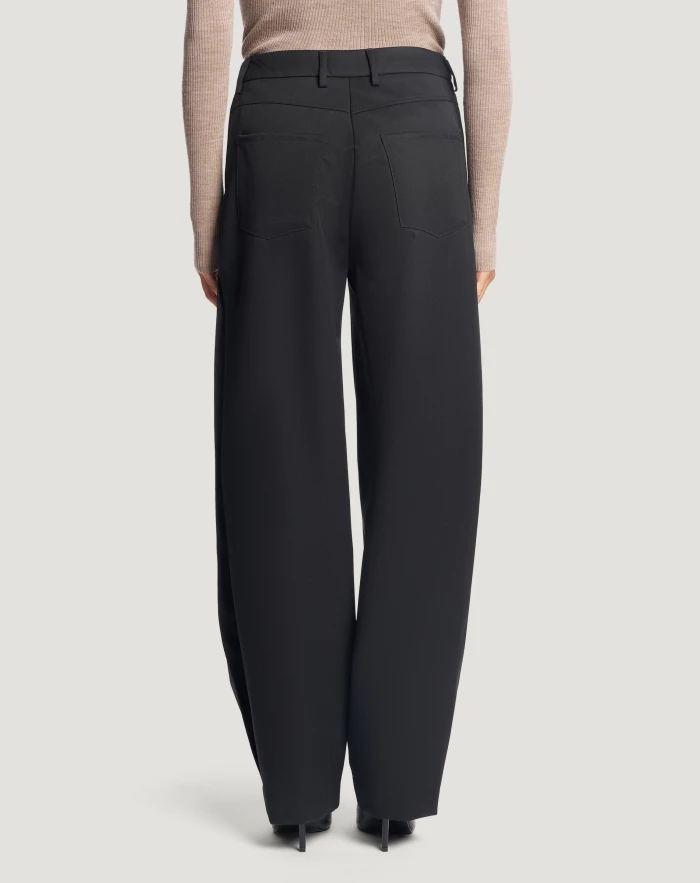 Trousers in double twisted pure wool drill that makes them resistant to tear and wear and has a contemporary, even look.With a wide and relaxed fit, they have inserts at the sides for a unique design. In black for the office and formal occasions.