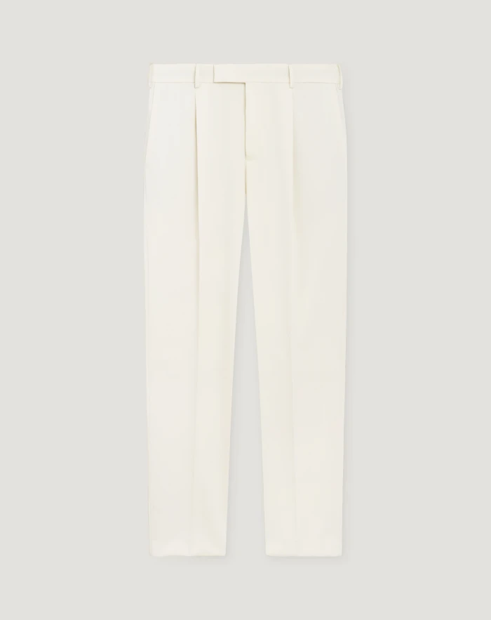 Trousers in double twisted pure wool drill that makes it resistant to tear and wear and has a contemporary, compact look.With a creased front and a wide fit, their design is both refined and elegantly casual.