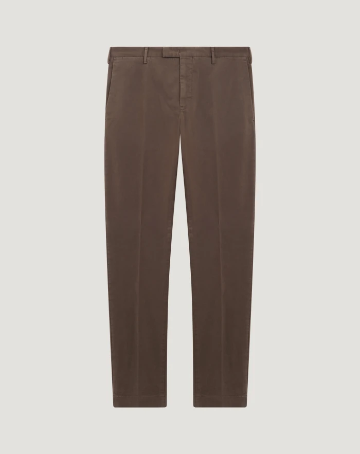 Trousers in stretch cotton winter gabardine with a compact and warm structure. Designed for the cold season, it combines comfort and durability with a soft, enveloping feel.The garment is delivered unstitched, so that it can be finished to suit your length and style through simple tailoring.In the brown variant for refined elegance.