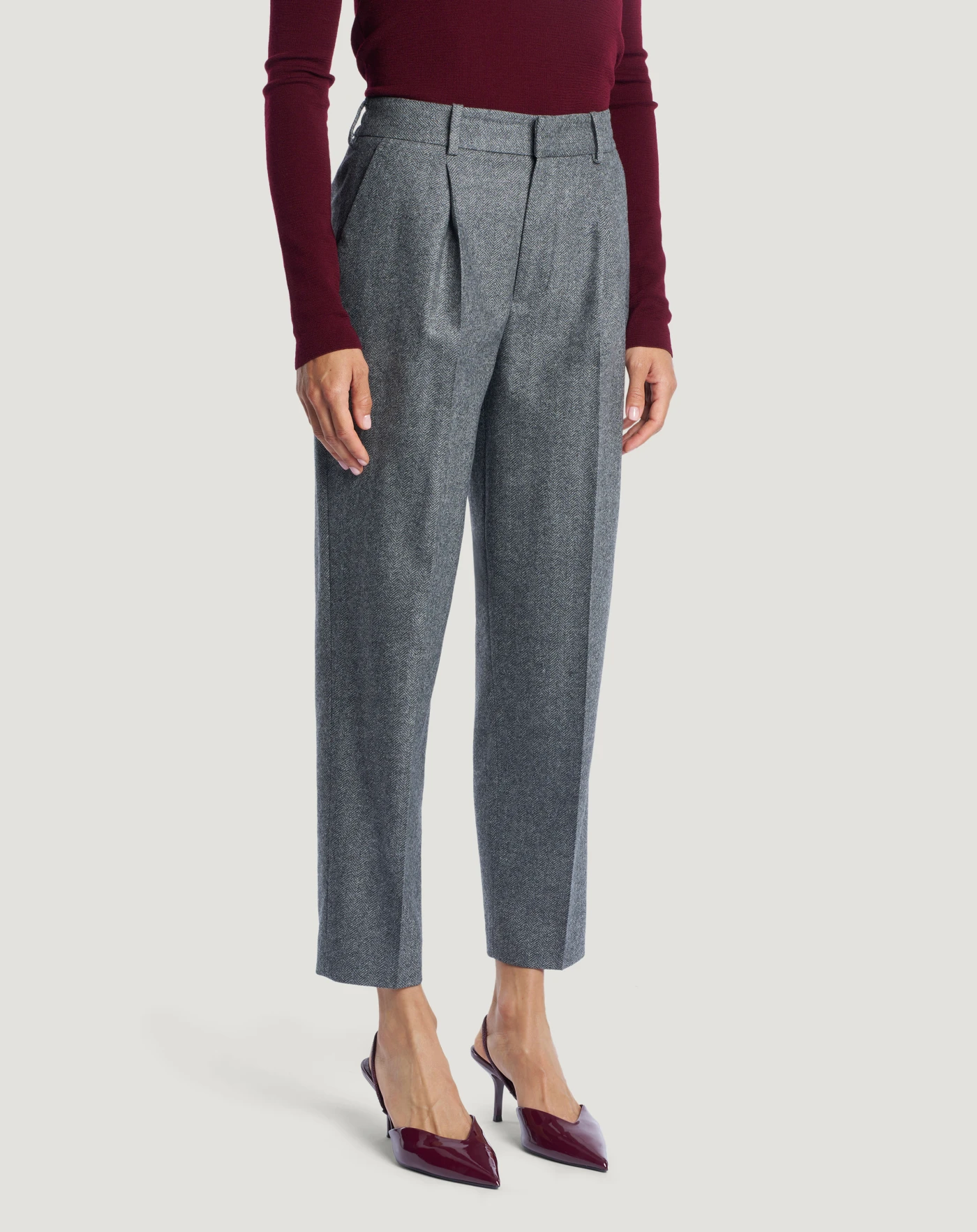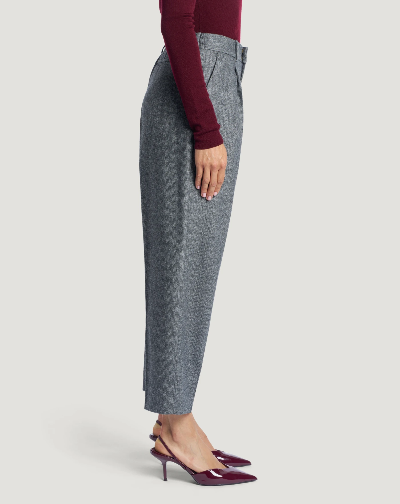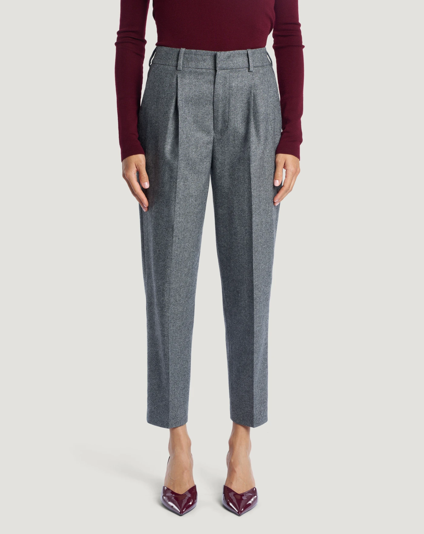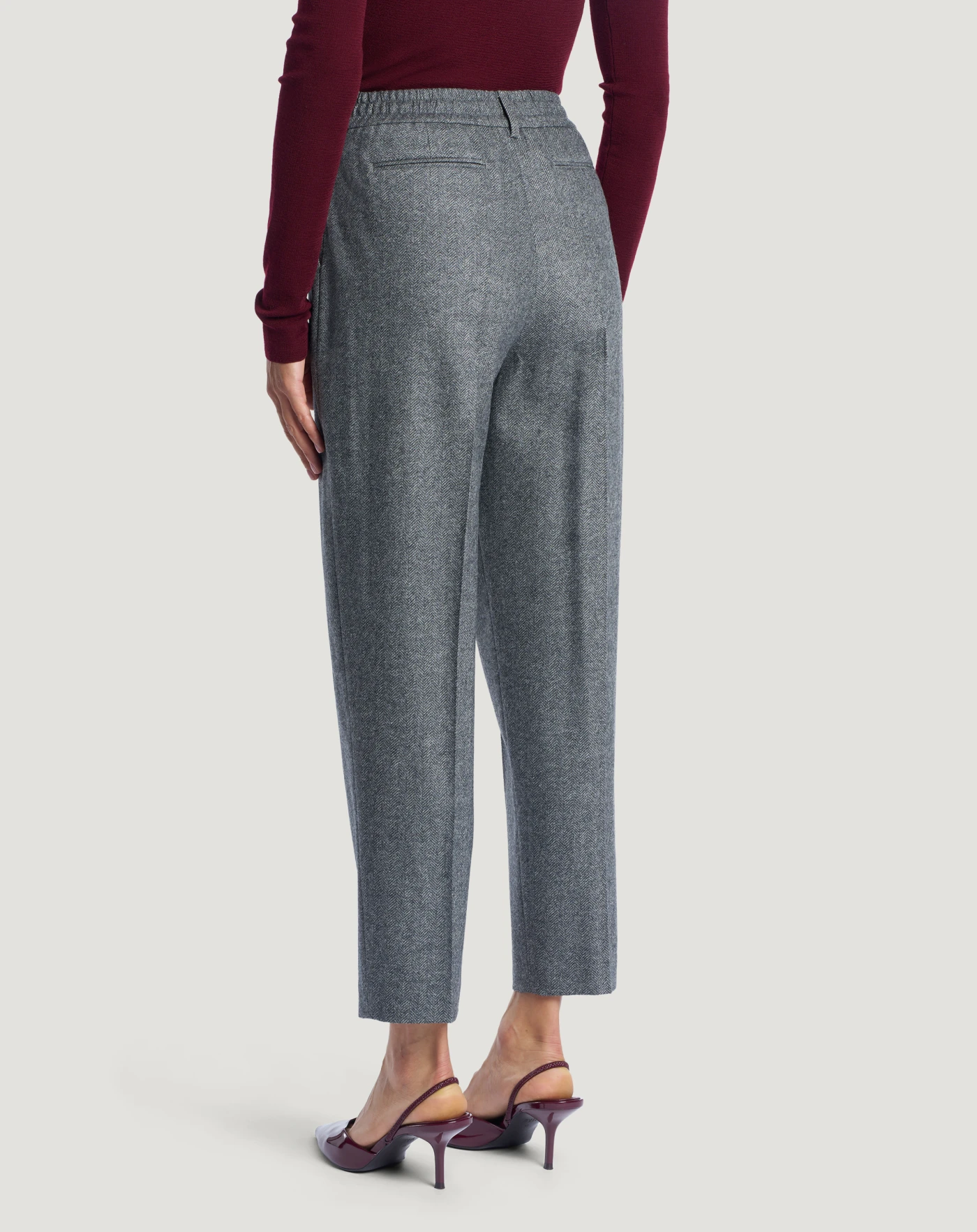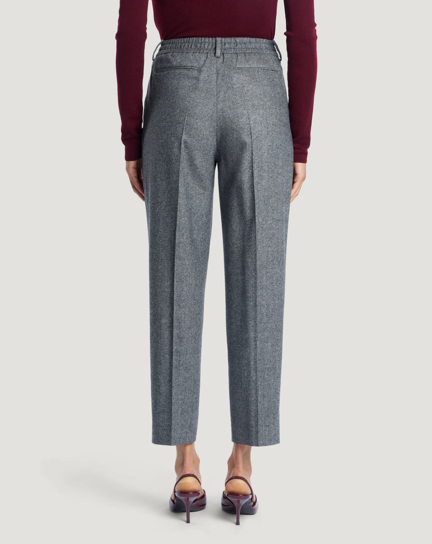 Trousers in wool and cashmere flannel, a soft and refined fabric with a micro chevron pattern.The design with pleats at the front and elasticated back makes them an everyday yet elegant model.