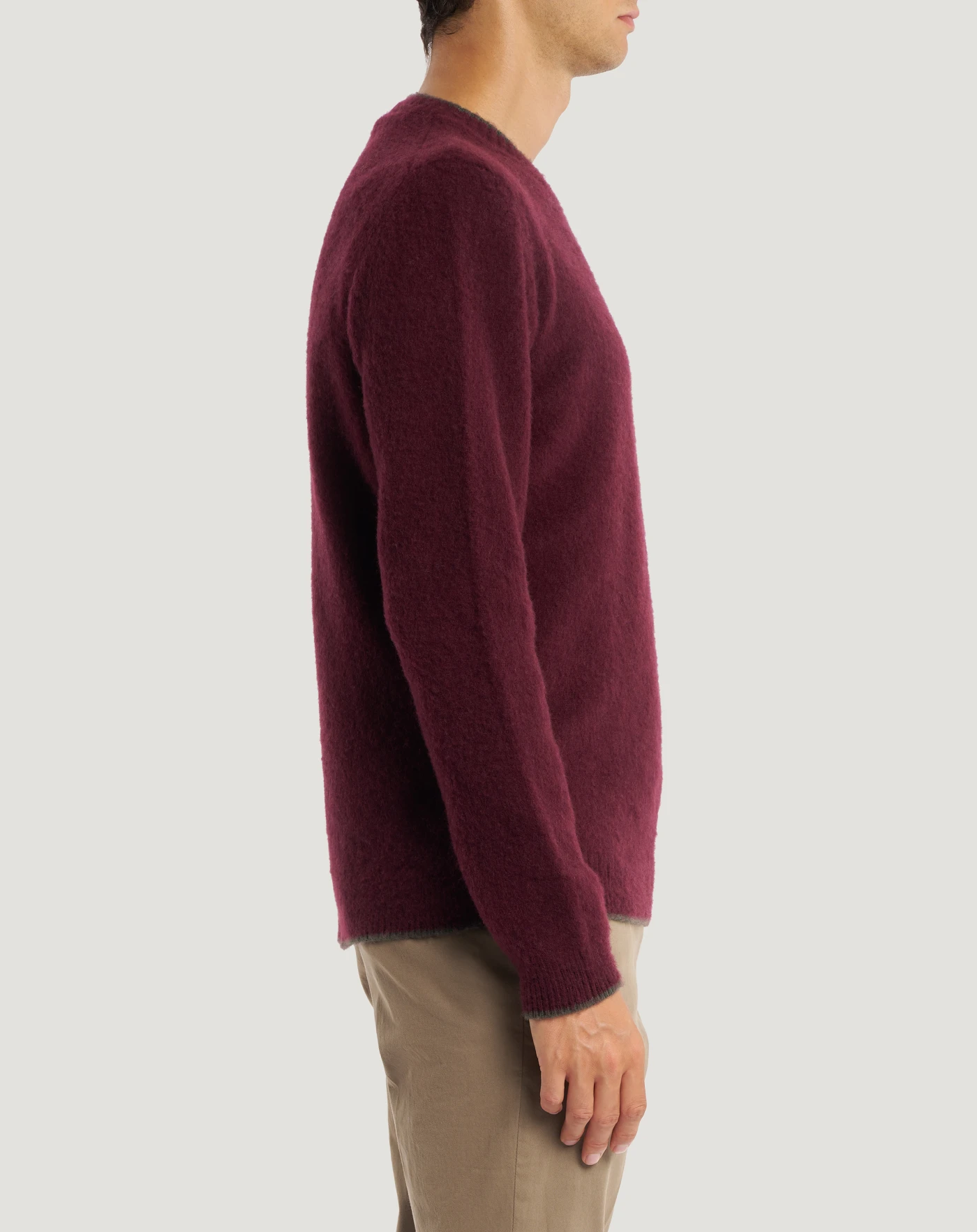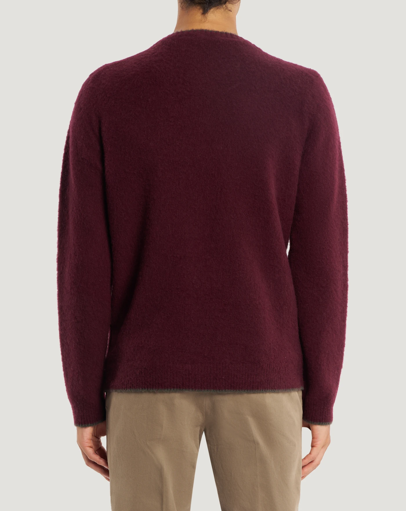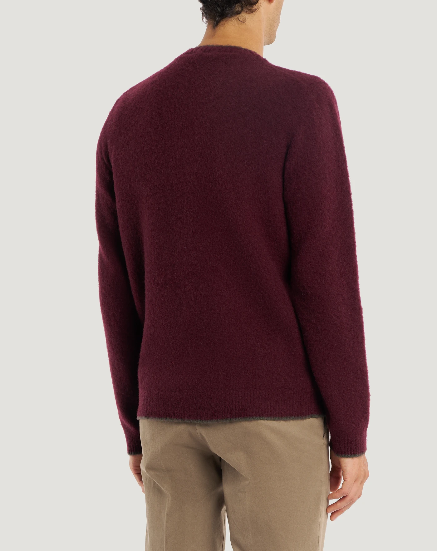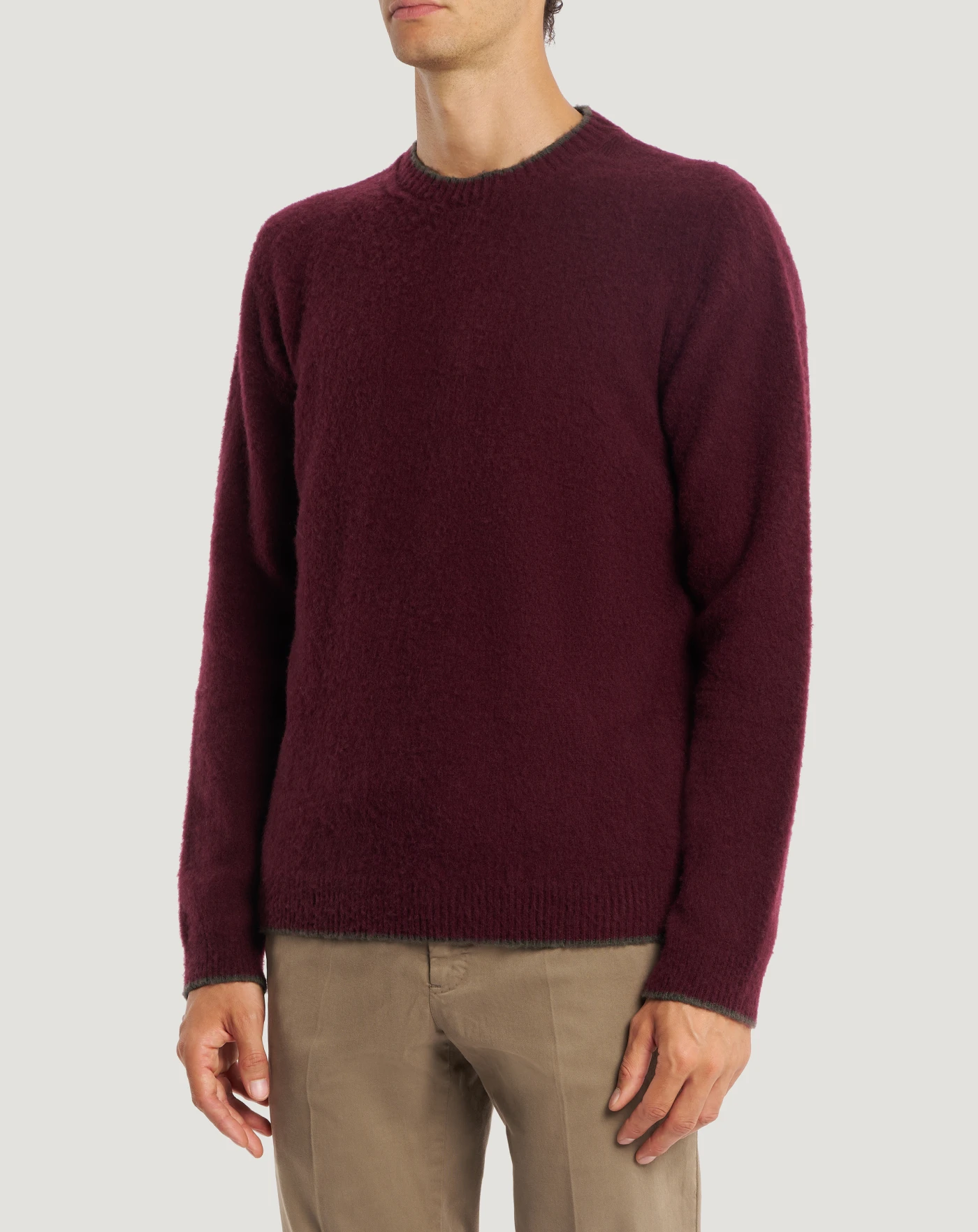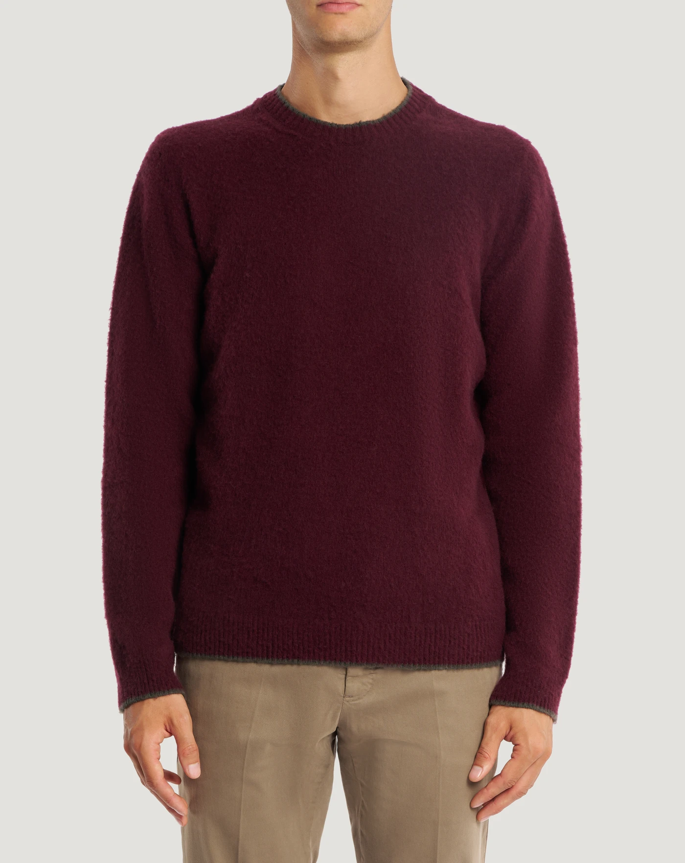Jumper in wool and cashmere with brushed and combed finished, fineness 7 for a compact, soft and lightweight garment.With a round neck and regular fit, its versatile design is enhanced by edges finished in a contrasting colour stripe. In the red variant, to add a chromatic touch to your look.