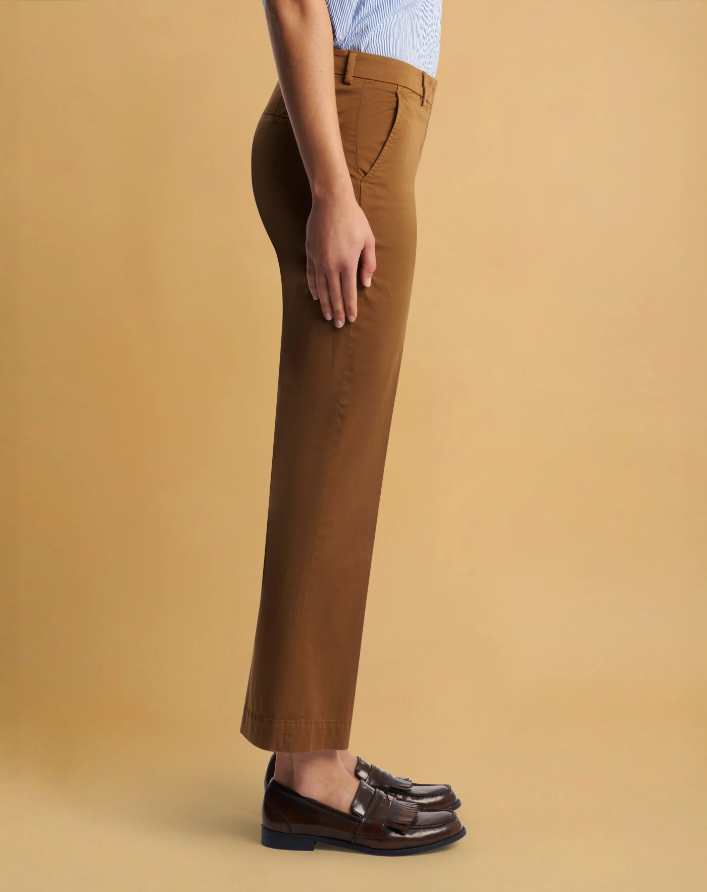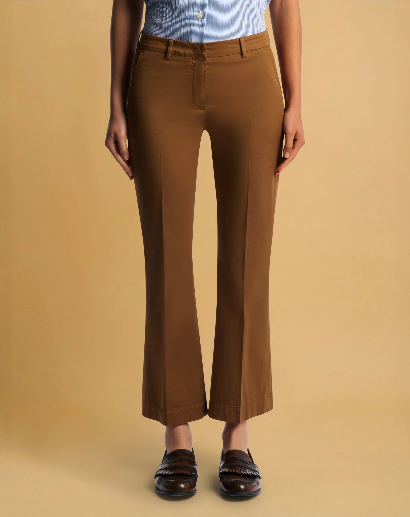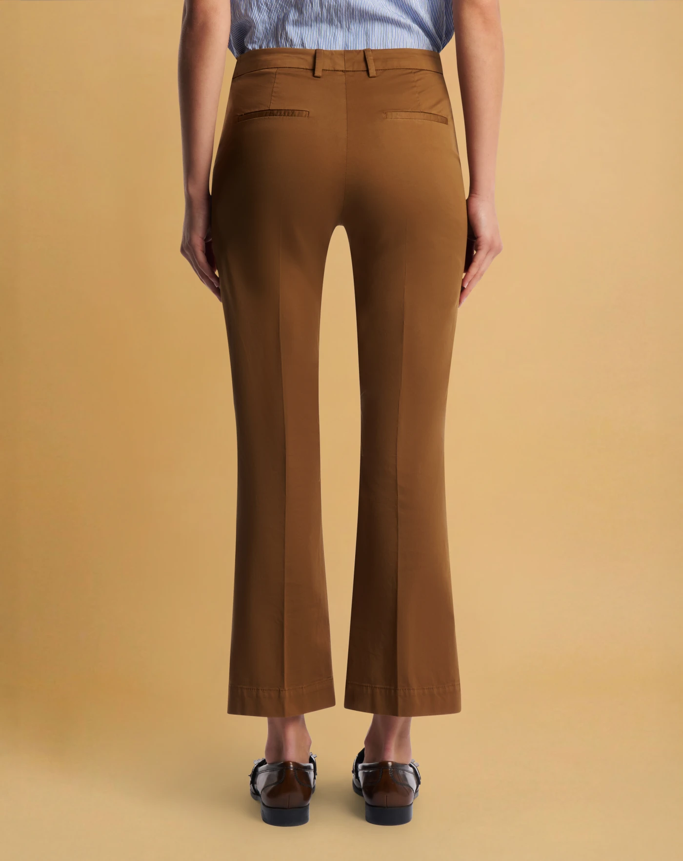 Trousers in a light, soft stretch satin featuring a smooth and slightly shiny surface. Enriched by an elastic component that increases comfort and freedom of movement. With a flared fit, this ankle-length model in brown will give your style an edgy, contemporary note.