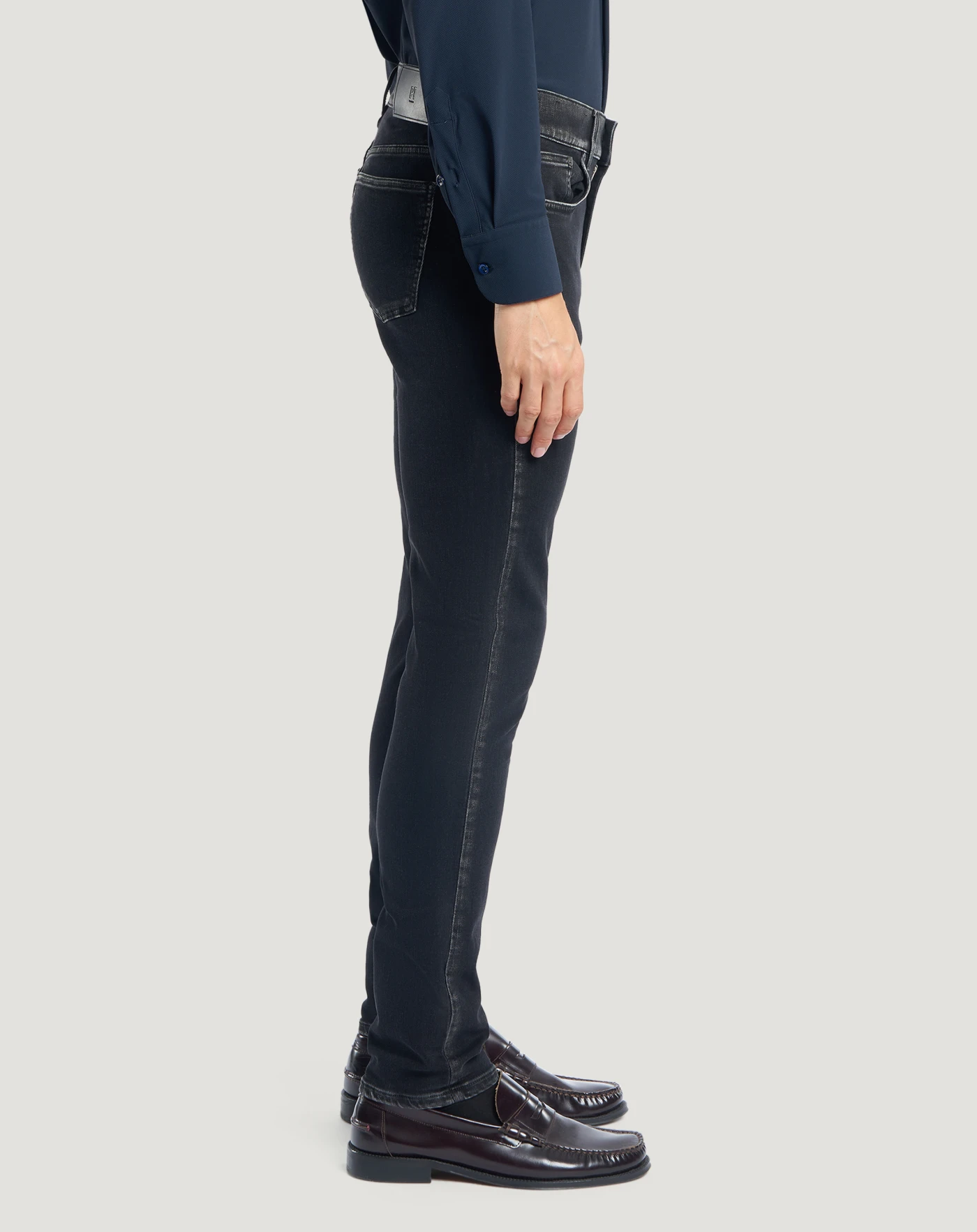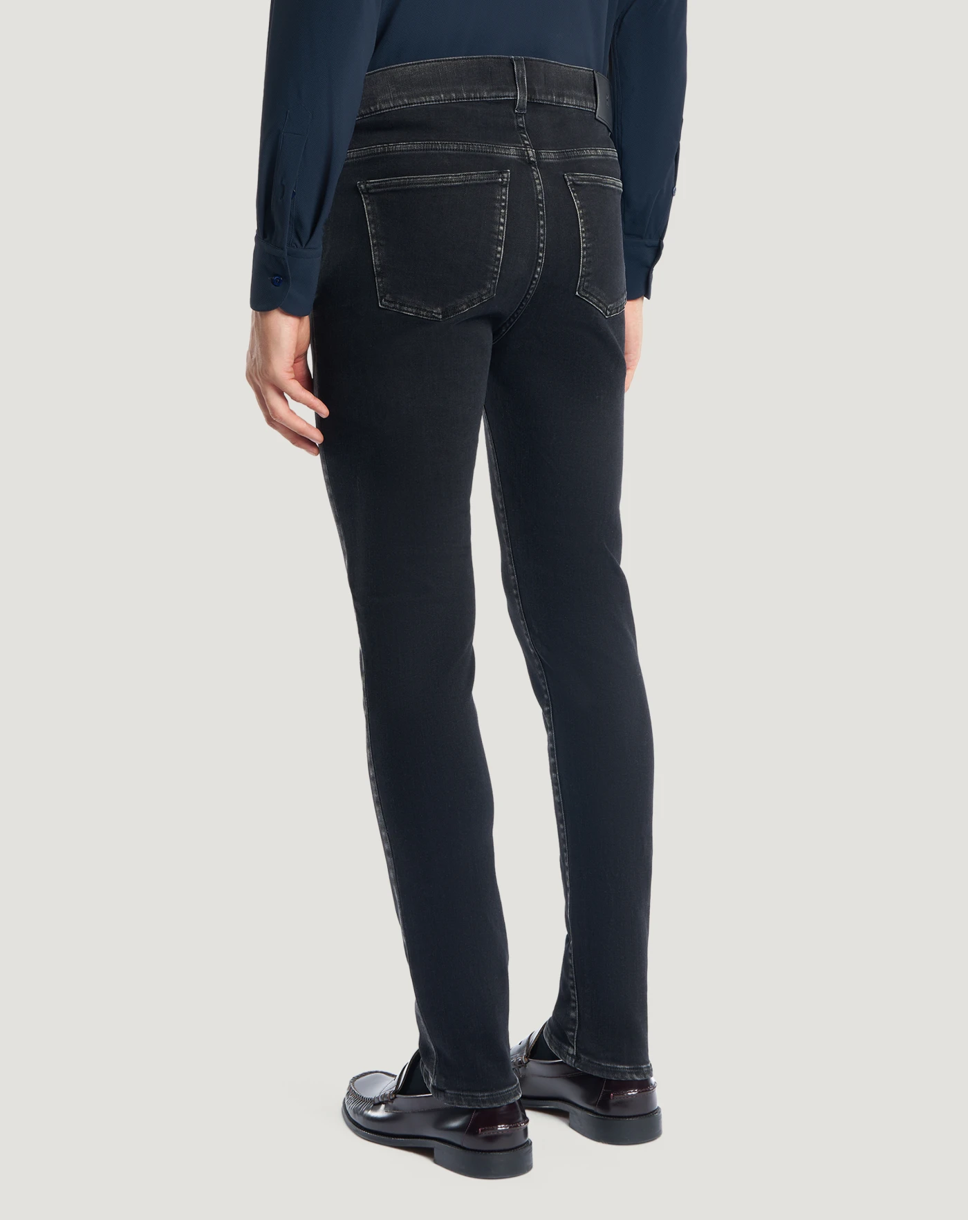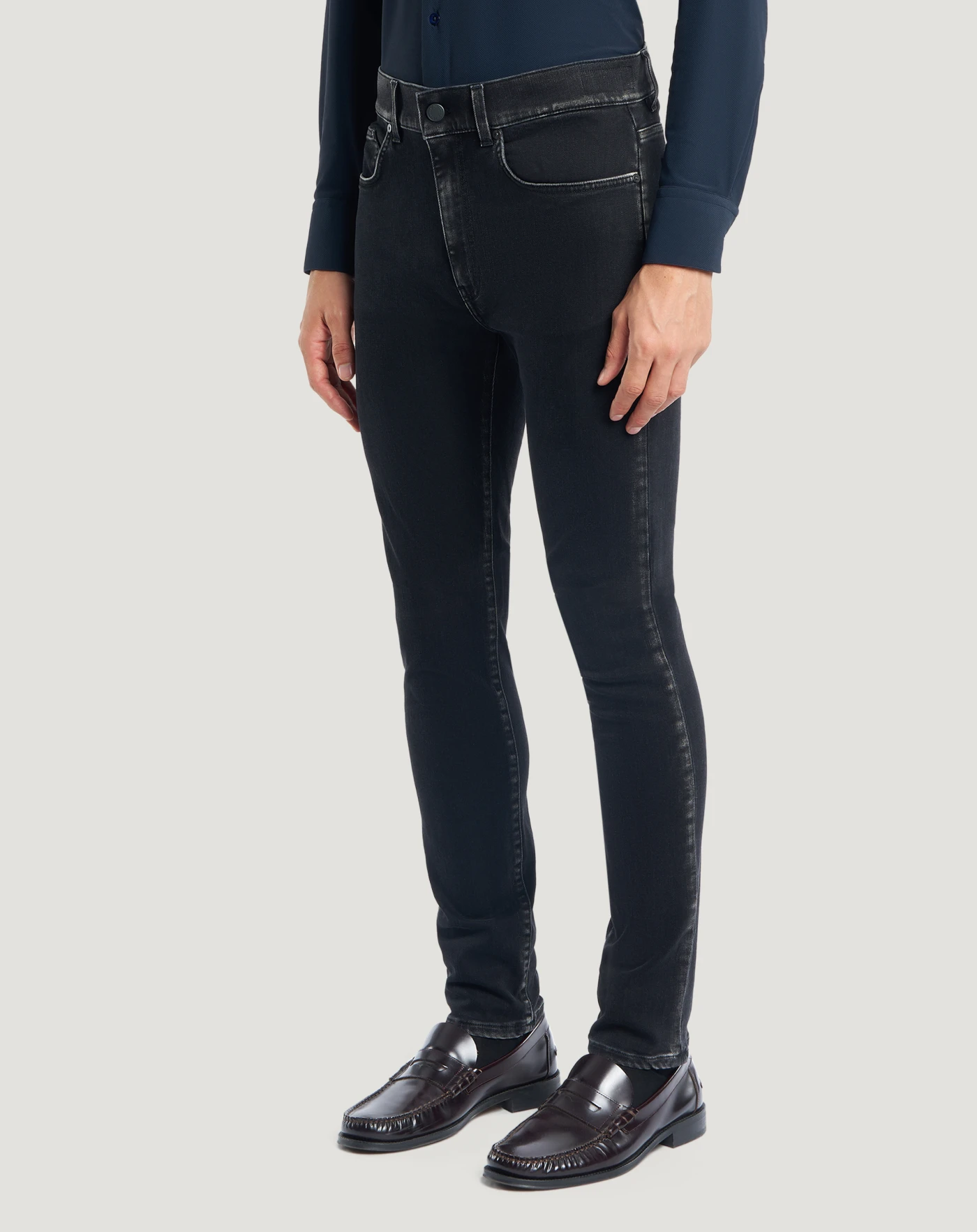 Jeans in black recycled stretch denim, a soft, comfortable and durable fabric (10 oz); the wash has grey highlights on raised details. With a skinny fit and high waist, they are the perfect style option to complete your look with spontaneous elegance.
