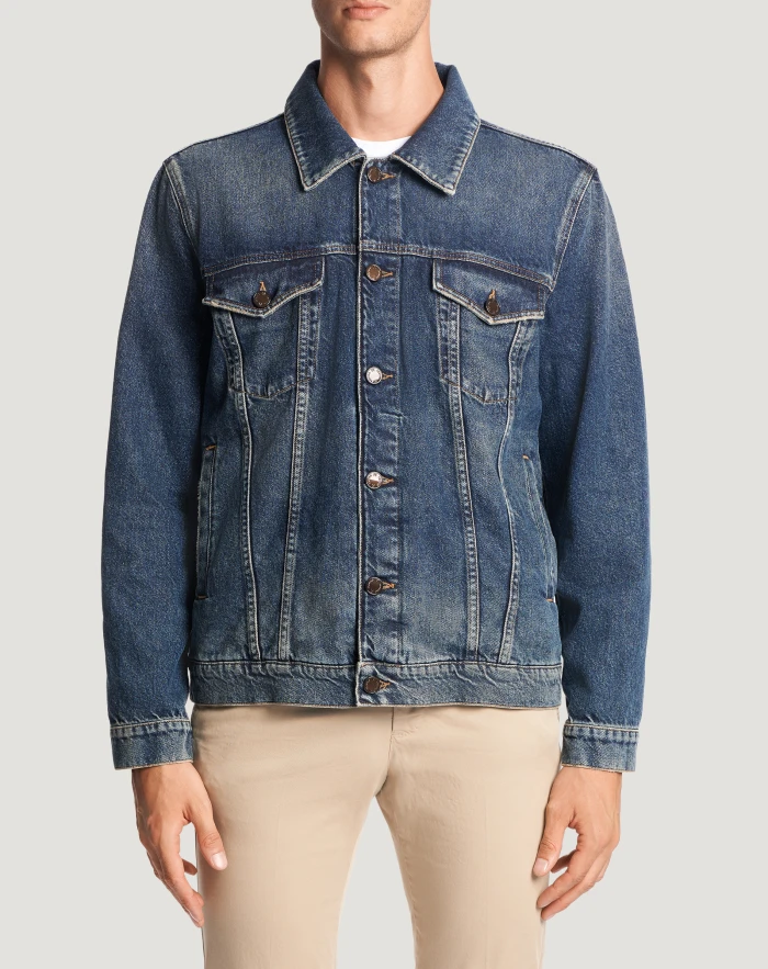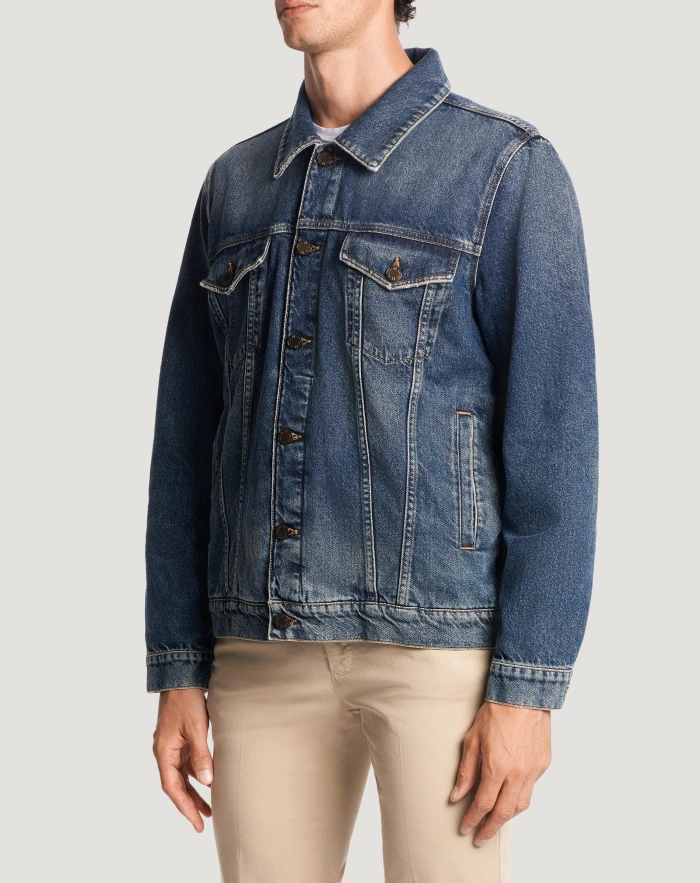 Trucker jacket in pure cotton denim, a firm, comfortable and durable fabric (11.5 oz), with a marbled effect wash and tobacco-coloured stitching.With a straight and versatile fit, the model is full of character that adds an updated touch to your style.