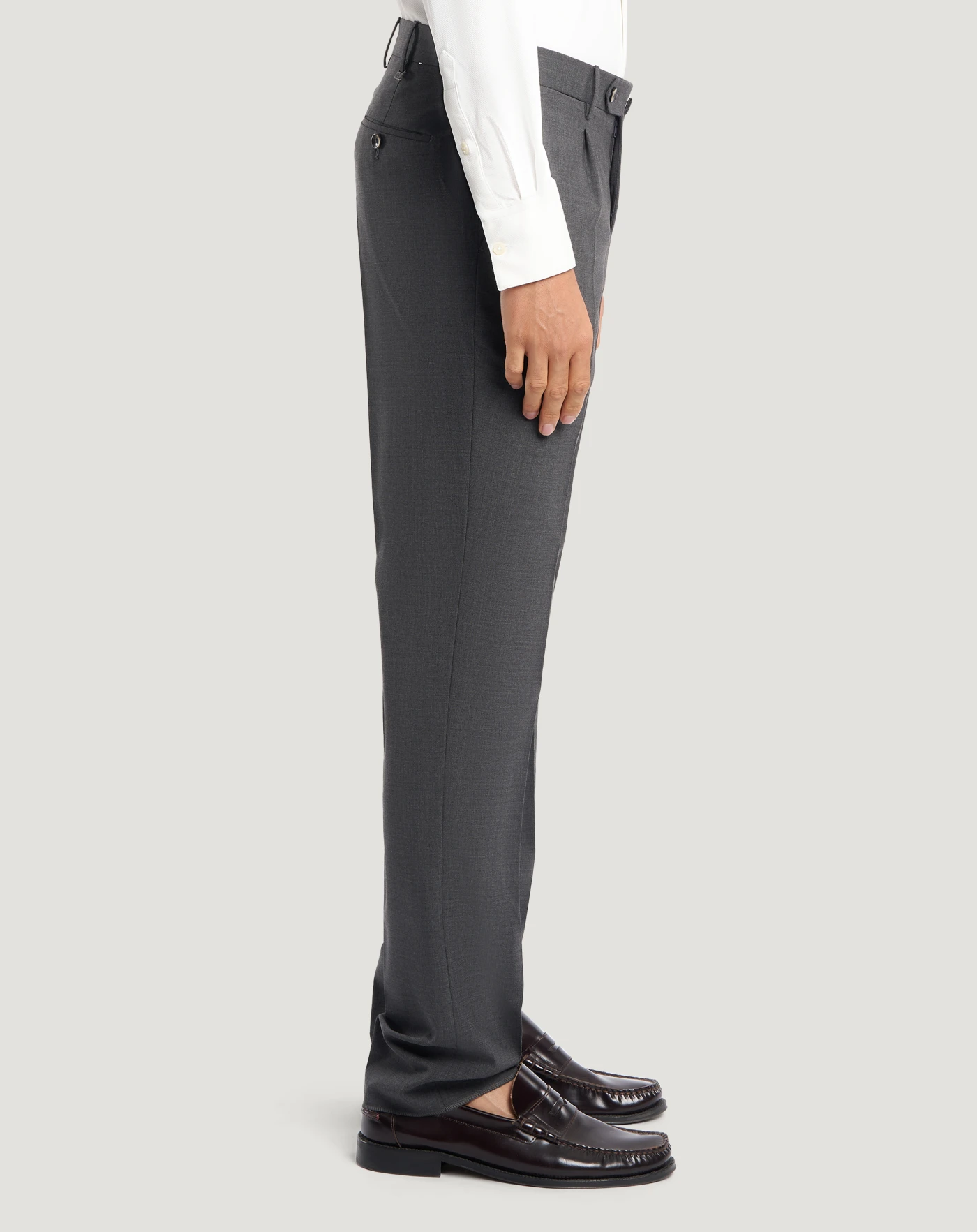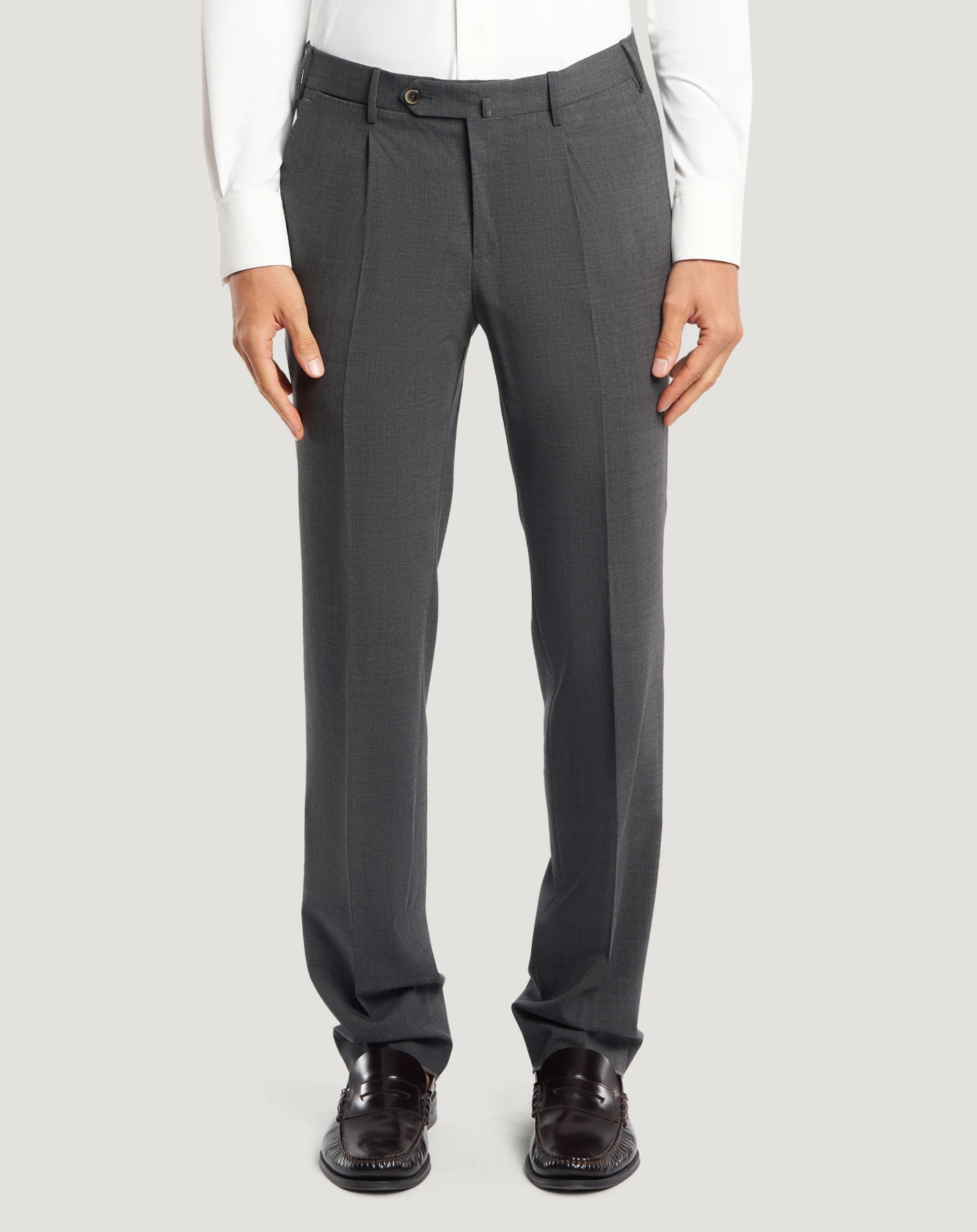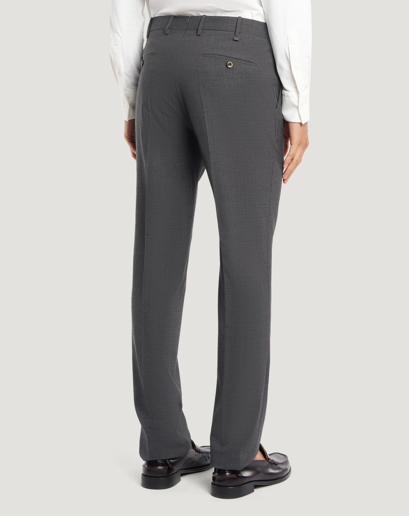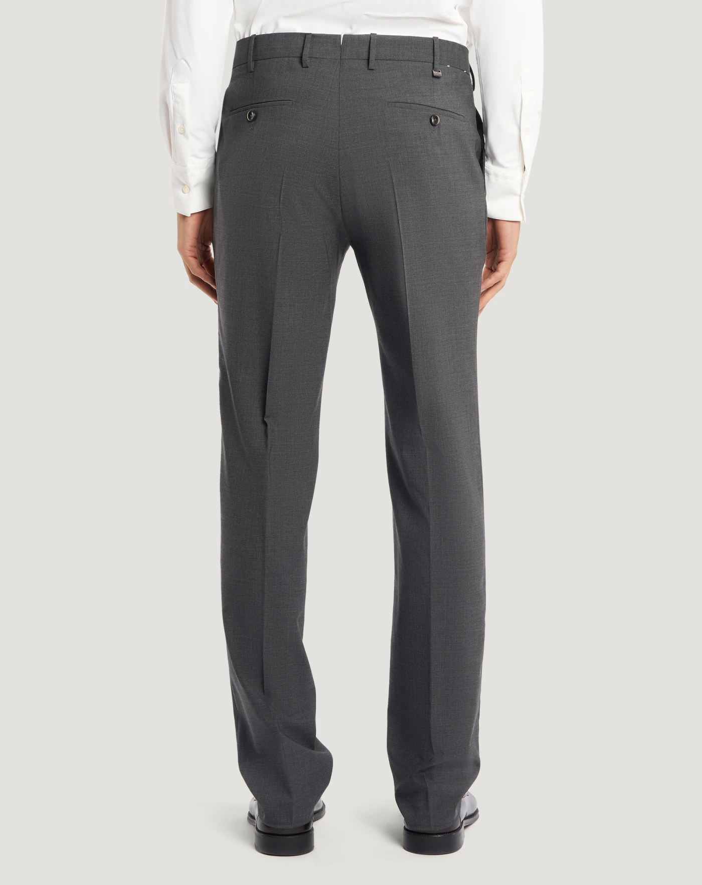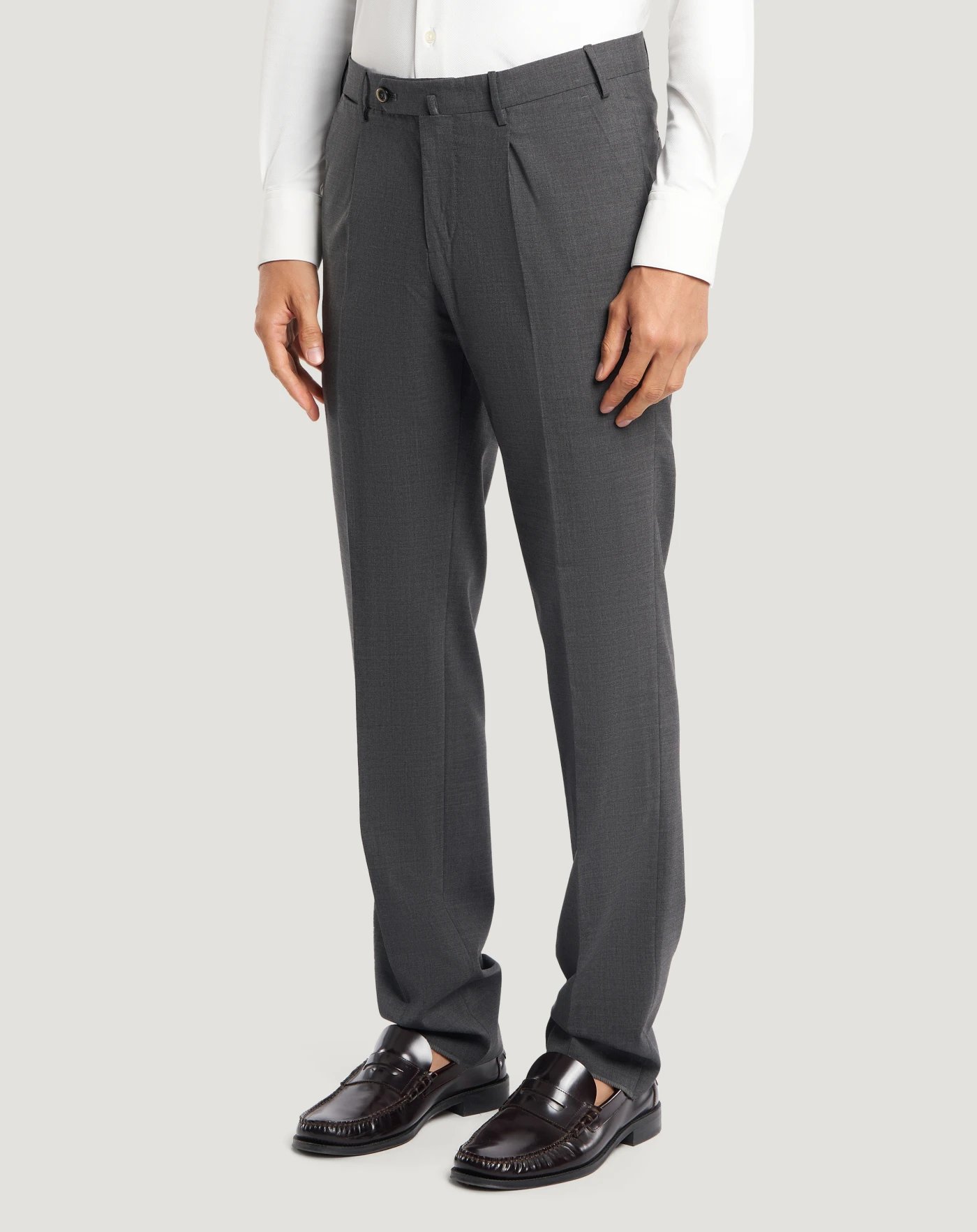 Trousers in four-season wool, a stretch fabric with a plain weave designed for all-season use. Lightweight yet structured, it combines comfort and practicality with a clean, effortless look.The garment is delivered unstitched, so that it can be finished to suit your length and style through simple tailoring.With a front pleat and a straight fit, wear the dark grey variant for refined elegance.