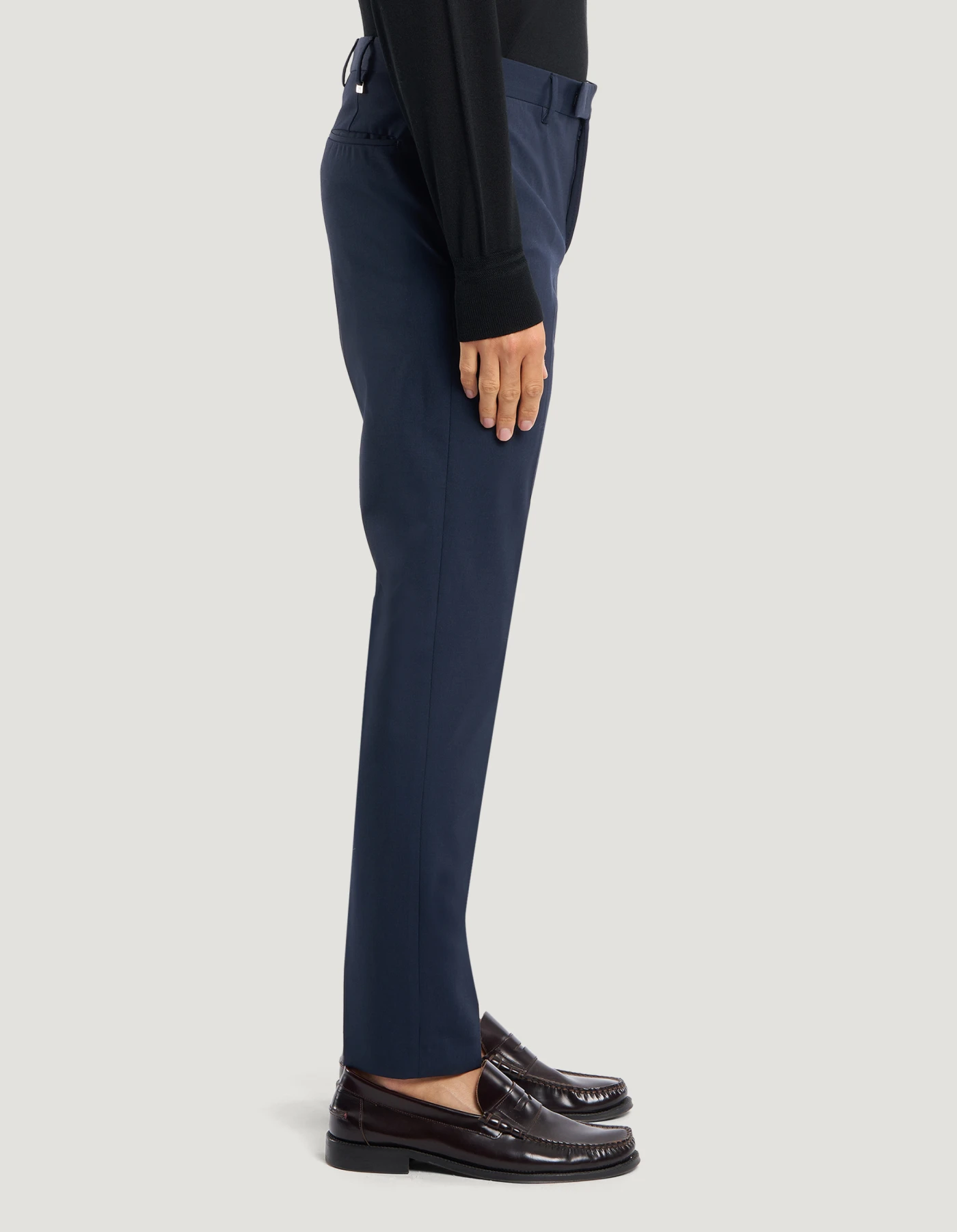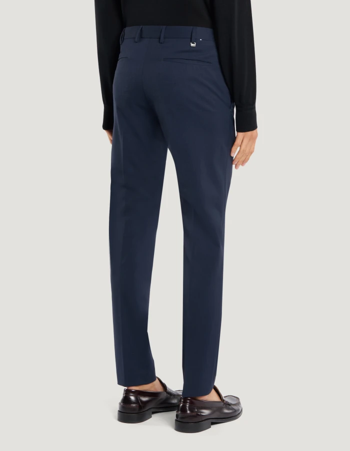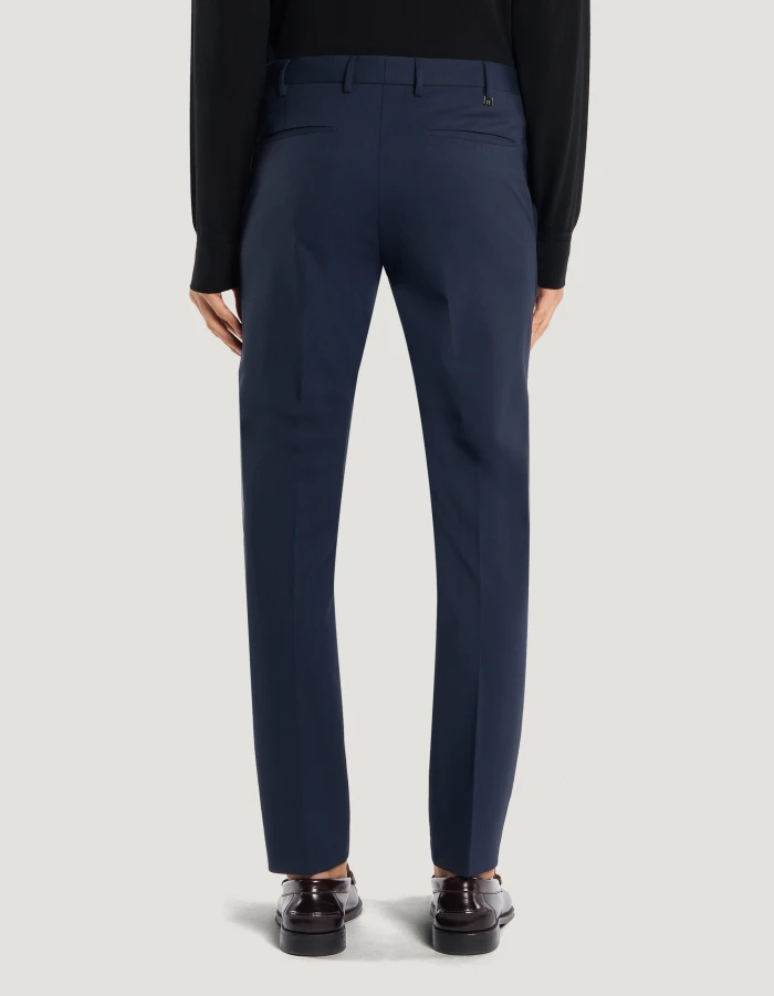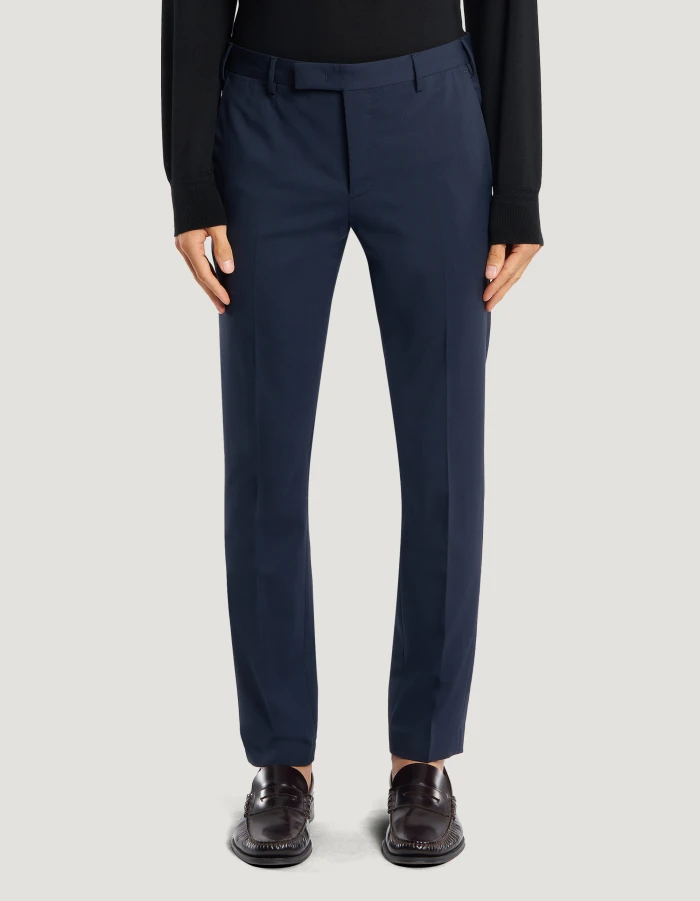 Trousers in bi-stretch batavia wool, a fabric distinguished by a stretch weave that adapts to the body’s movements, ensuring a look that is both elegant and comfortable yet light.With a smooth front and skinny fit, these ankle-length trousers feature a simple, tailored design. Choose the navy blue variant to complete a special occasion look with relaxed elegance.