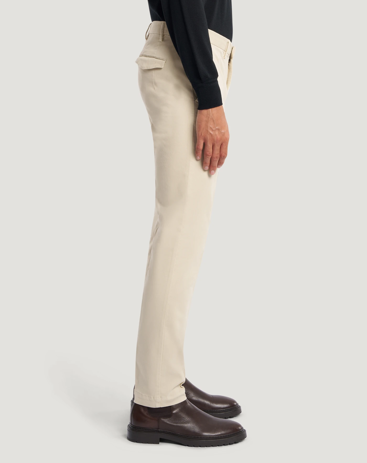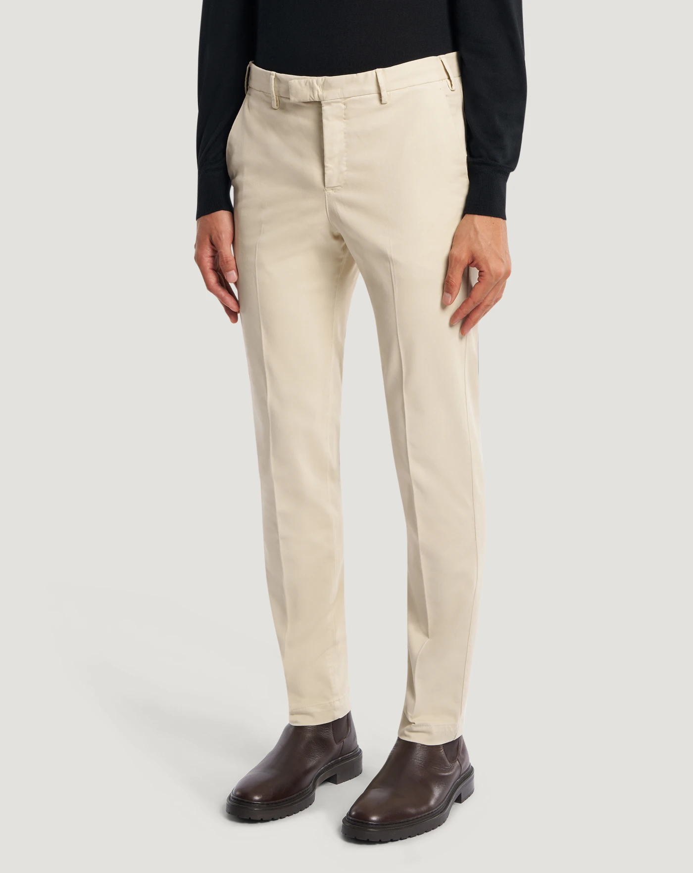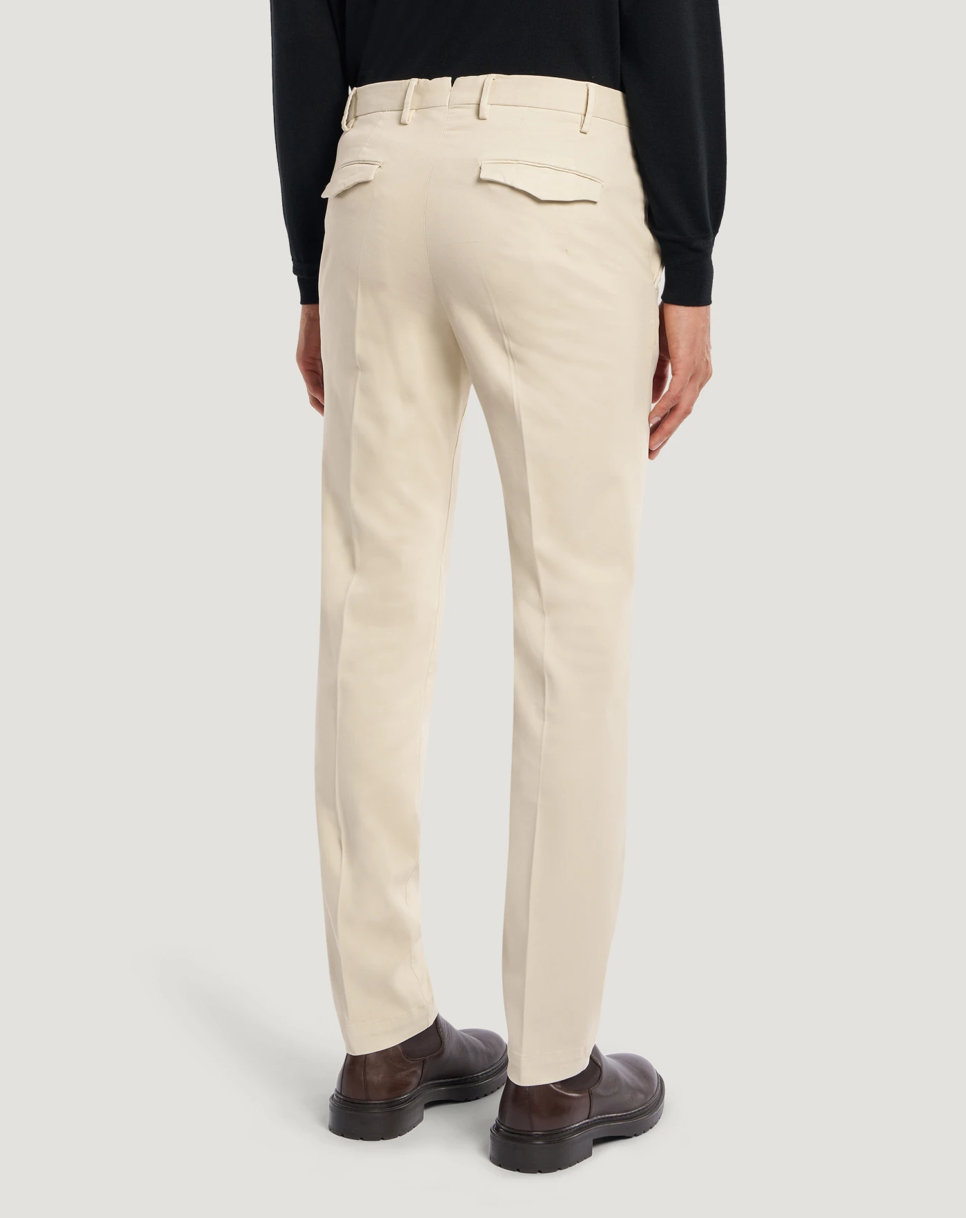 Trousers in stretch cotton gabardine and modal, a soft, durable and easy-to-pair everyday fabric. Featuring a smooth front and ironed pleat, these trousers boast a unique sartorial design. The ice variant brings your look up-to-date in an instant.