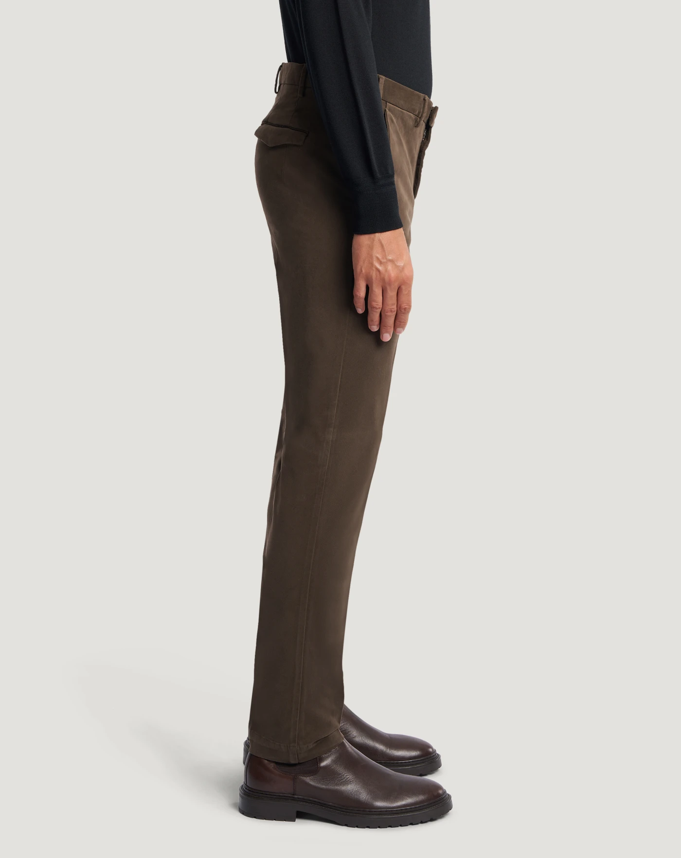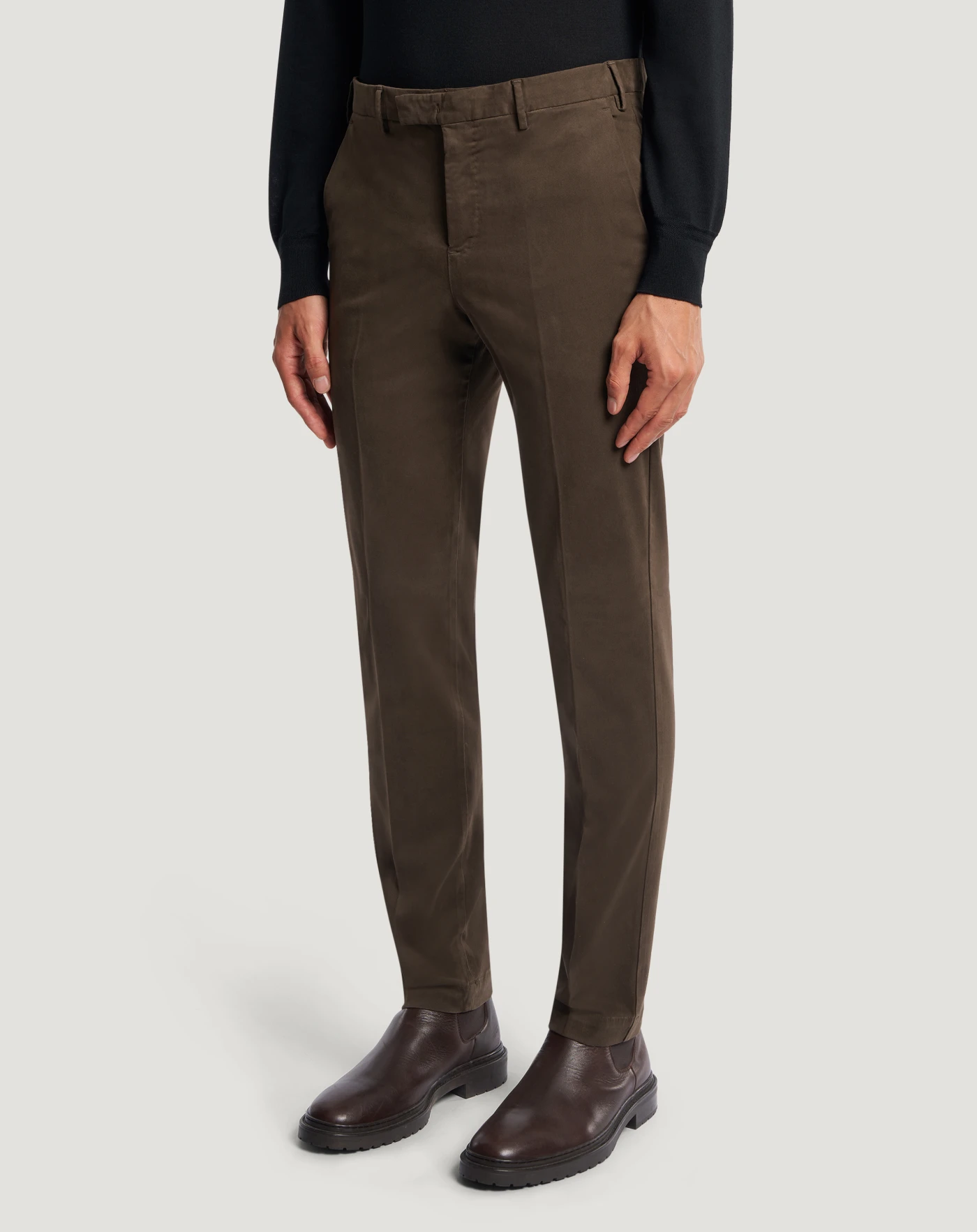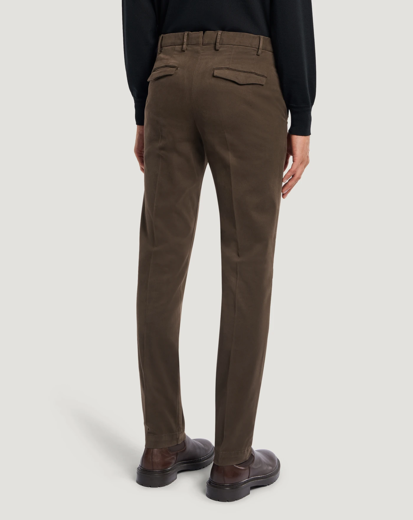 Trousers in stretch cotton gabardine and modal, a soft, durable and easy-to-pair everyday fabric. Featuring a smooth front and ironed pleat, these trousers boast a unique sartorial design. The dark brown variant completes your casual and formal style with personality.