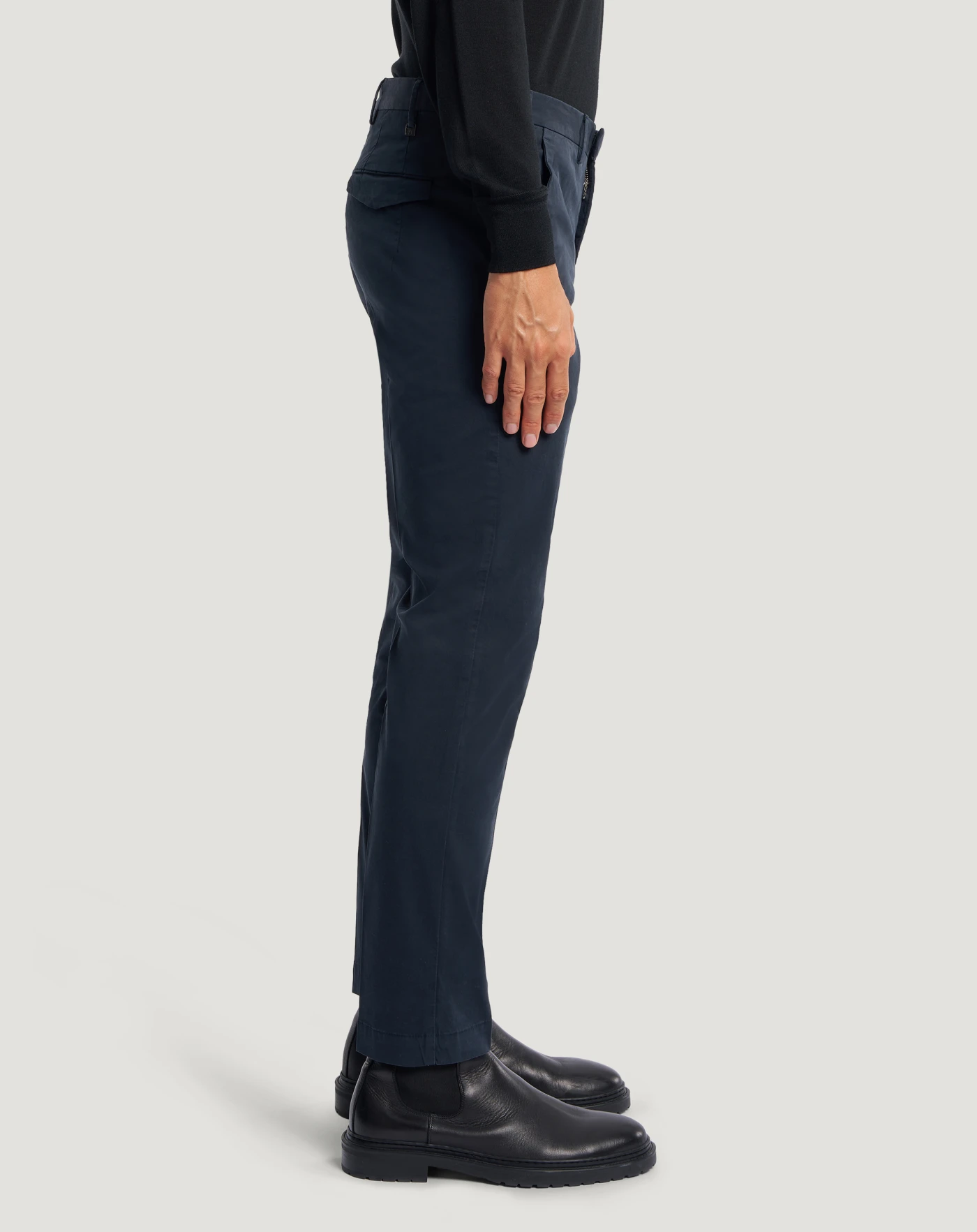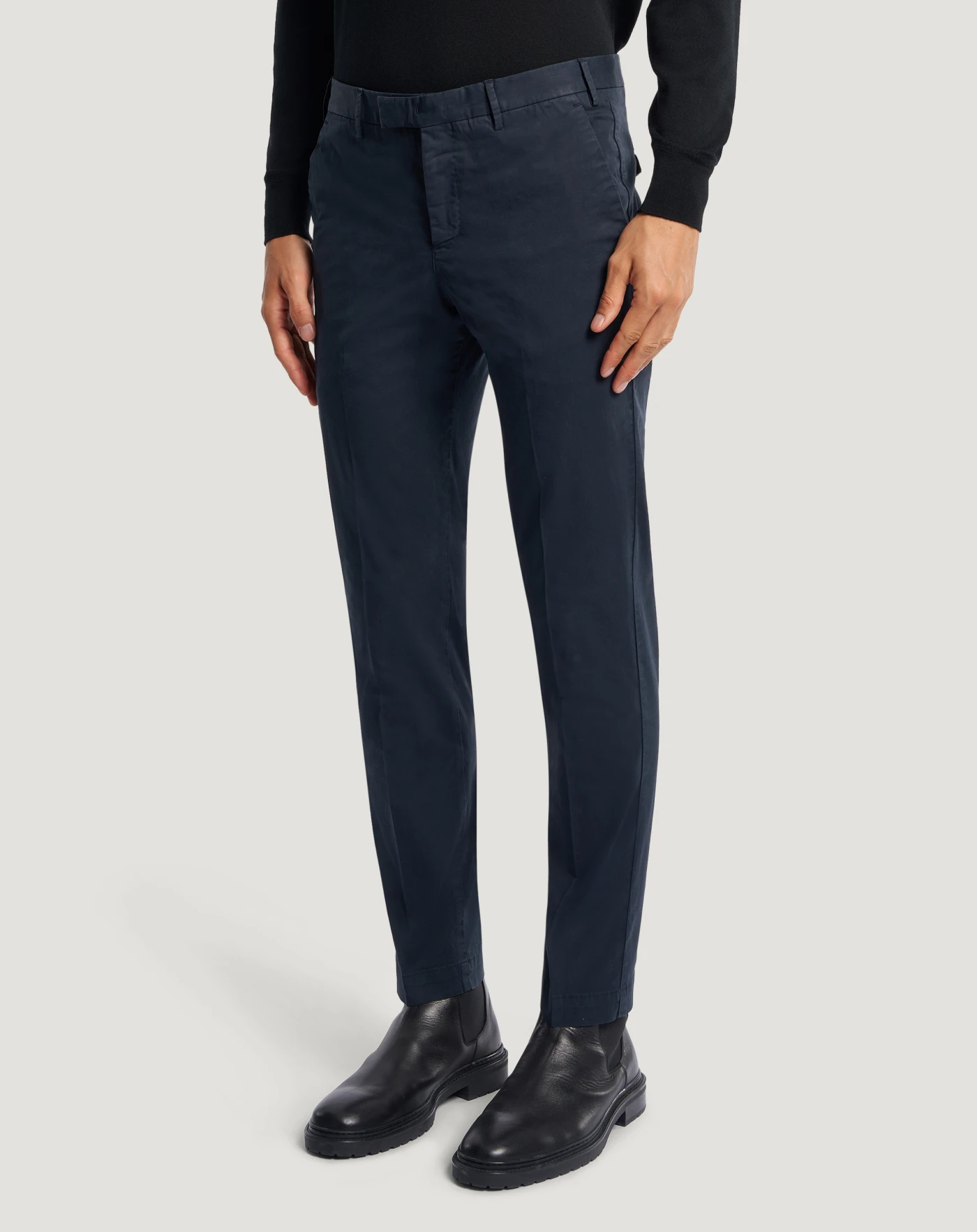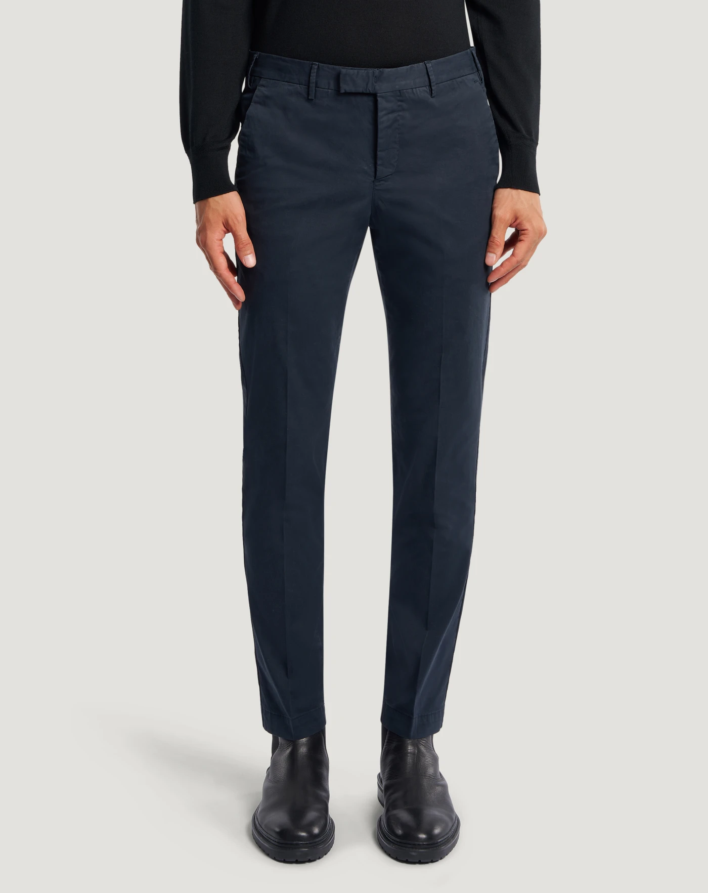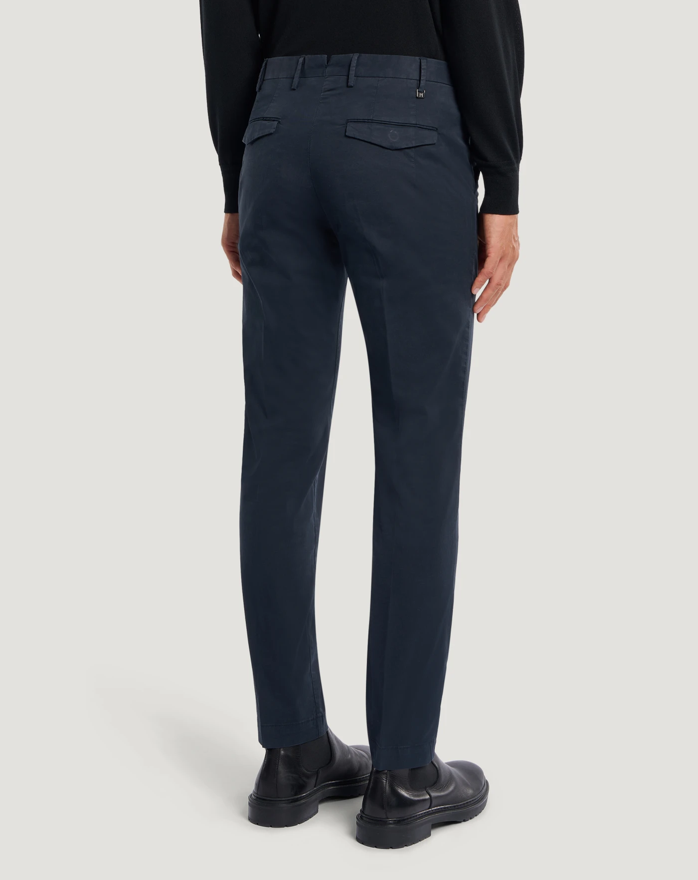 Trousers in stretch lightweight cotton gabardine, a compact and durable fabric for comfortable freedom of movement.With a smooth front, slim cut and ironed pleat, these trousers feature a versatile sartorial design. Choose the dark navy blue variant to complete your style with a refined touch.