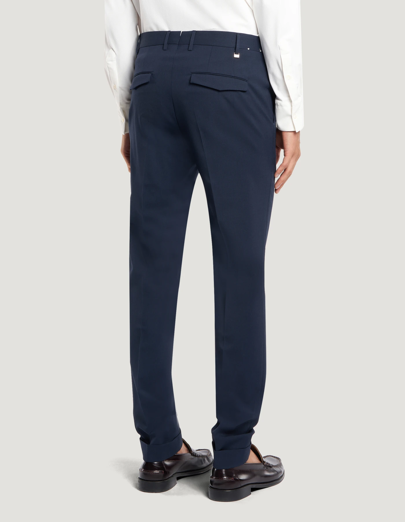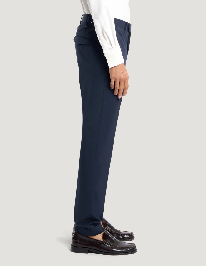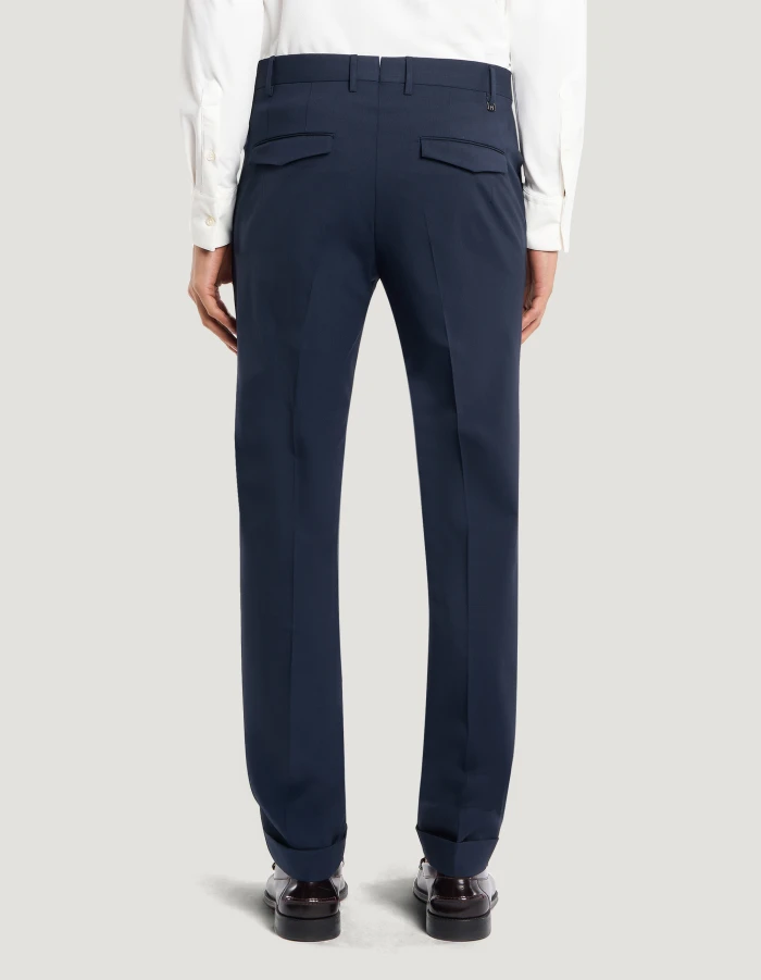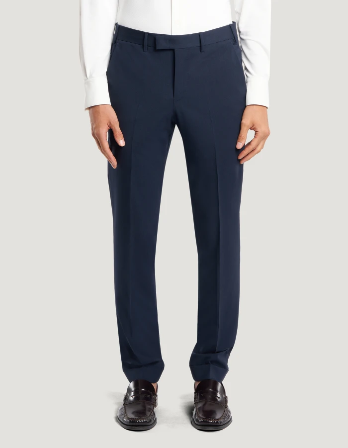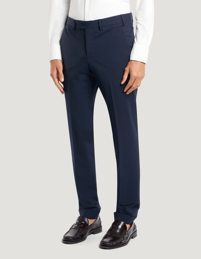 Trousers in bi-stretch batavia wool, a fabric distinguished by a stretch weave that adapts to the body’s movements, ensuring a look that is both elegant and comfortable yet light.Featuring a smooth front, ironed pleat and turned-up hem, these trousers boast a unique sartorial design. In navy blue to give your elegant looks and office wear an edgy vibe.