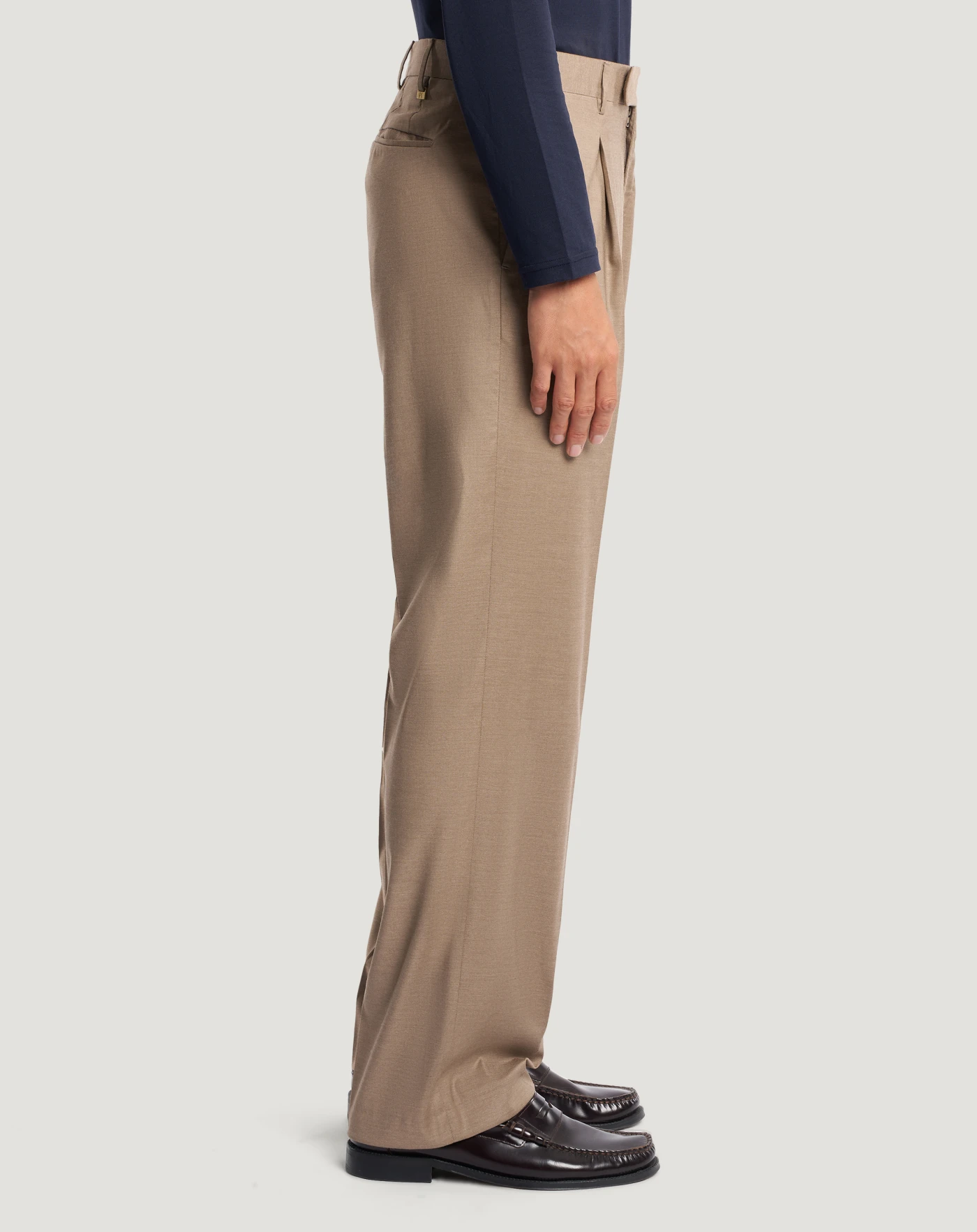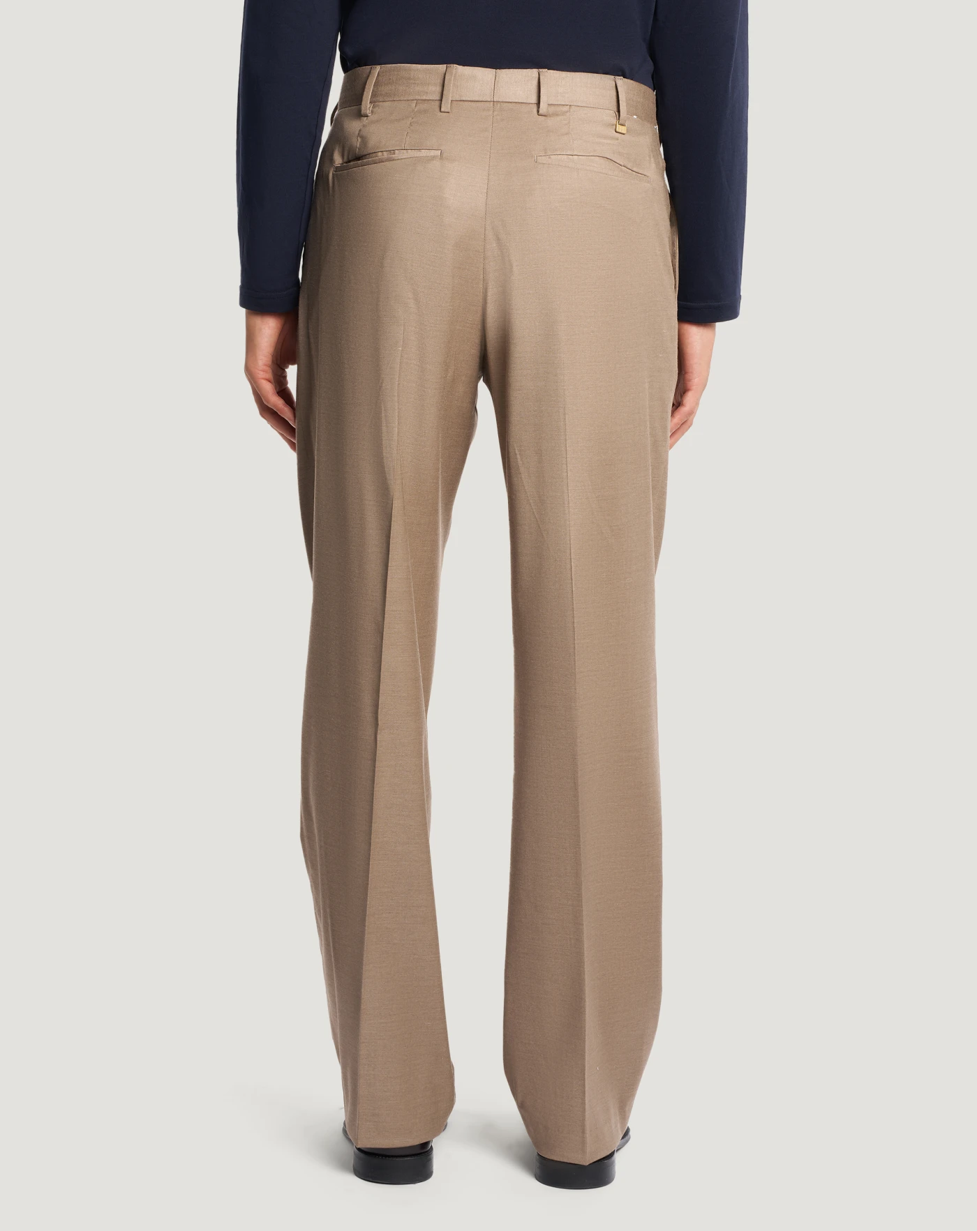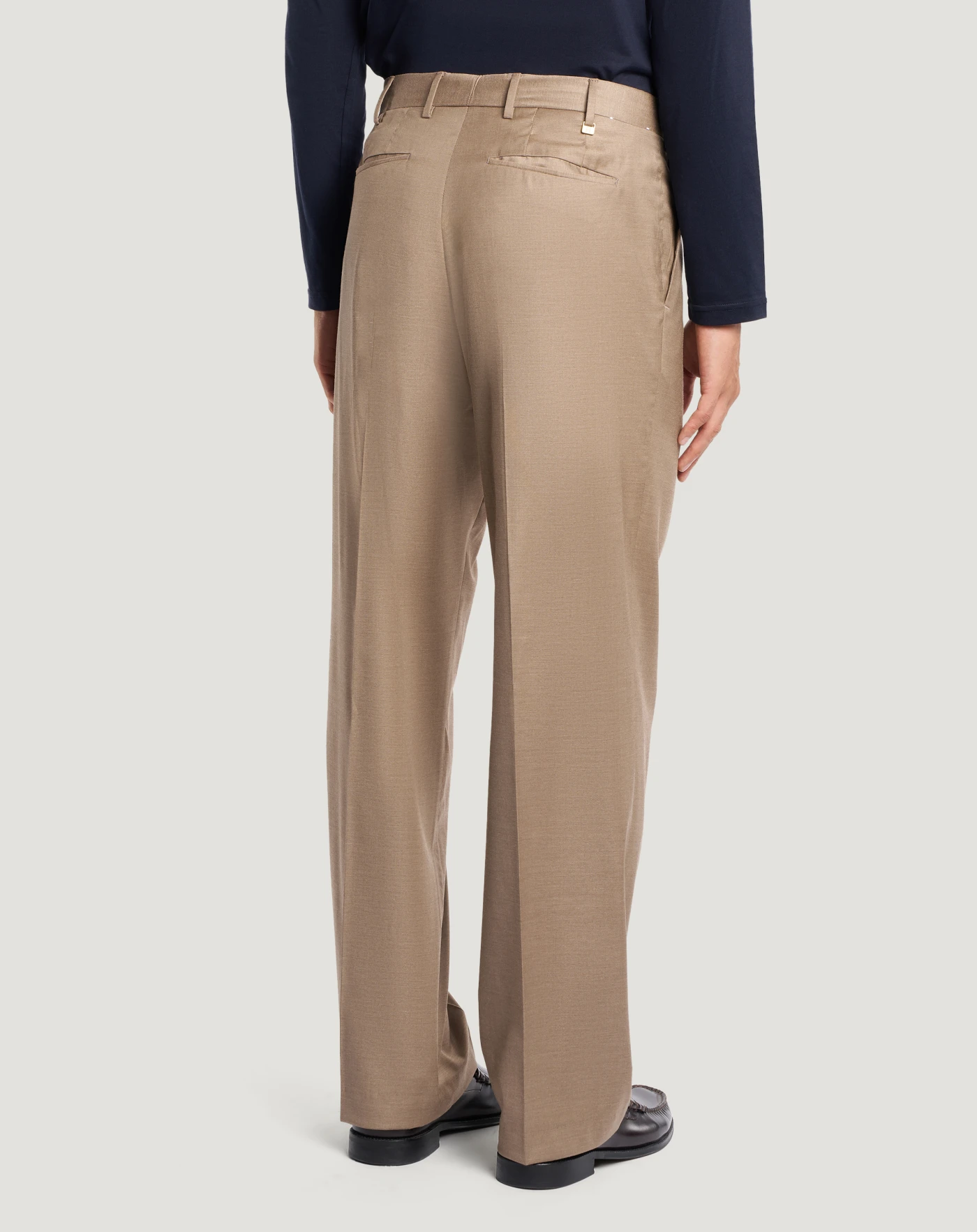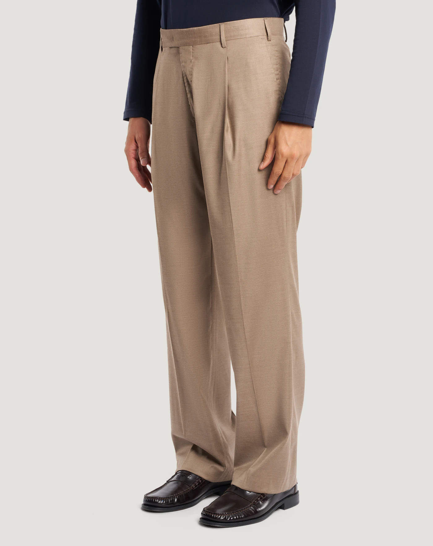 Trousers in stretch wool twill, a fine diagonal weave fabric with a fluid texture and a slightly stretchy component that guarantees comfort and freedom of movement.With a wide tailored fit and front pleat, choose the hazelnut variant for a unique, refined look.
