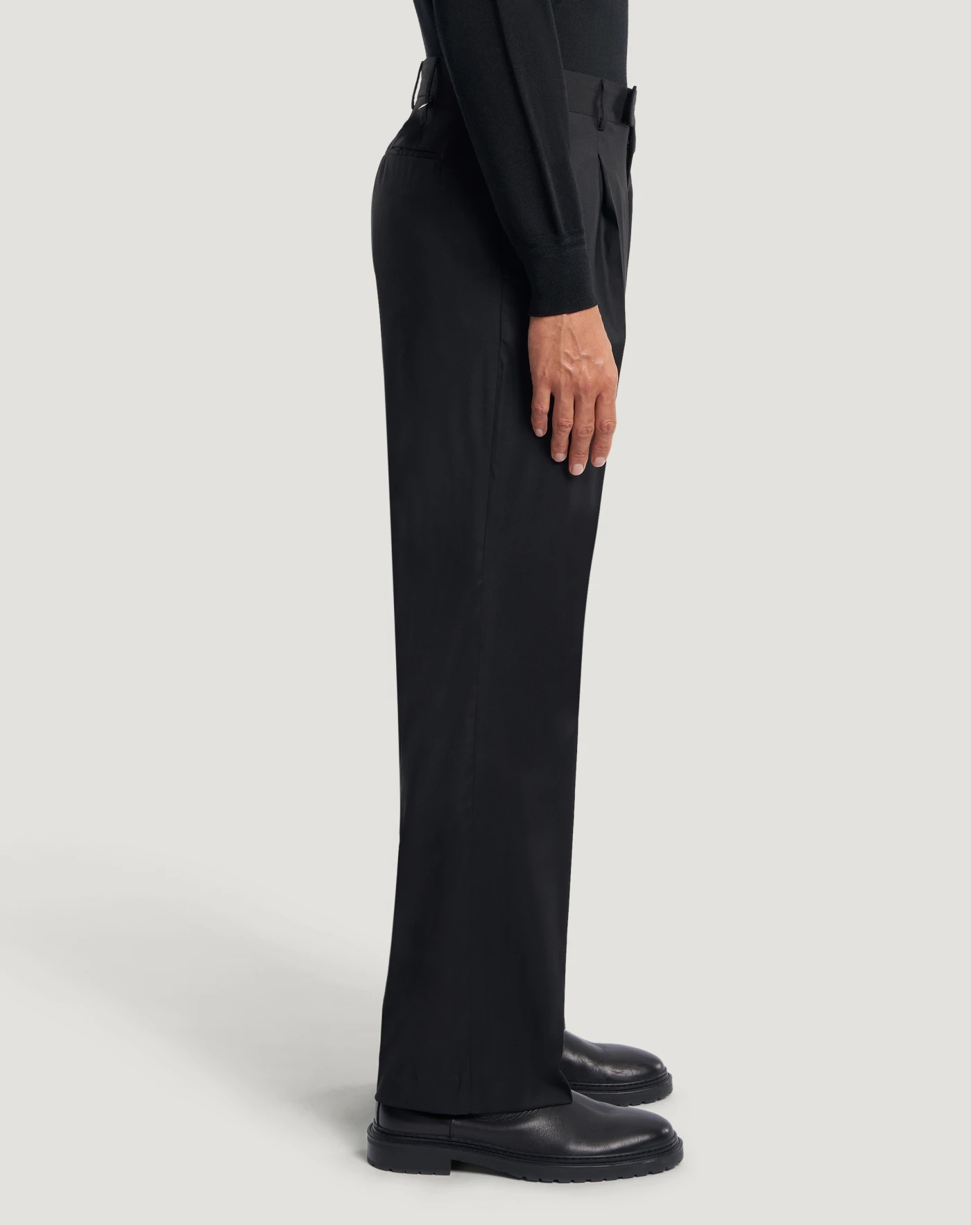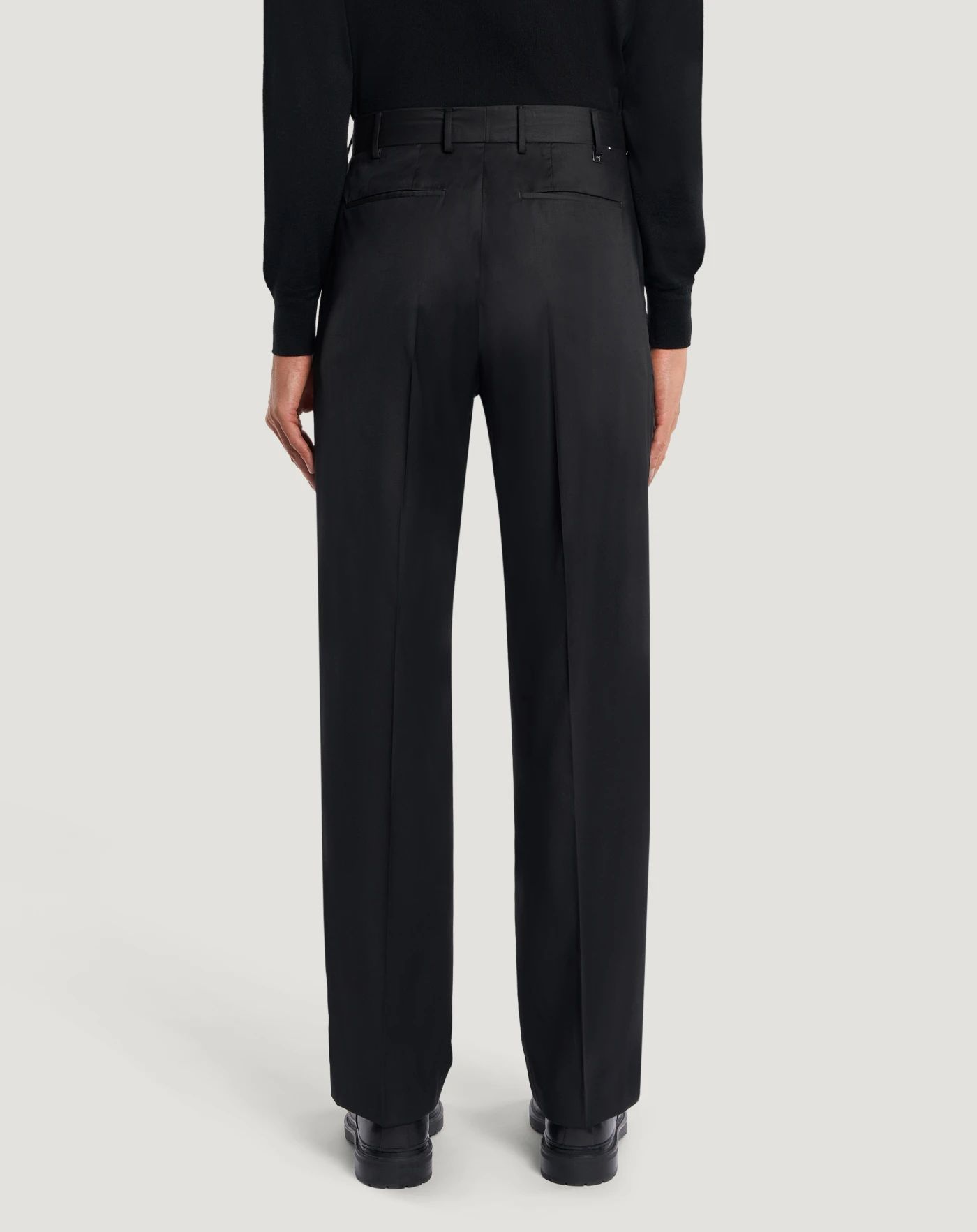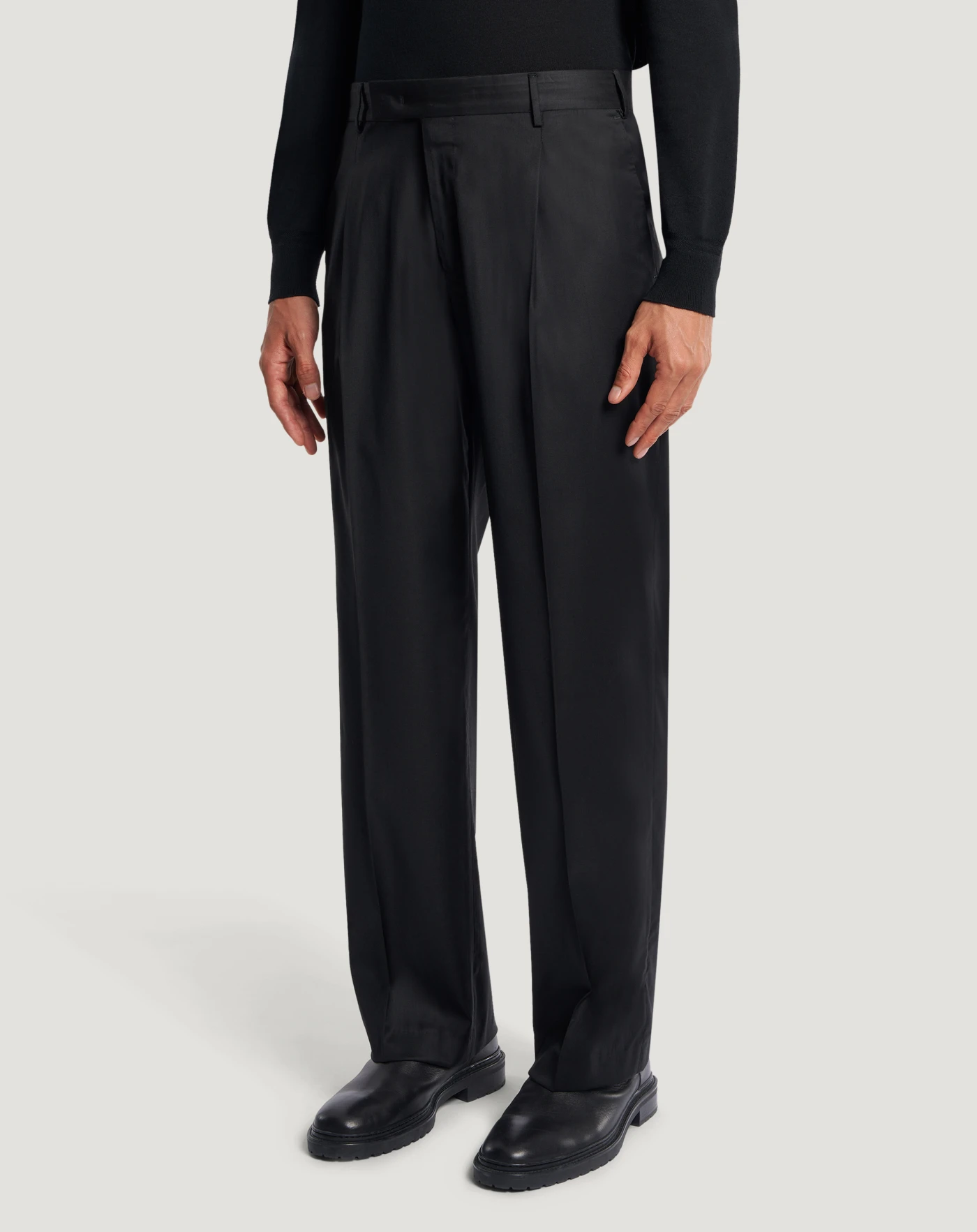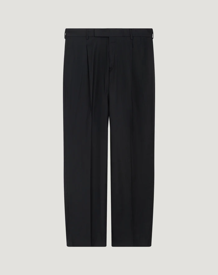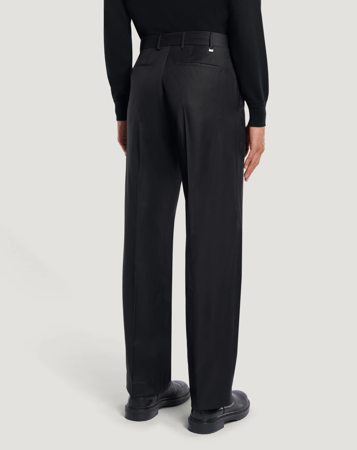 Trousers in stretch wool twill, a fine diagonal weave fabric with a fluid texture and a slightly stretchy component that guarantees comfort and freedom of movement.With a wide tailored fit and front pleat, choose the black variant for elegant and formal looks.