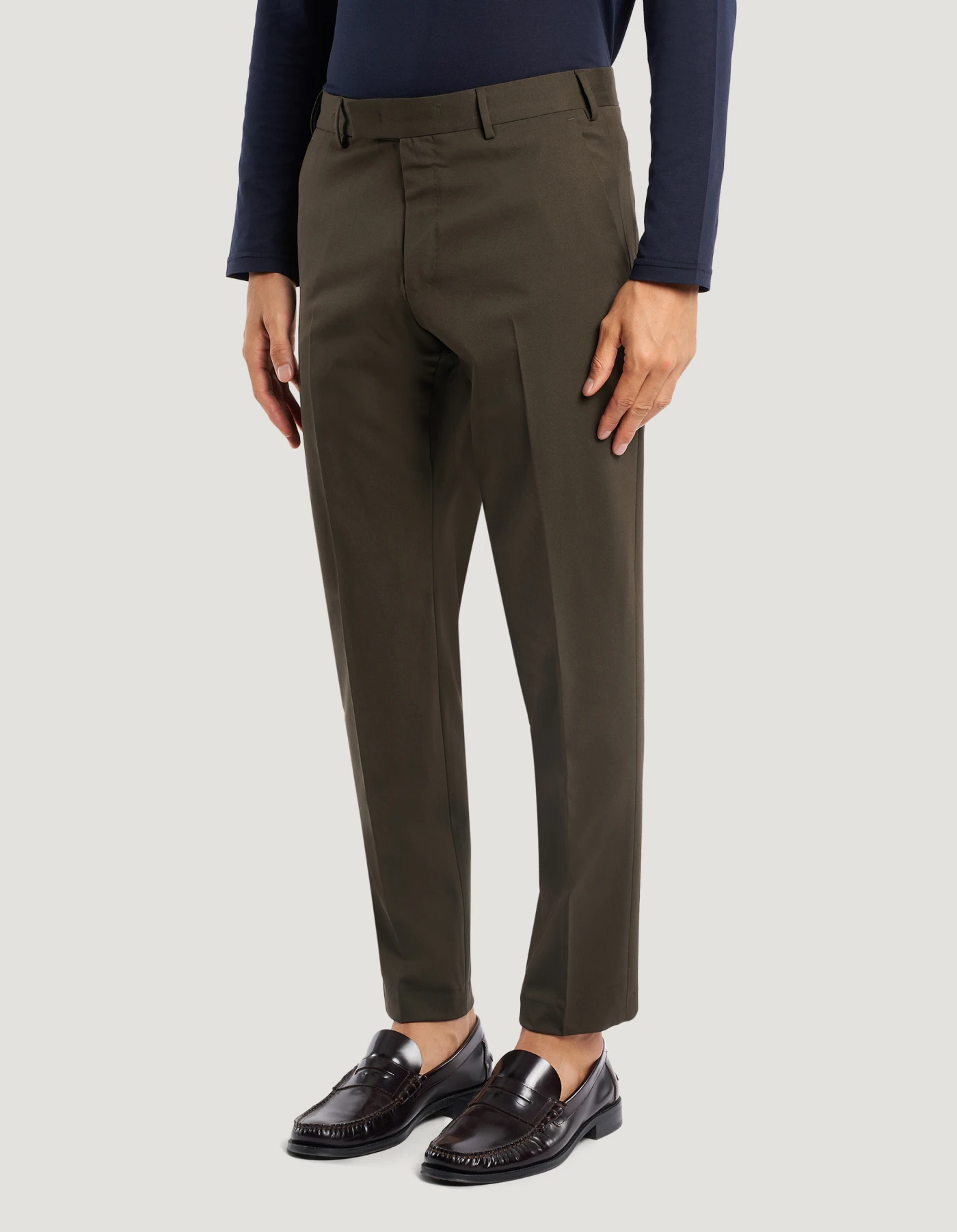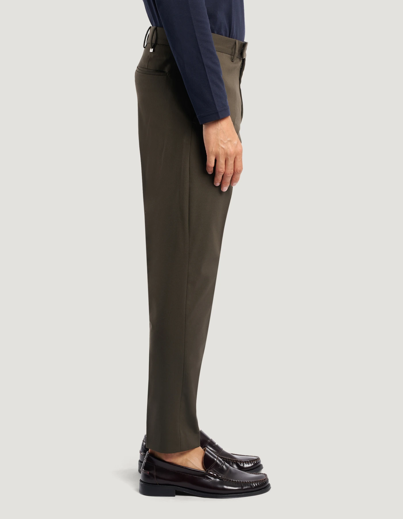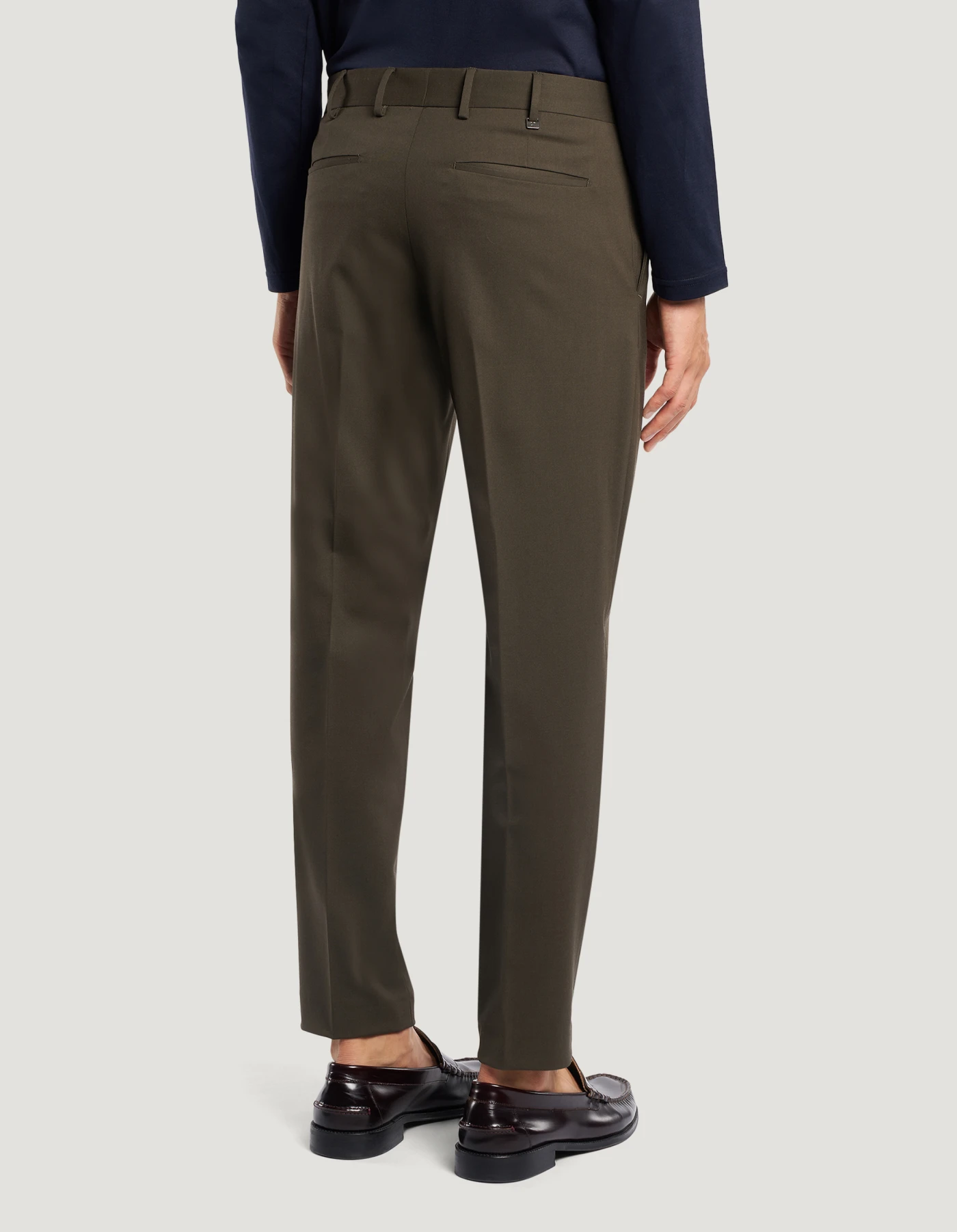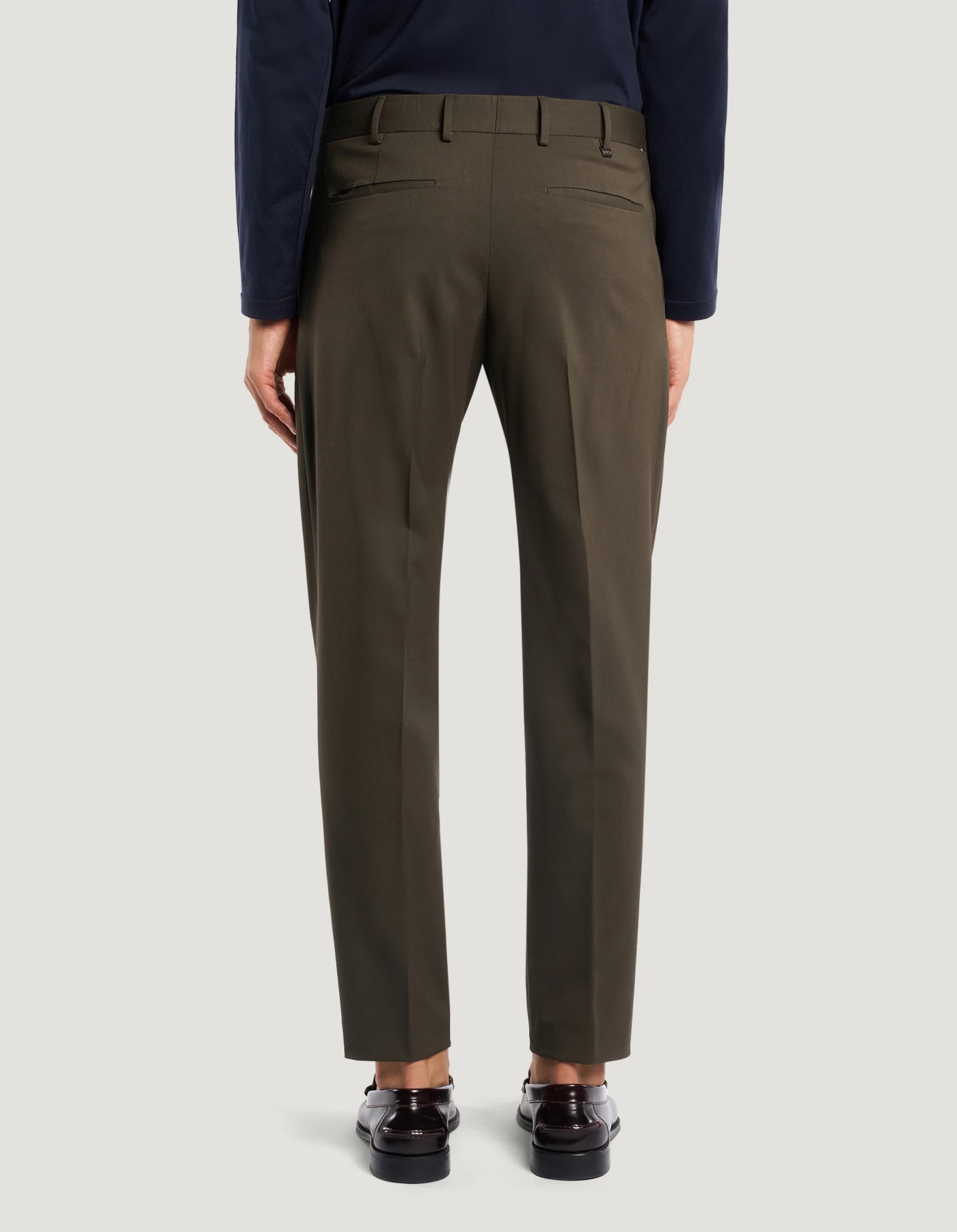 Trousers in bi-stretch batavia wool, a fabric distinguished by a stretch weave that adapts to the body’s movements, ensuring a look that is both elegant and comfortable yet light.Featuring a relaxed tailored design, these ankle-length trousers with a smooth front are perfect too add a casual touch to workwear or to complete your everyday style. In the military green variant to add character to your style.