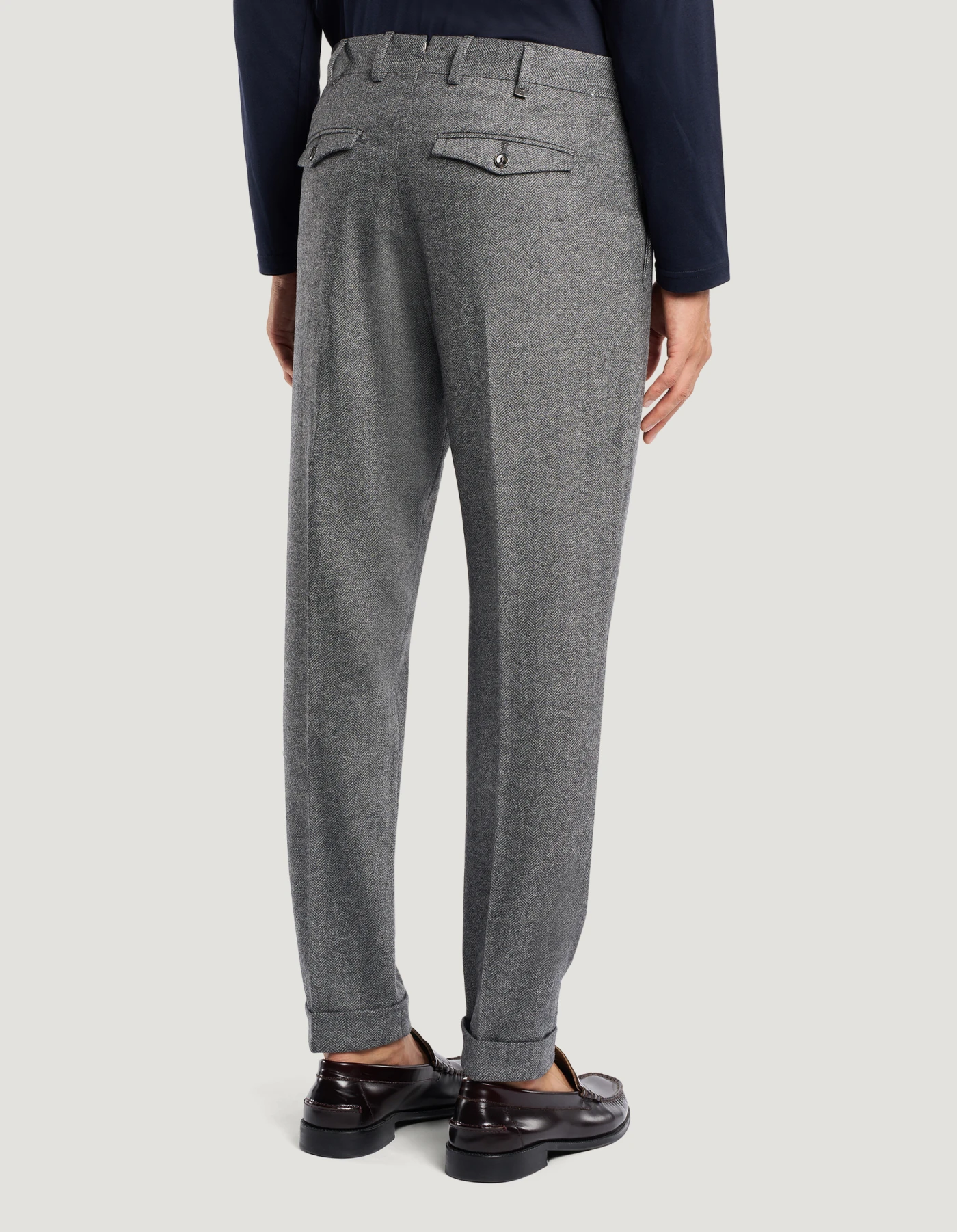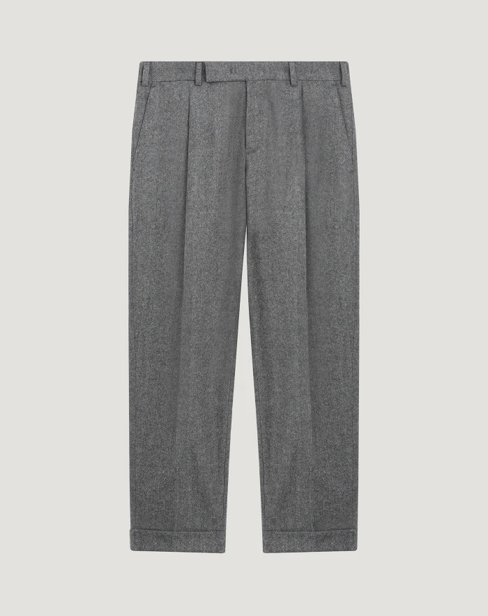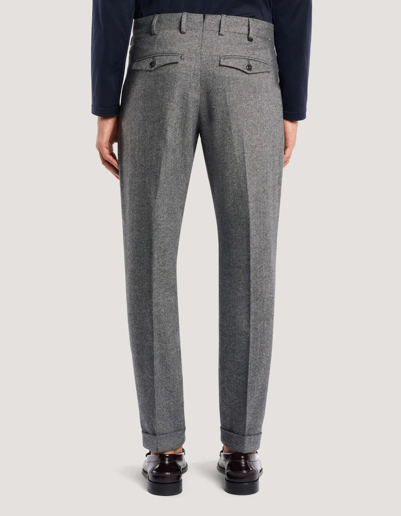 Trousers in wool and cashmere flannel, a soft and refined fabric with a micro chevron pattern.Featuring a relaxed tailored design, these ankle-length trousers with front pleat are the perfect casual look for work or to complete your everyday style.