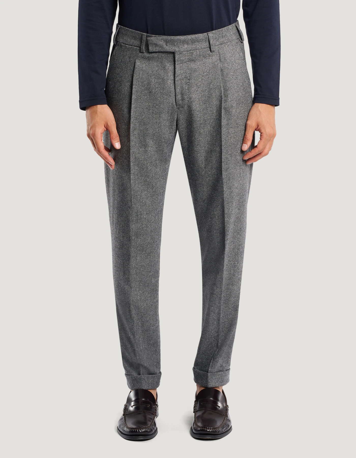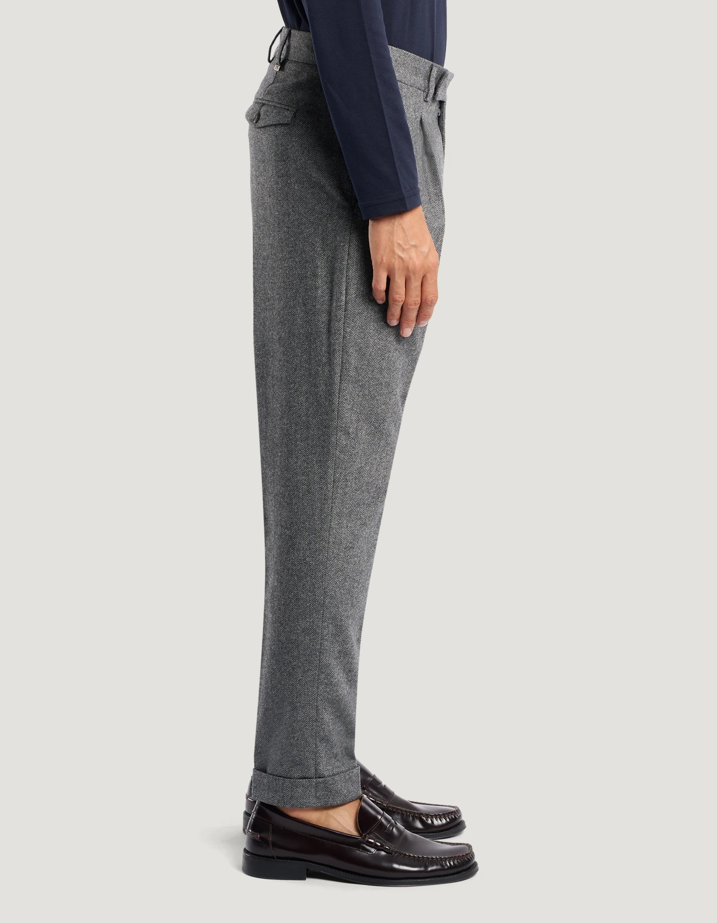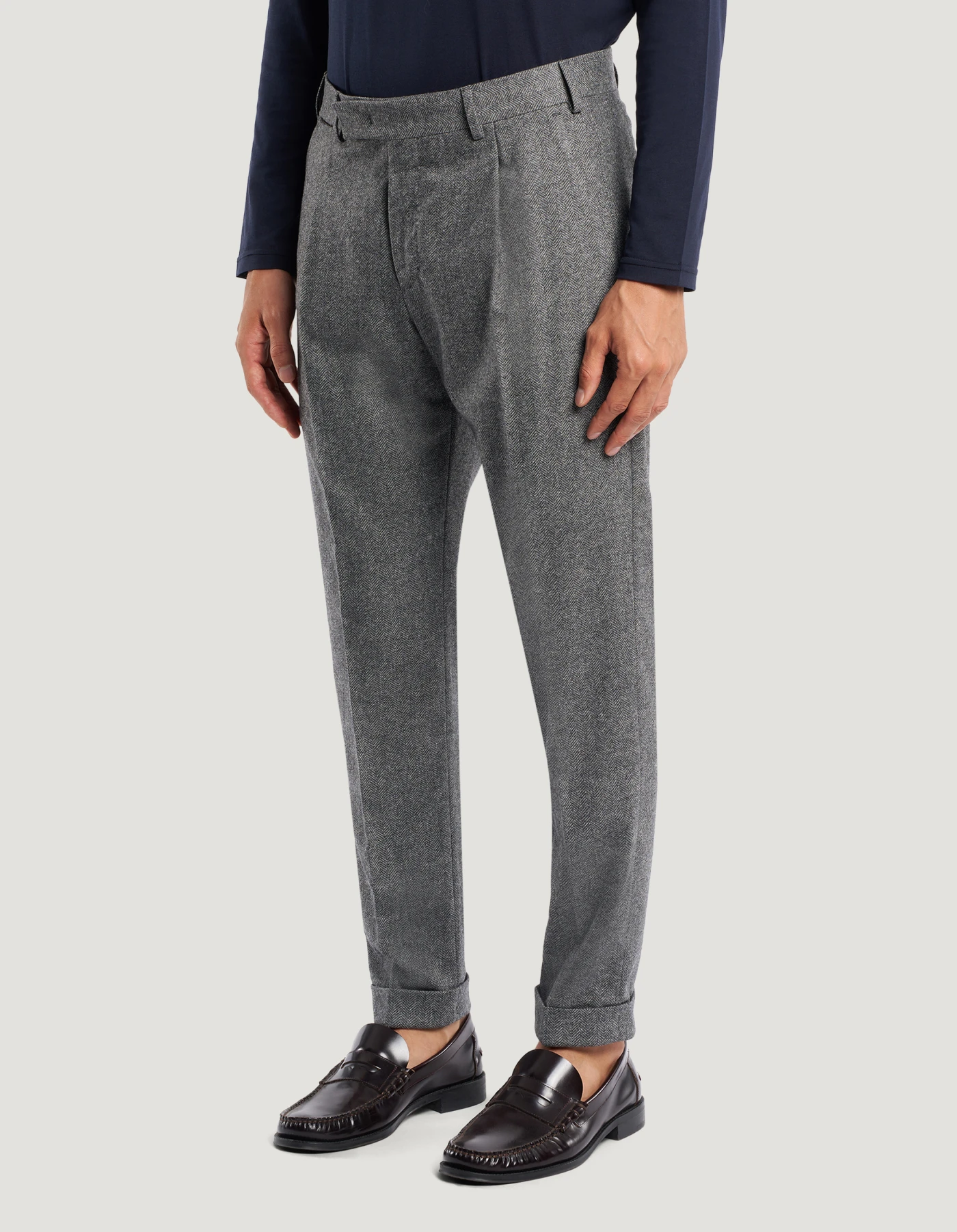 Trousers in wool and cashmere flannel, a soft and refined fabric with a micro chevron pattern.Featuring a relaxed tailored design, these ankle-length trousers with front pleat are the perfect casual look for work or to complete your everyday style.