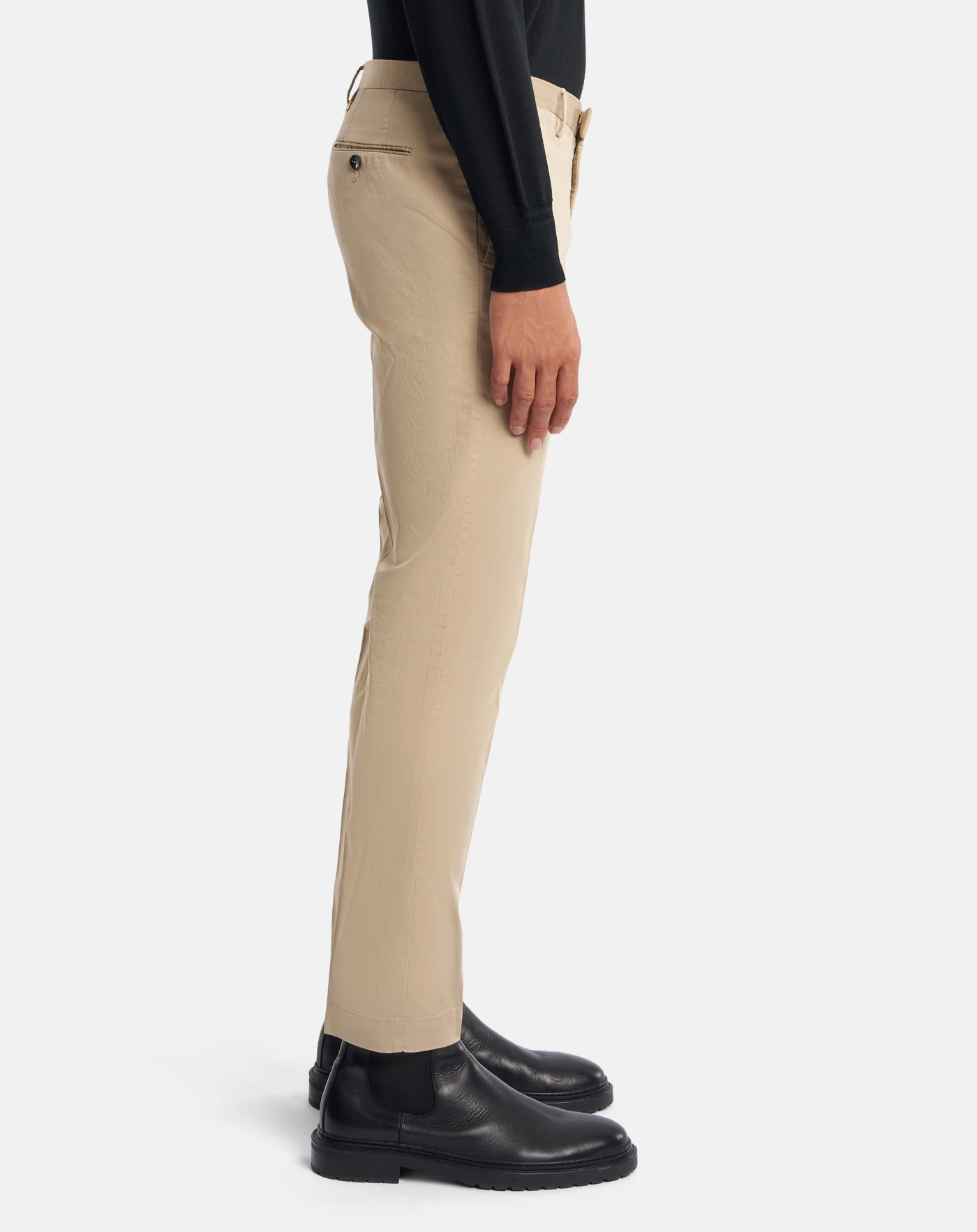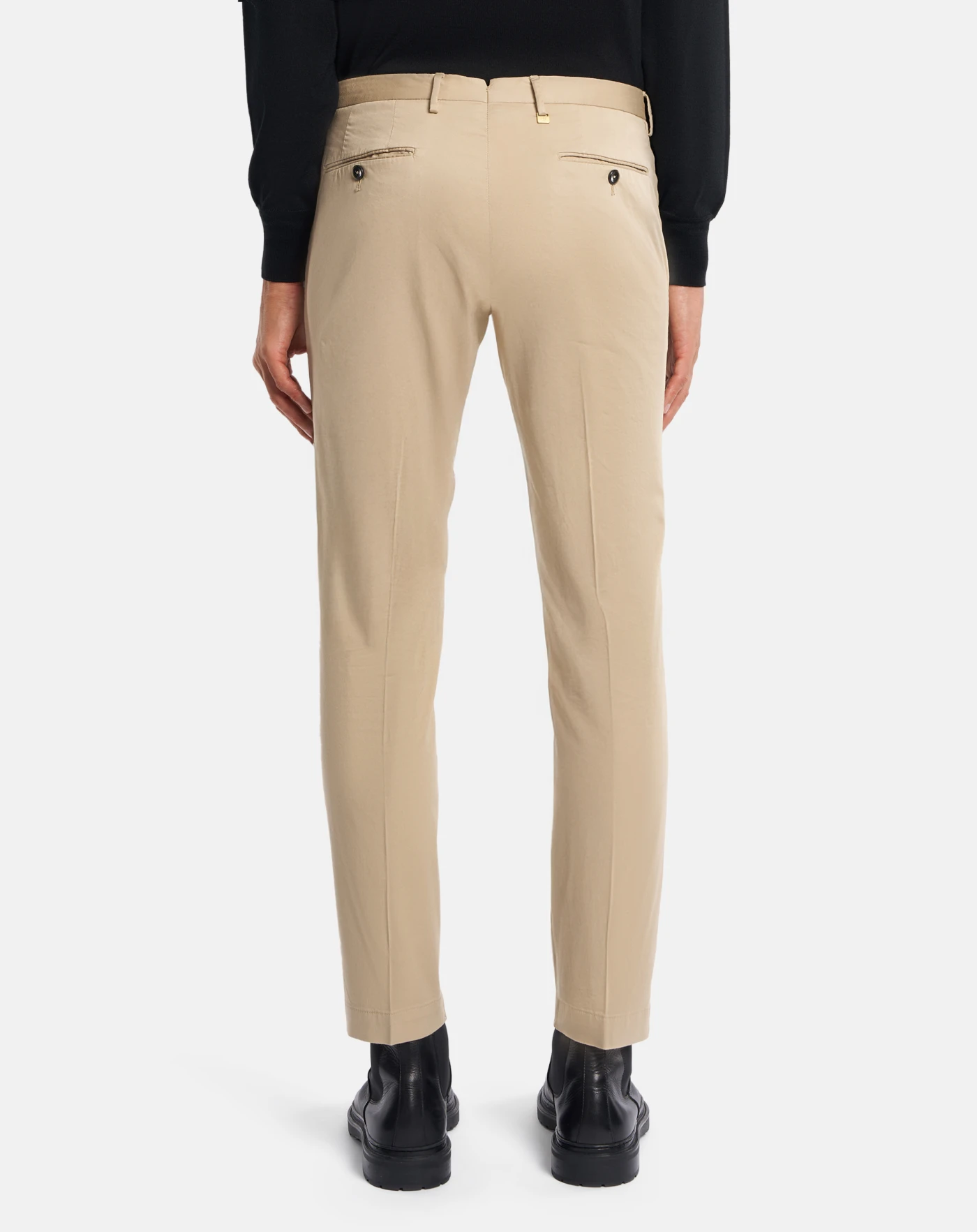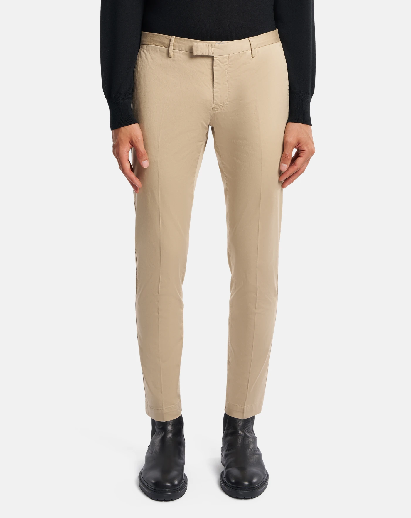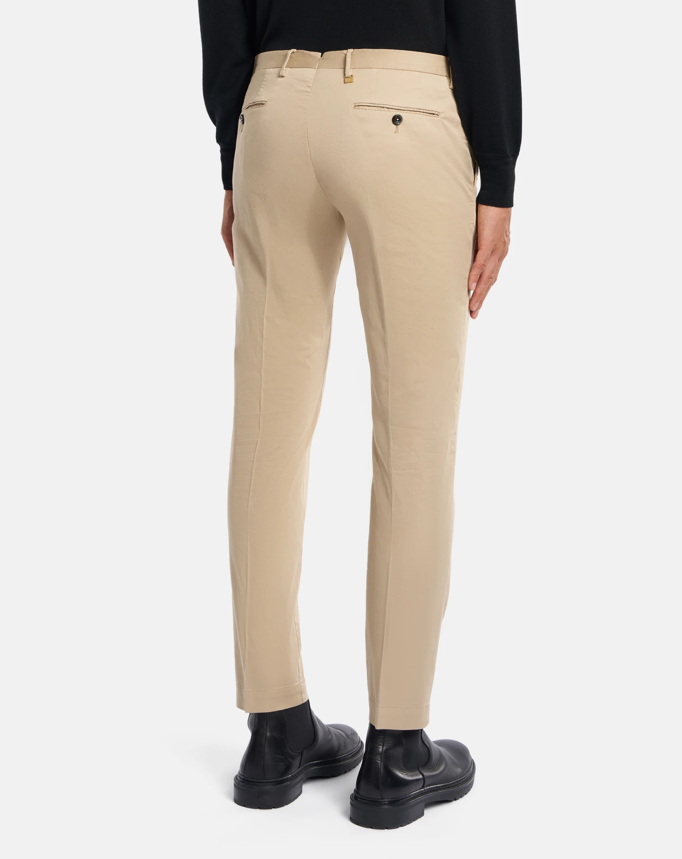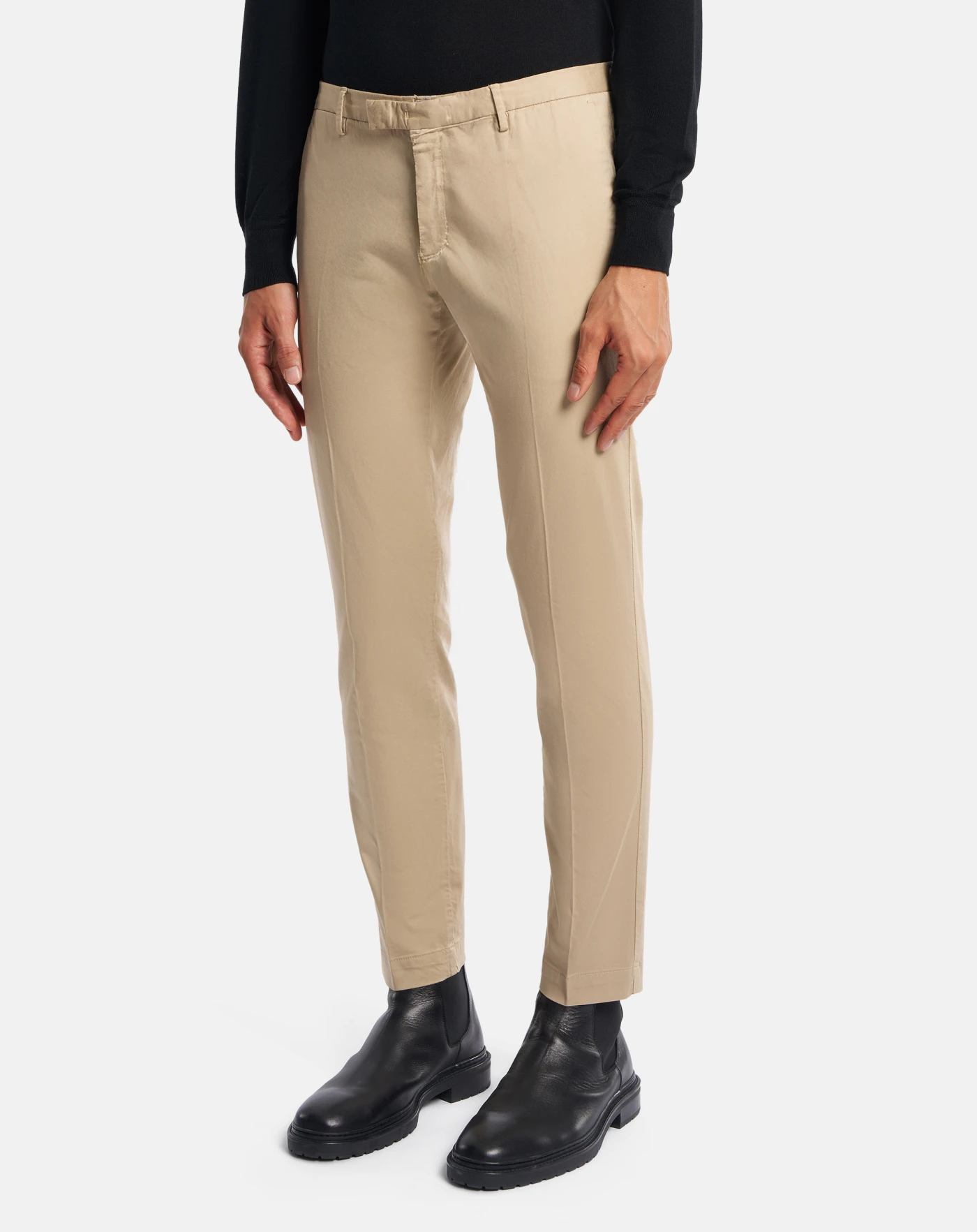 Trousers in stretch lightweight satin, a compact and fluid fabric with a refined appearance.The garment is delivered with an unstitched hem, so that it can be finished to suit your length and style through a simple tailoring adjustment. Choose the cool beige variant for a neutral wardrobe piece that is easy to match.