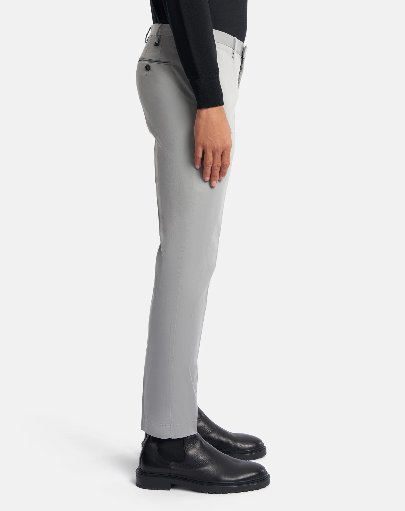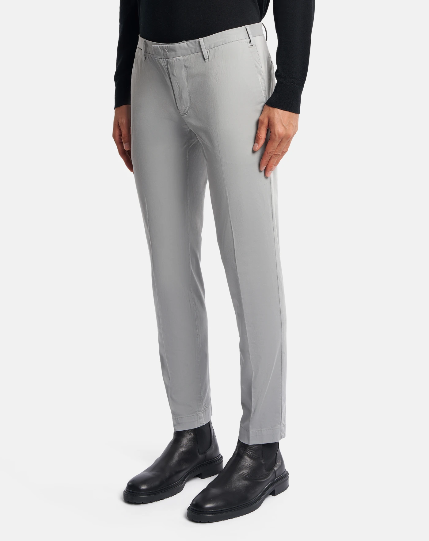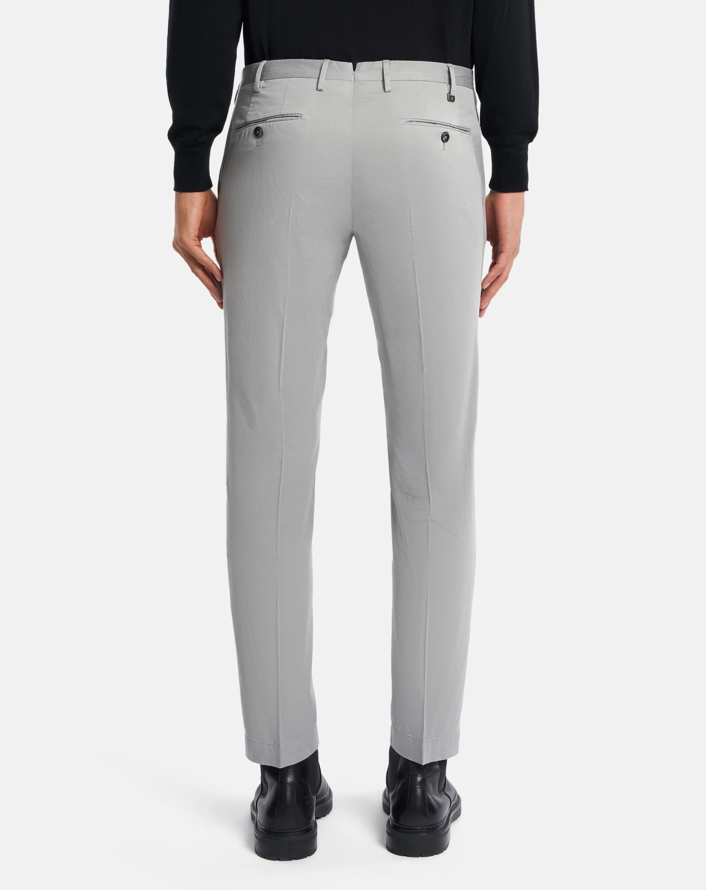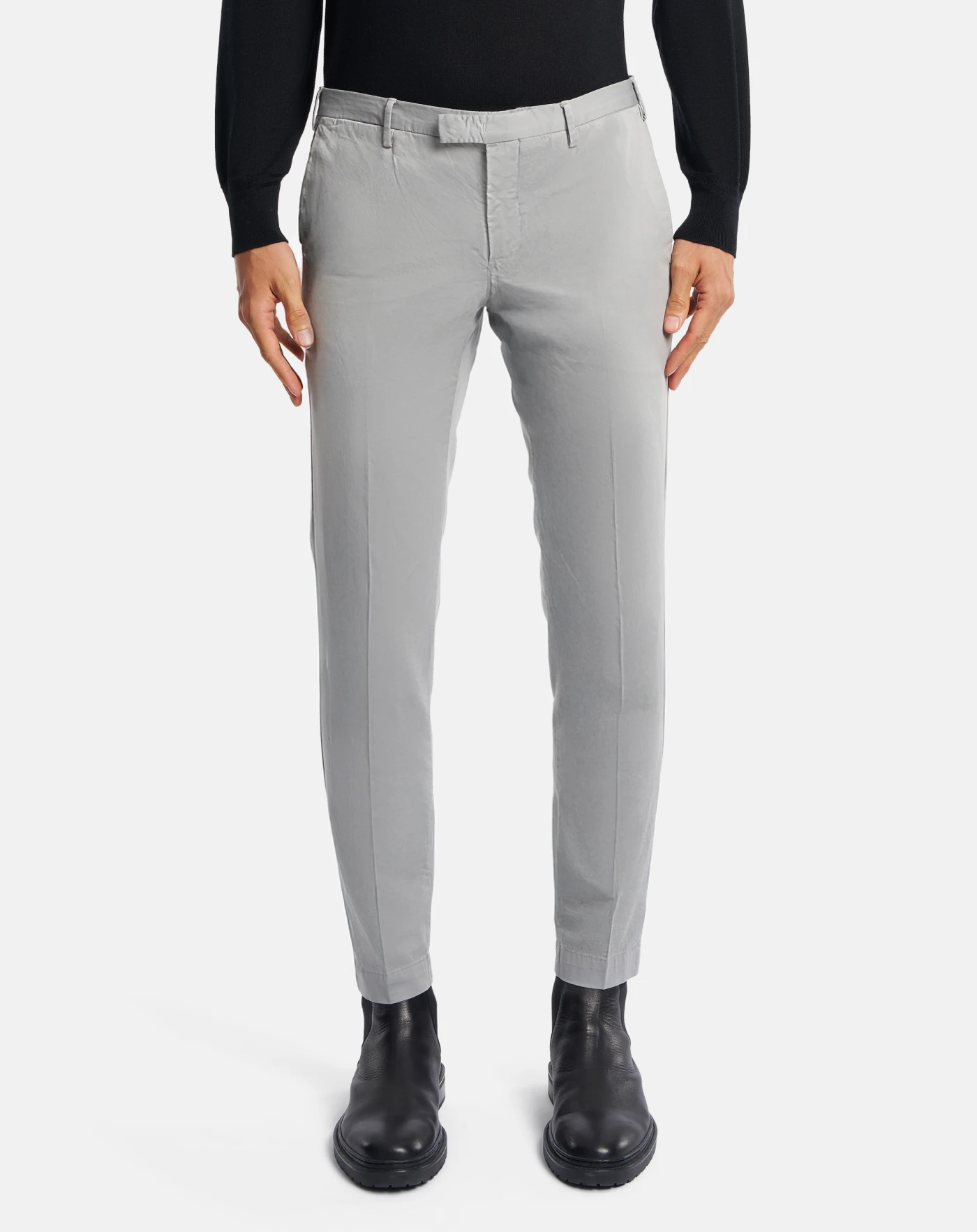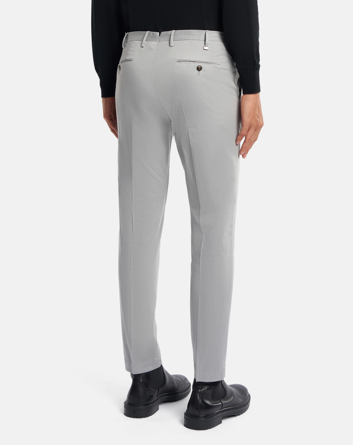 Trousers in stretch lightweight satin, a compact and fluid fabric with a refined appearance.The garment is delivered with an unstitched hem, so that it can be finished to suit your length and style through a simple tailoring adjustment. The dark grey variant is ideal for all your elegant and formal looks.