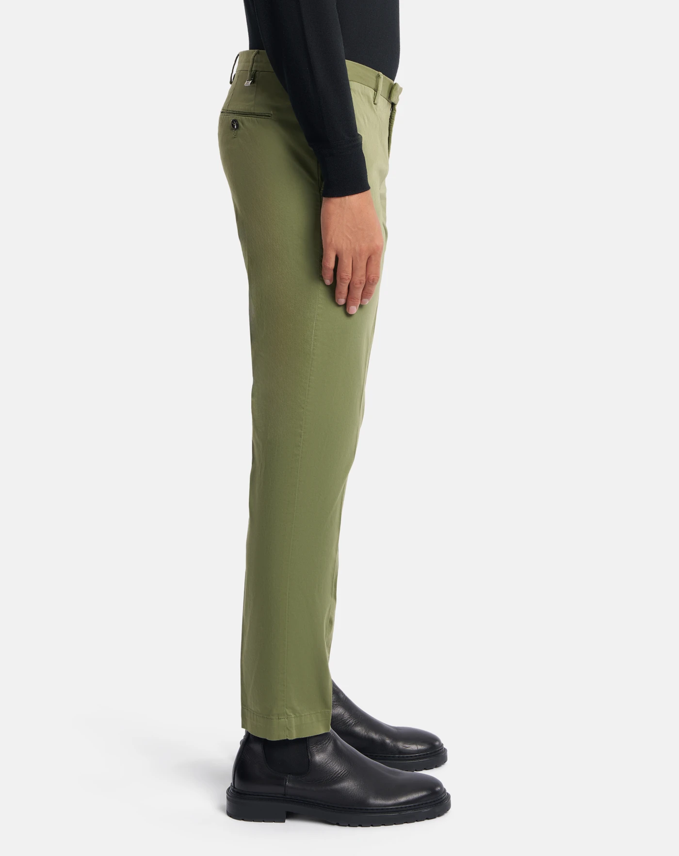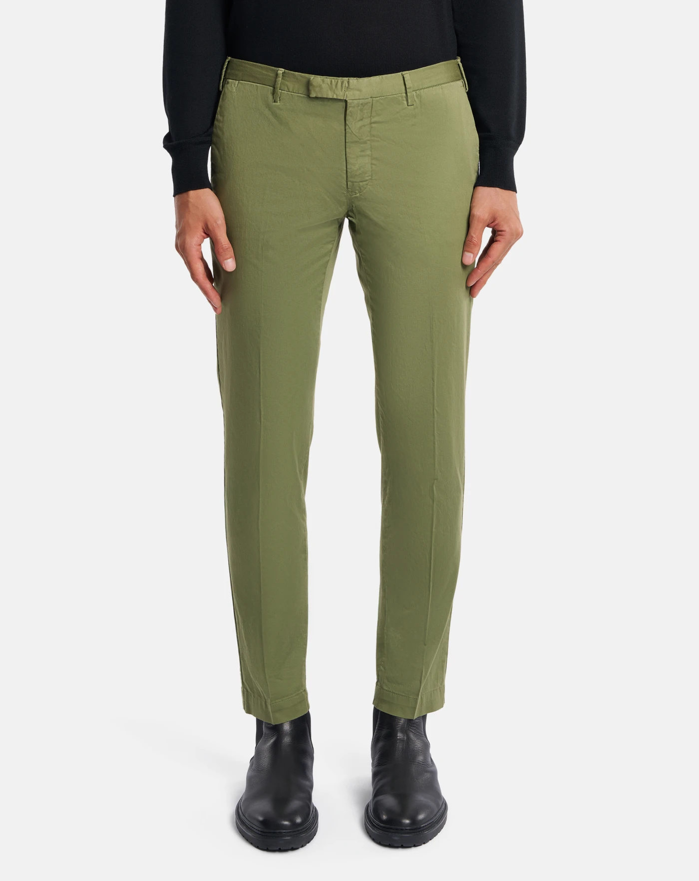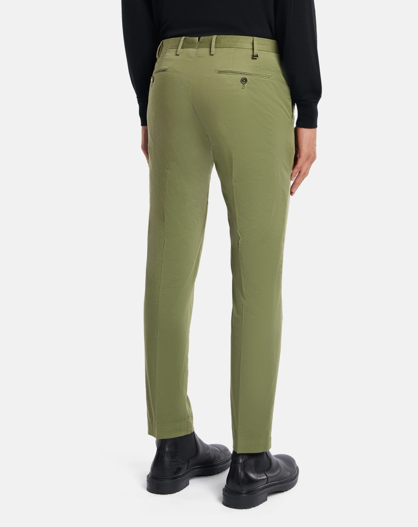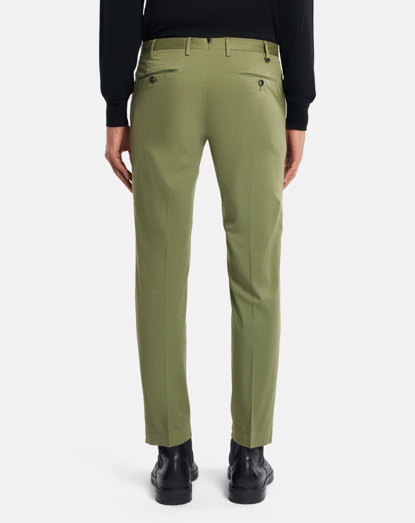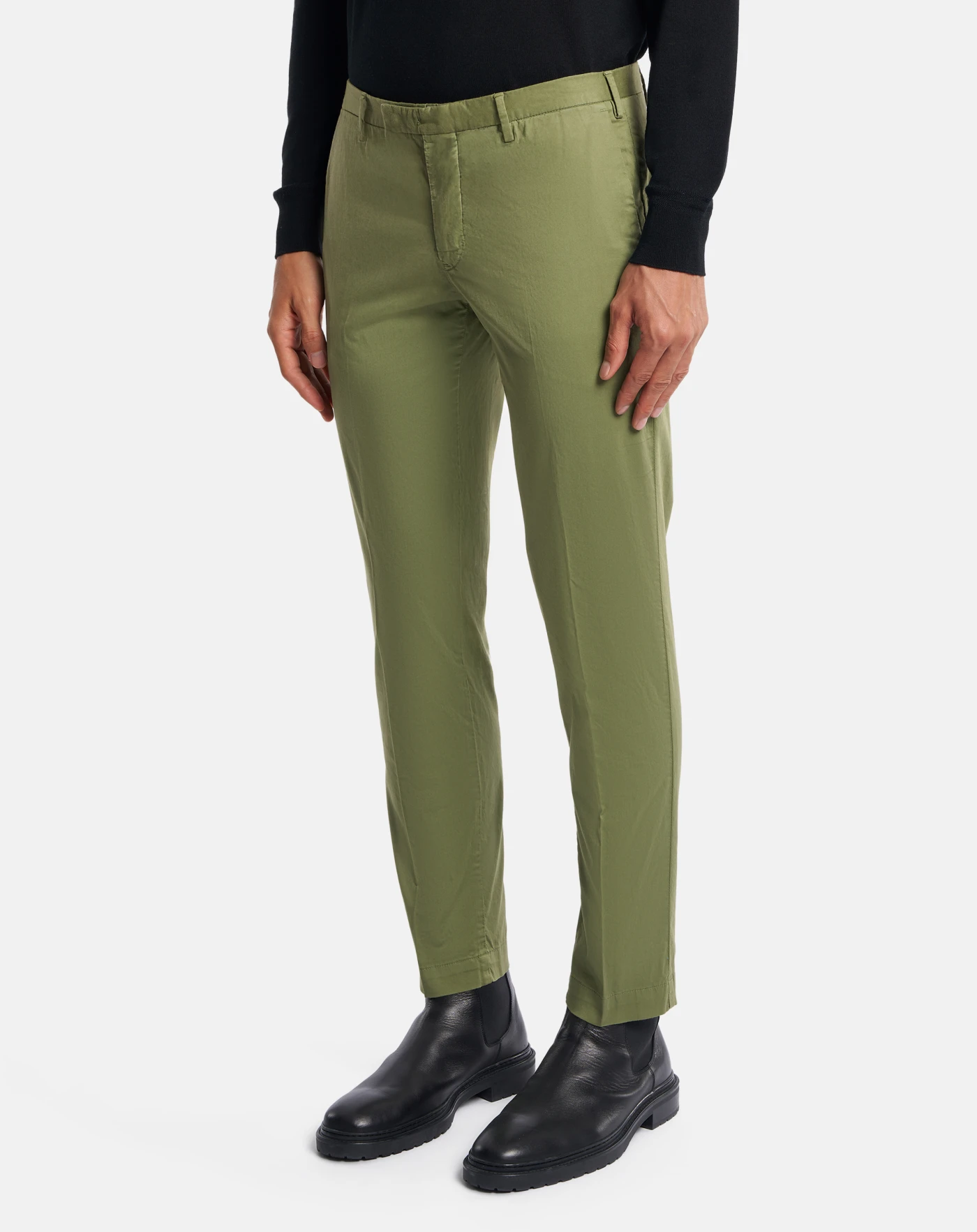 Trousers in stretch lightweight satin, a compact and fluid fabric with a refined appearance.The garment is delivered with an unstitched hem, so that it can be finished to suit your length and style through a simple tailoring adjustment. The sand green variant adds a delicate touch of colour to formal looks.
