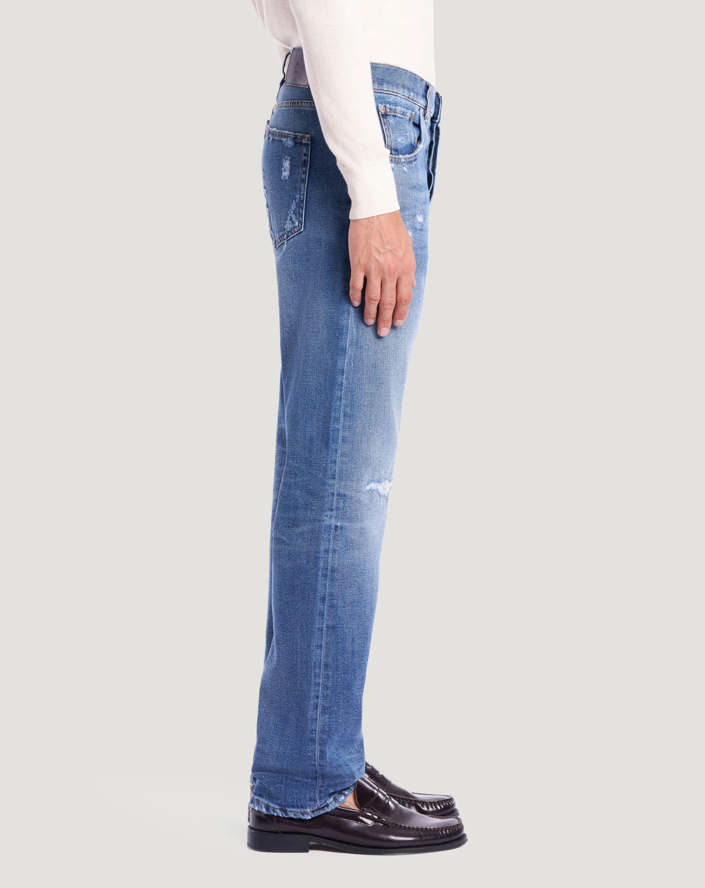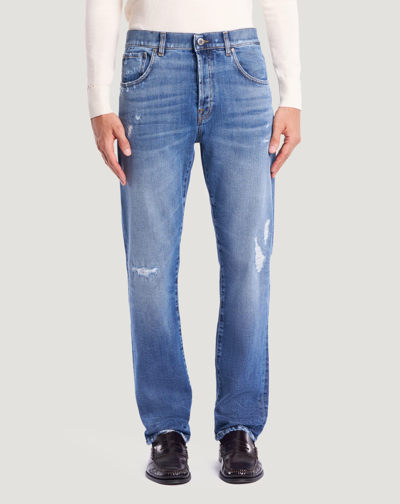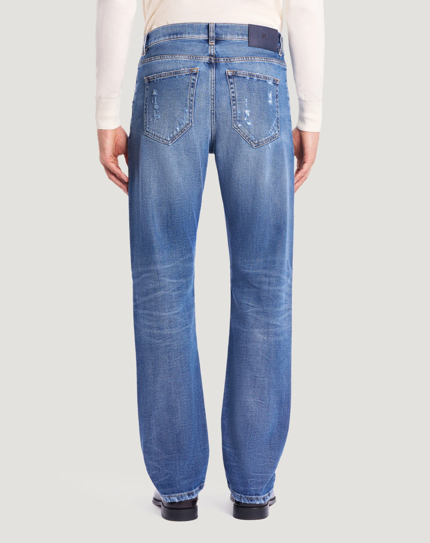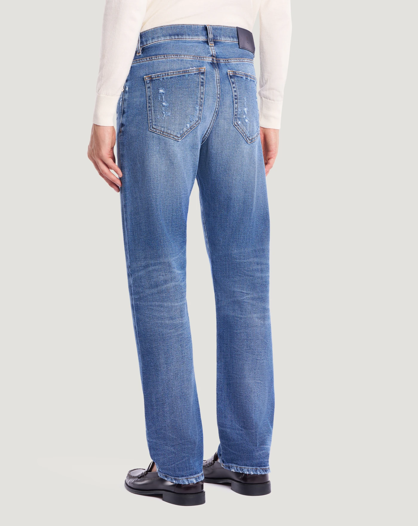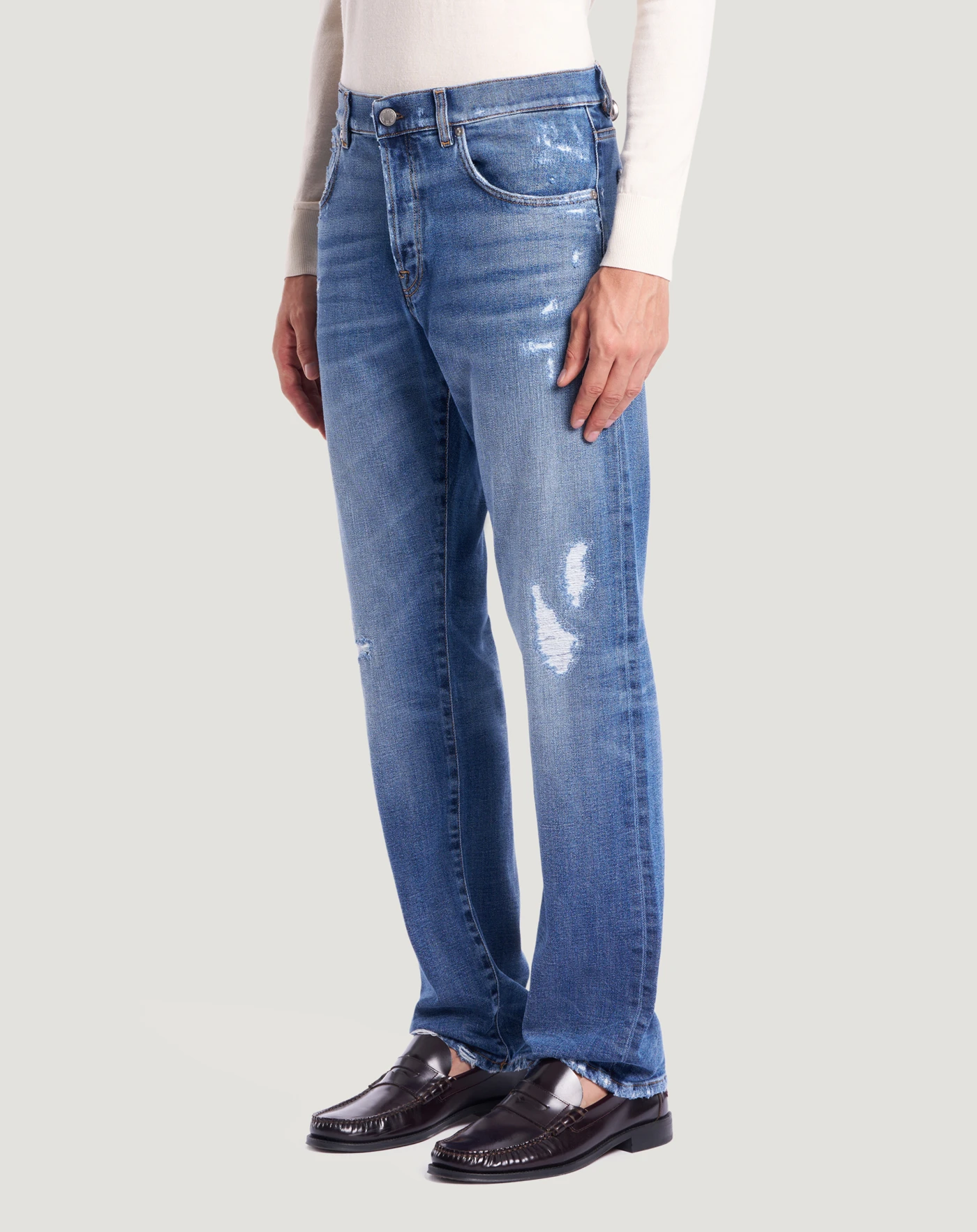 Jeans in stretch denim, a soft, comfortable and durable fabric (12 oz) with a wash featuring localised fading and tears.With five pockets and a regular fit, they are perfect to add character to casual and leisure looks.