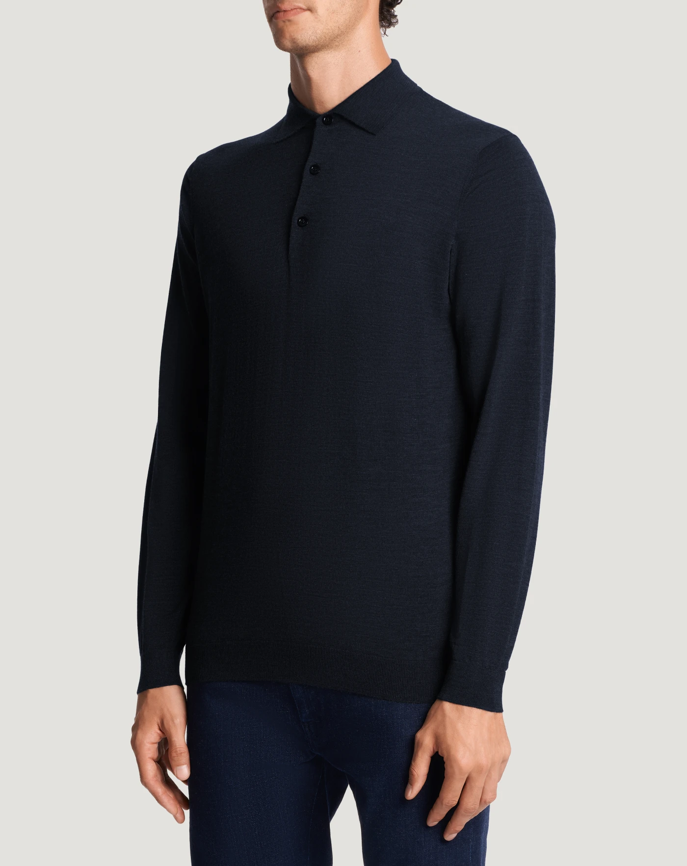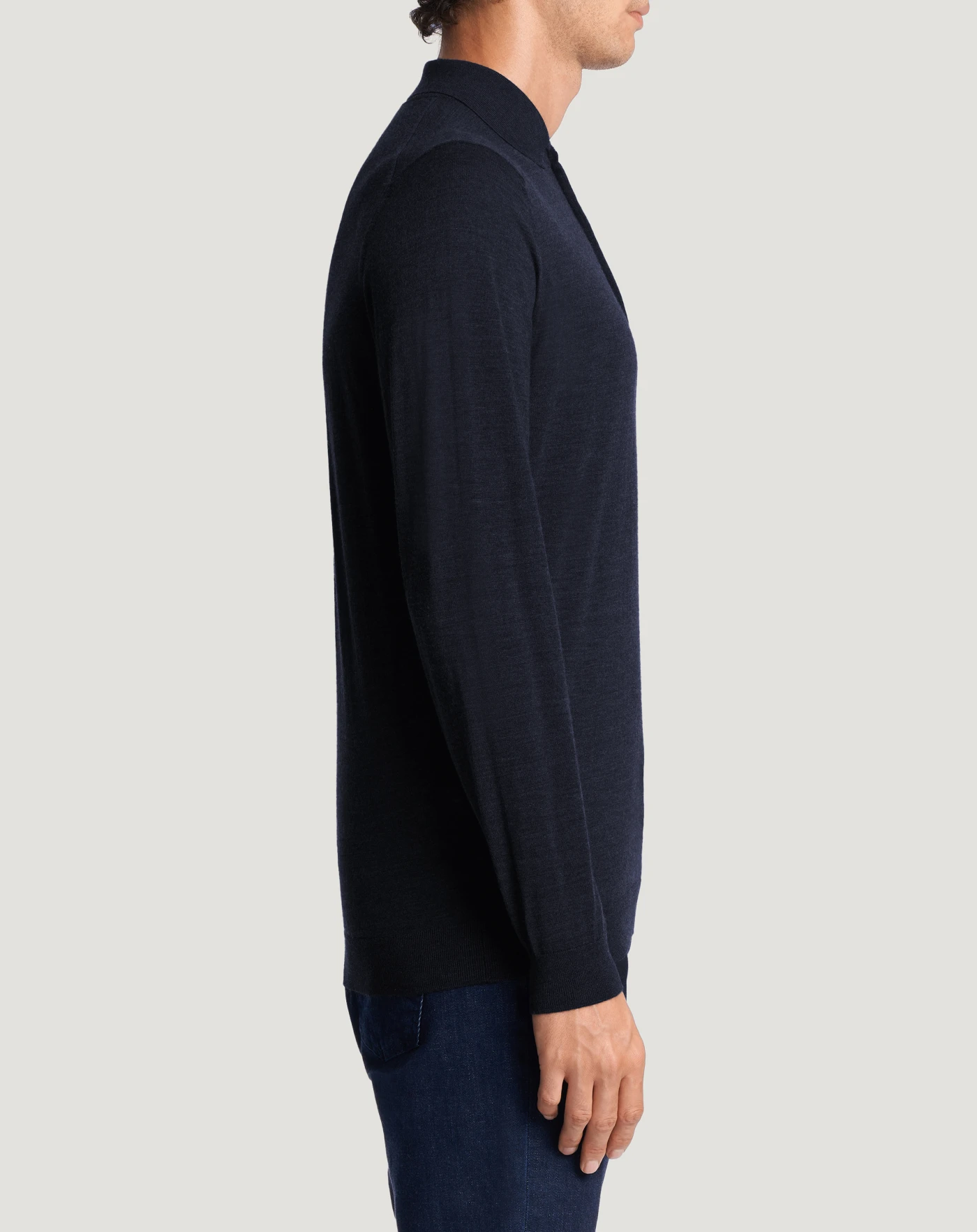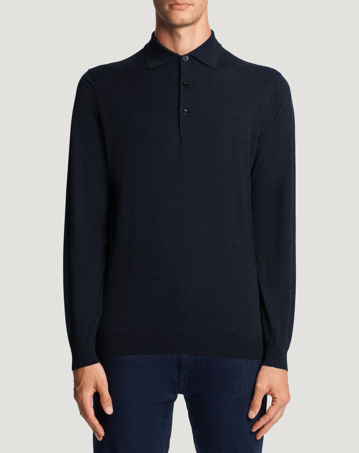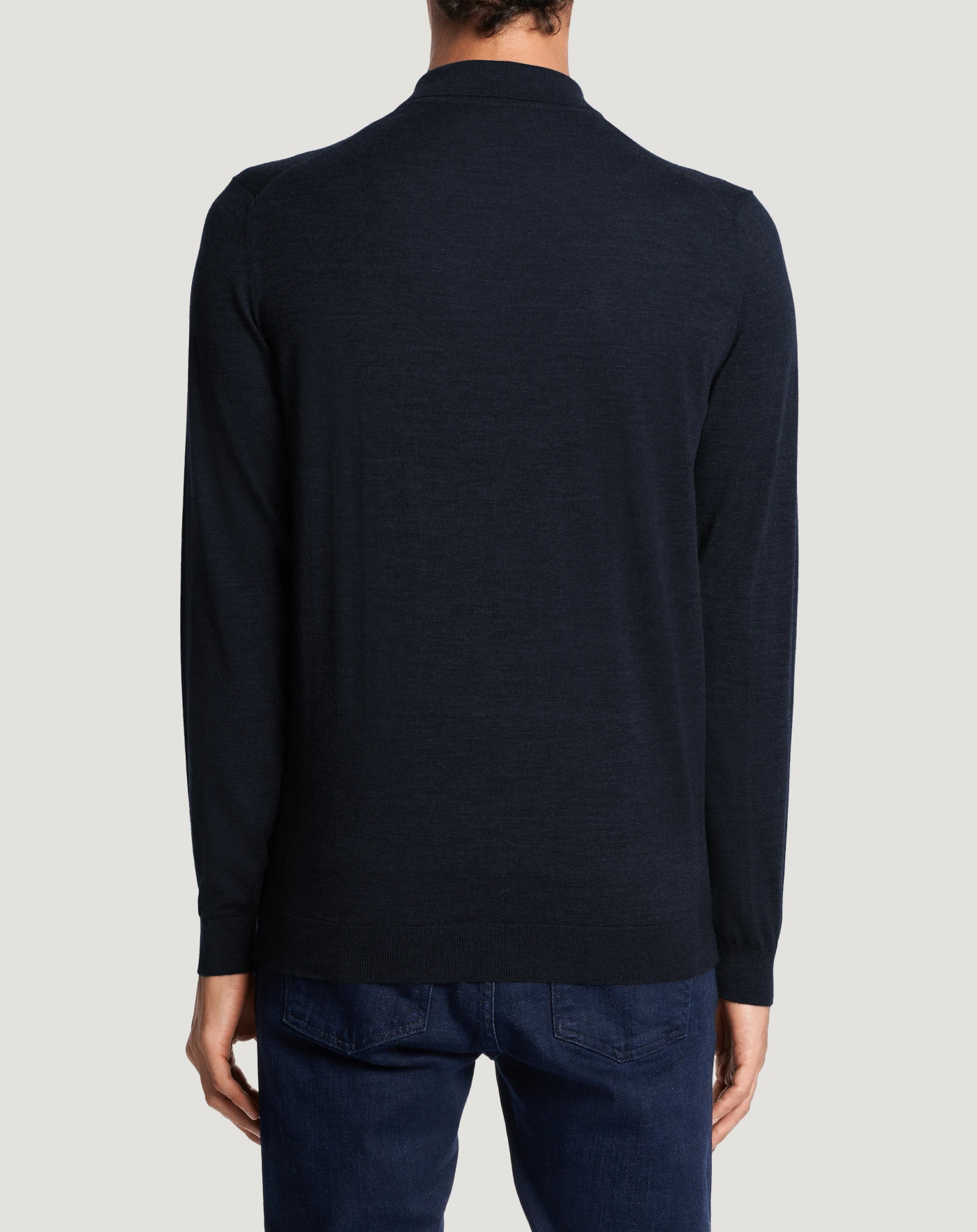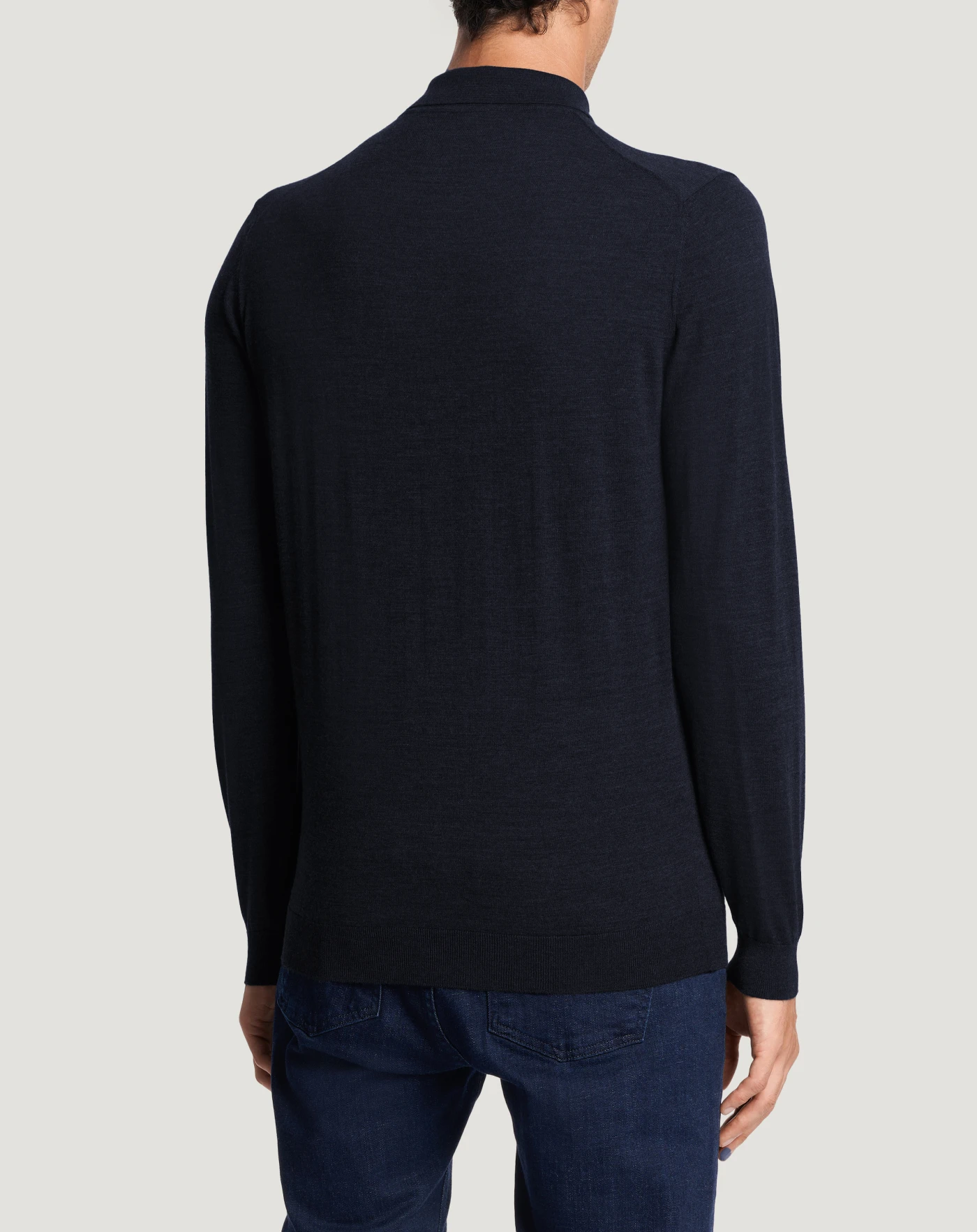 Polo neck jumper in pure Super 180 wool, impalpably refined and with fineness of 16, for a very light and comfortable garment.With collar and buttons, its essential and versatile design and slim fit can complete formal and casual looks. Choose the navy blue variant for an edgy vibe.