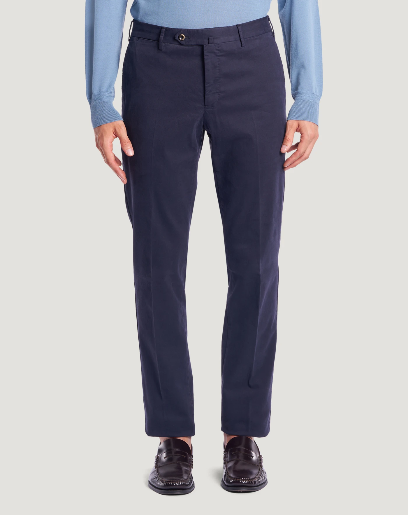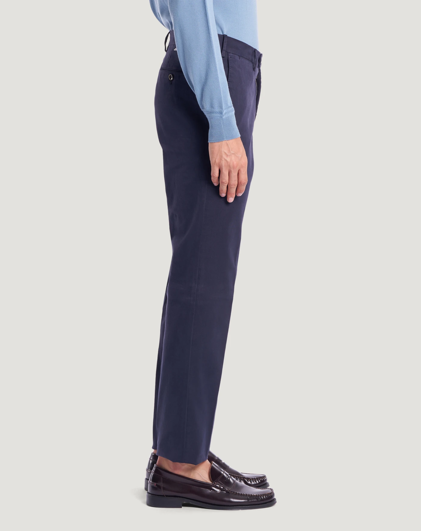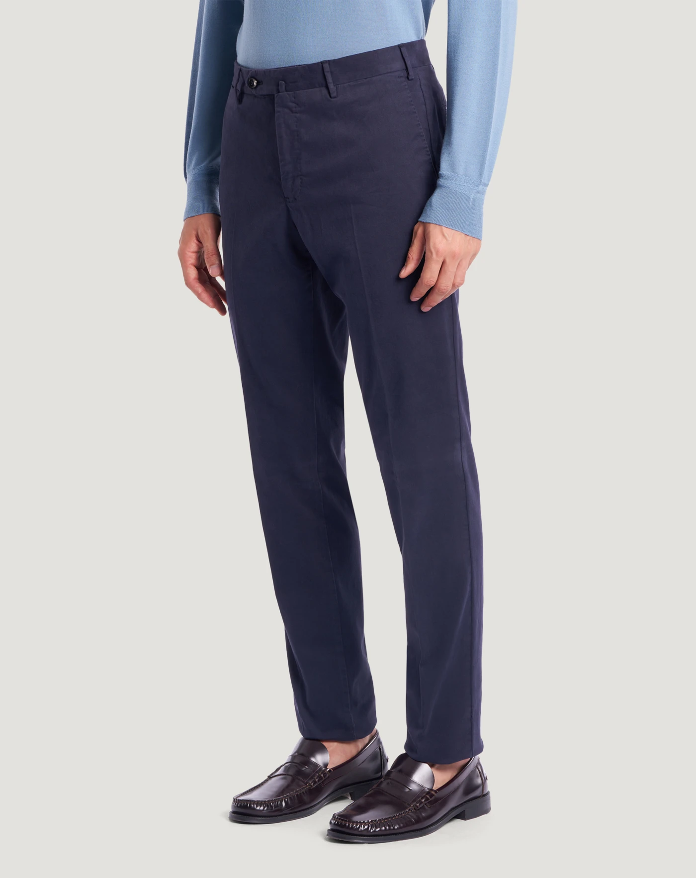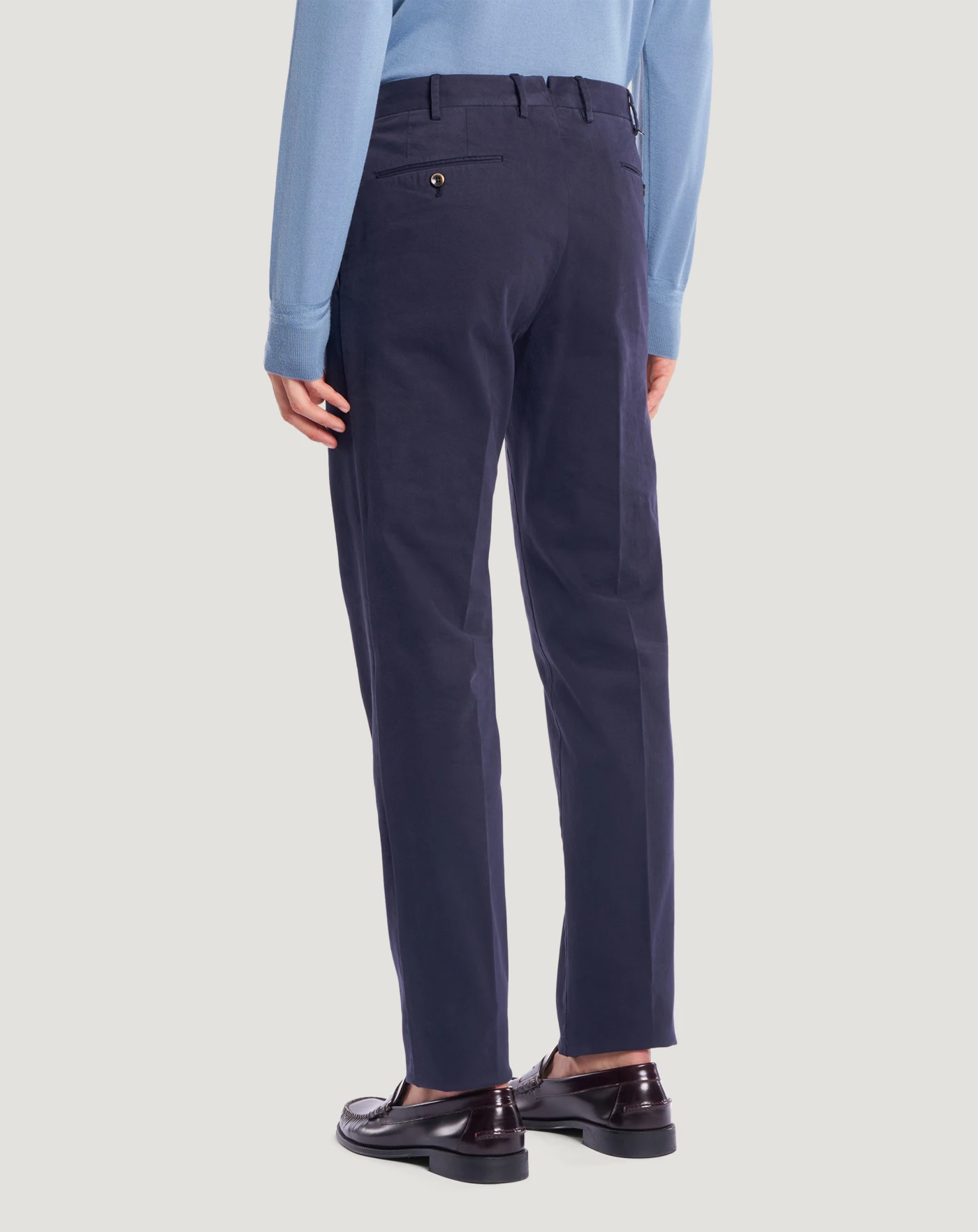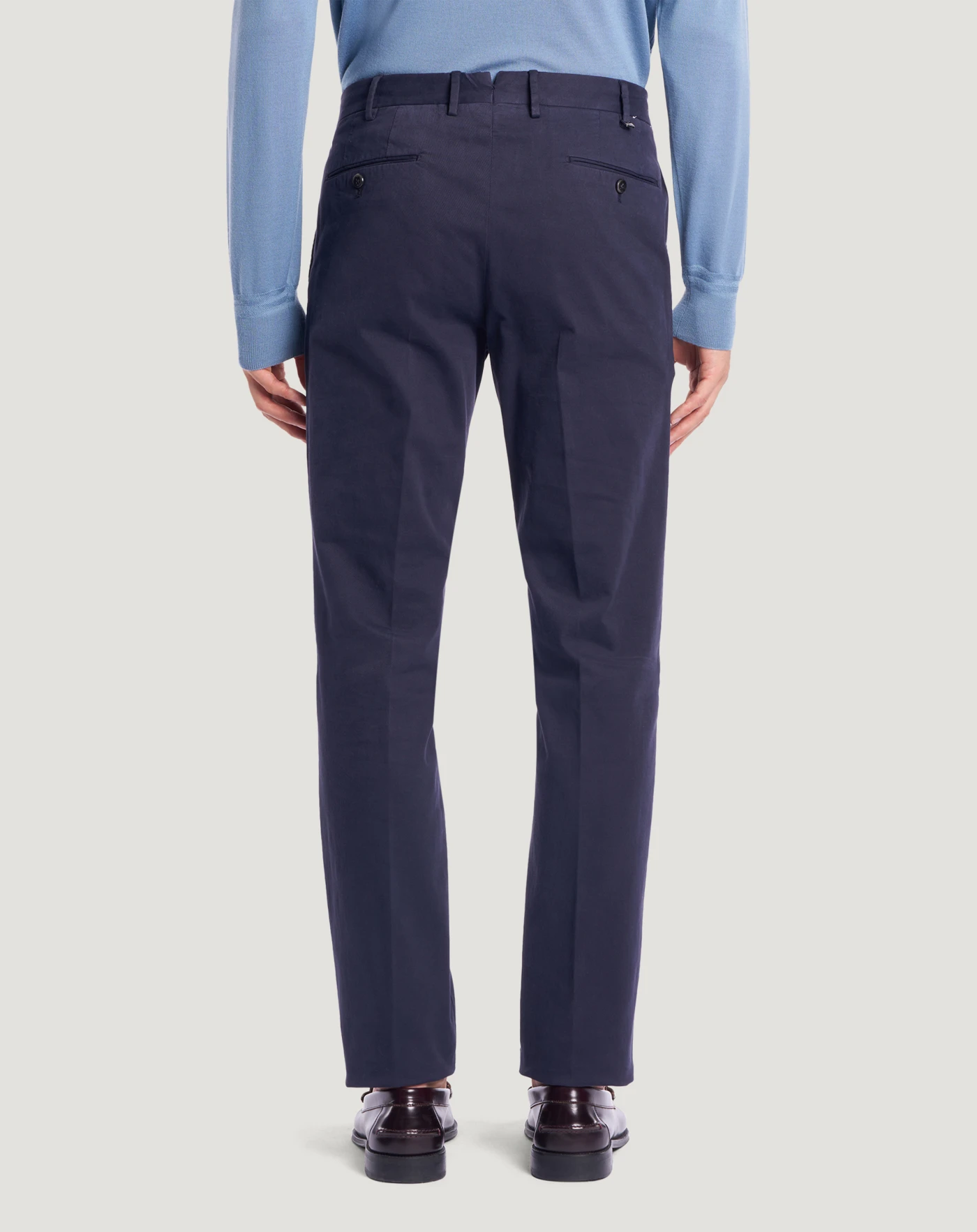 Trousers in stretch cotton winter gabardine with a compact and warm structure. Designed for the cold season, it combines comfort and durability with a soft, enveloping feel.The garment is delivered unstitched, so that it can be finished to suit your length and style through simple tailoring.Choose the midnight blue variant for unique formal looks.