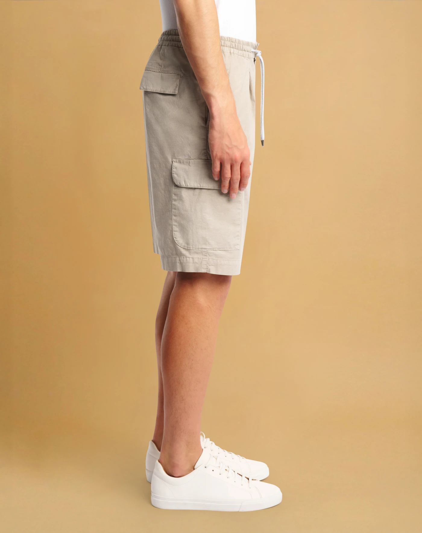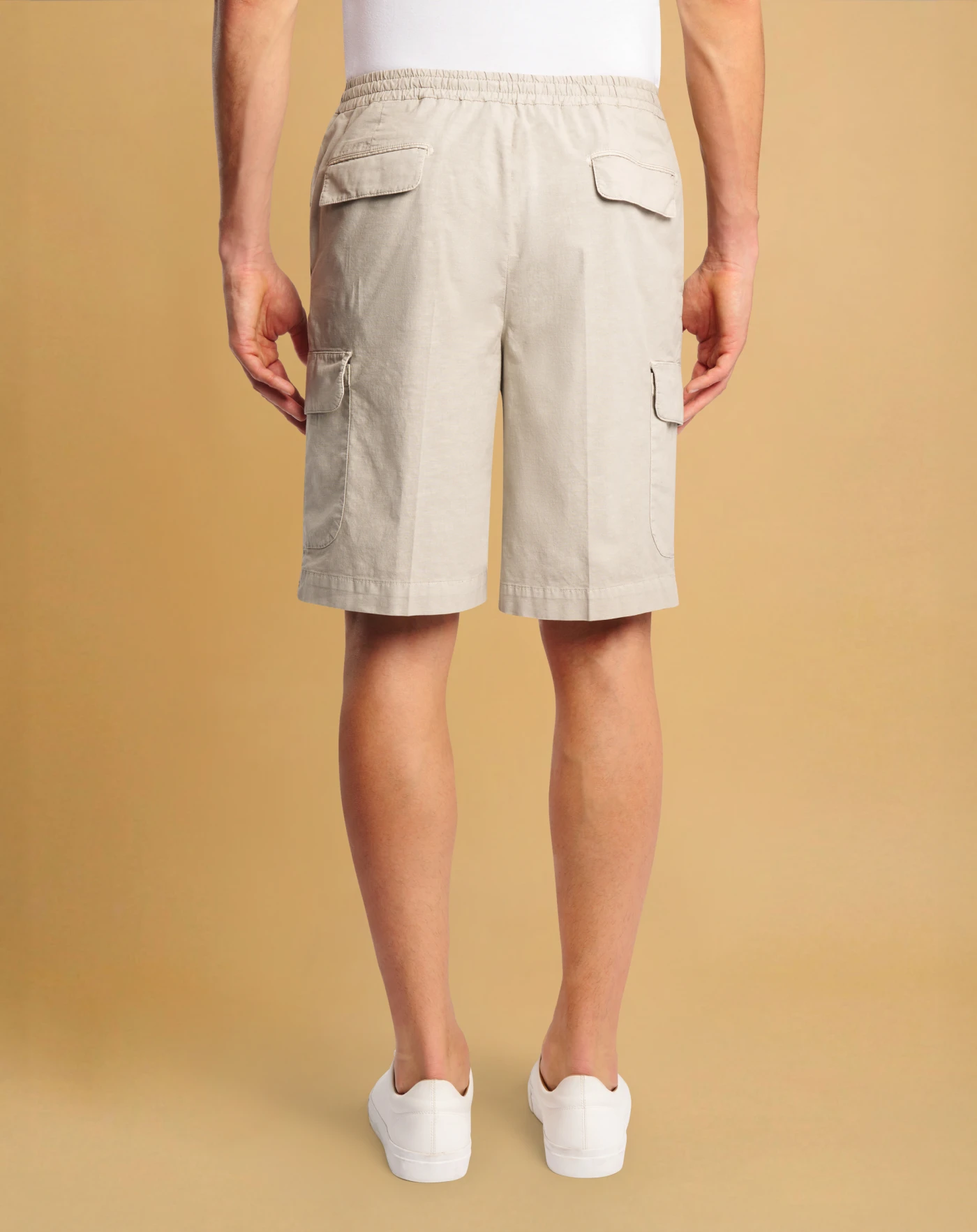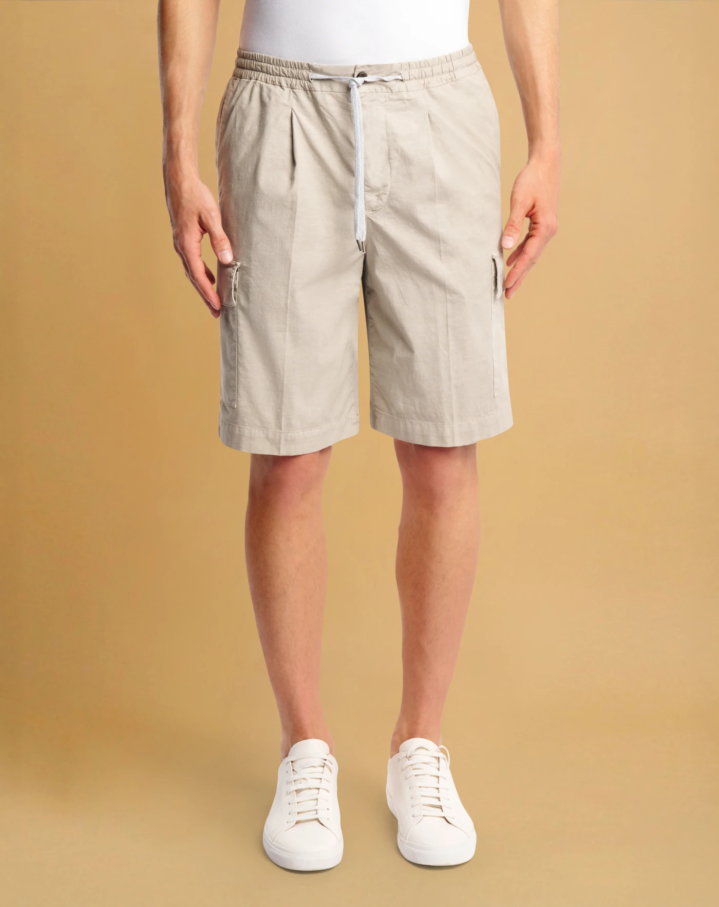Bermuda in cotone e lino stretch un tessuto con armatura twill arricchito da una componente stretch che ne aumenta comfort e versatilità. Con elastico in vita e tasche con patta ai fianchi, sono ideali per completare look urbani casual, con personalità. In variante beige per look quotidiani essenziali e attuali.