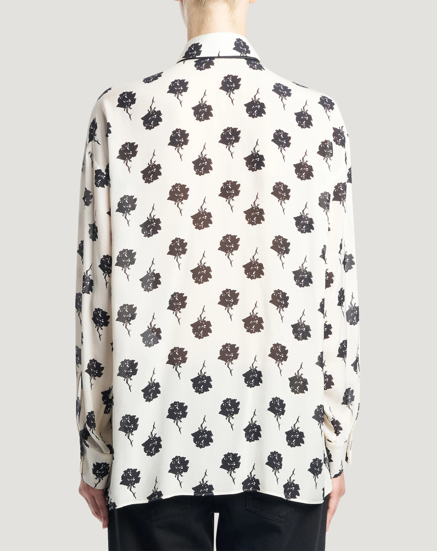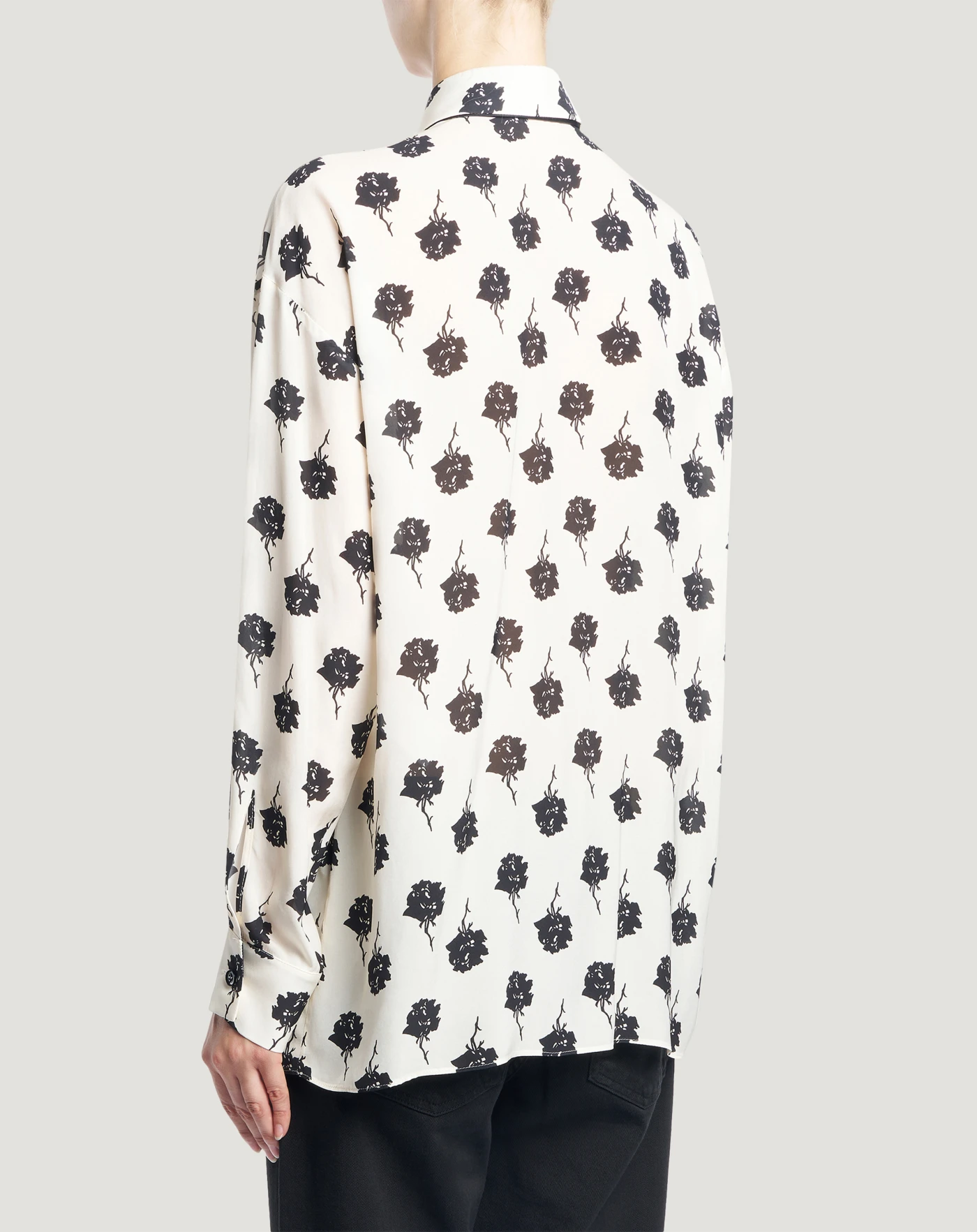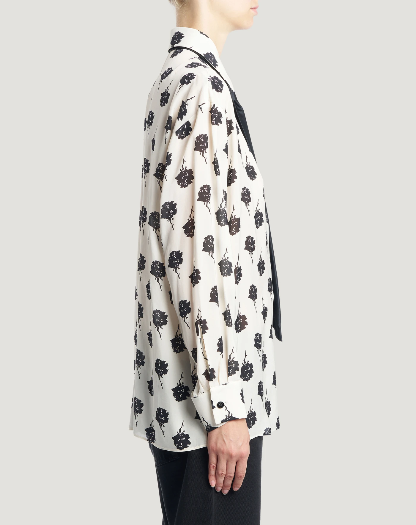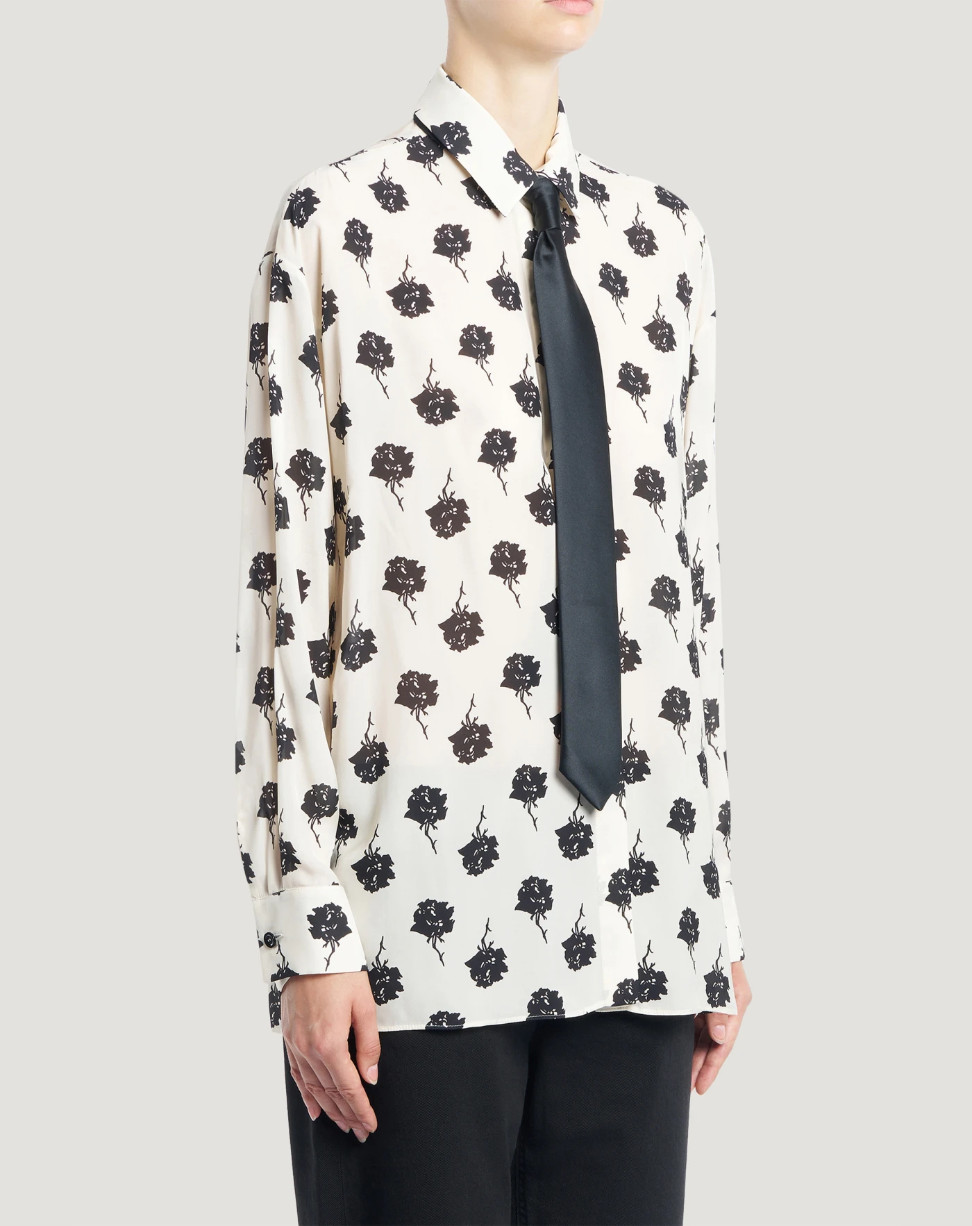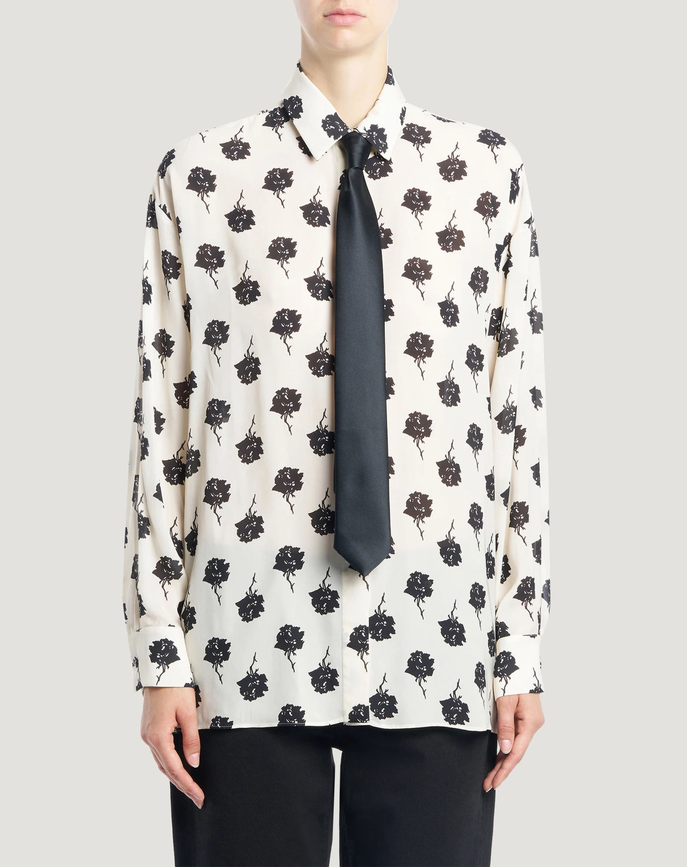 Camicia in georgette di viscosa un tessuto impalpabile, con stampa floreale all over che aggiunge un tocco poetico allo stile. Design d'ispirazione maschile con cravatta per un modello ricercato e di carattere.