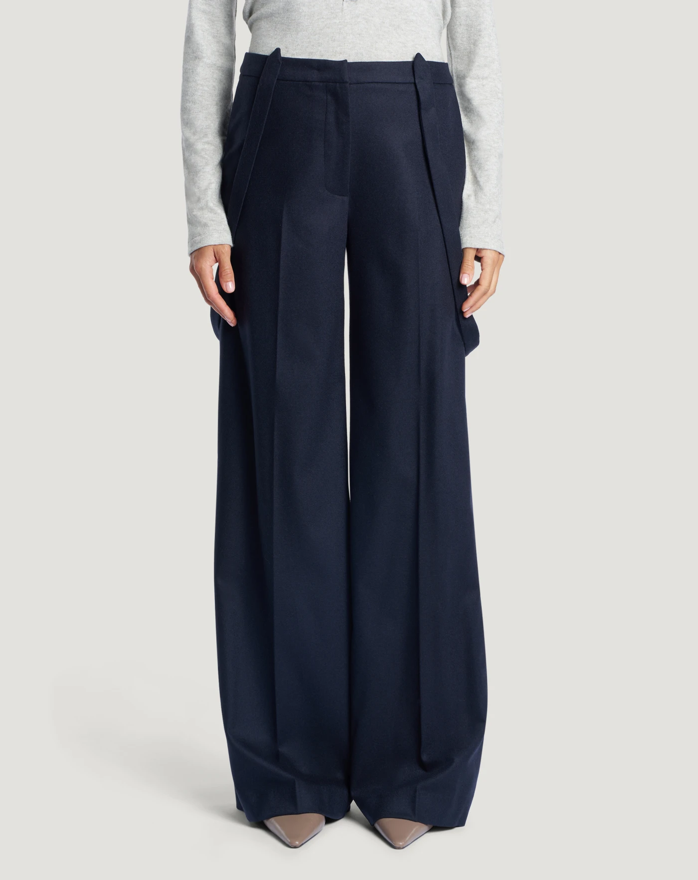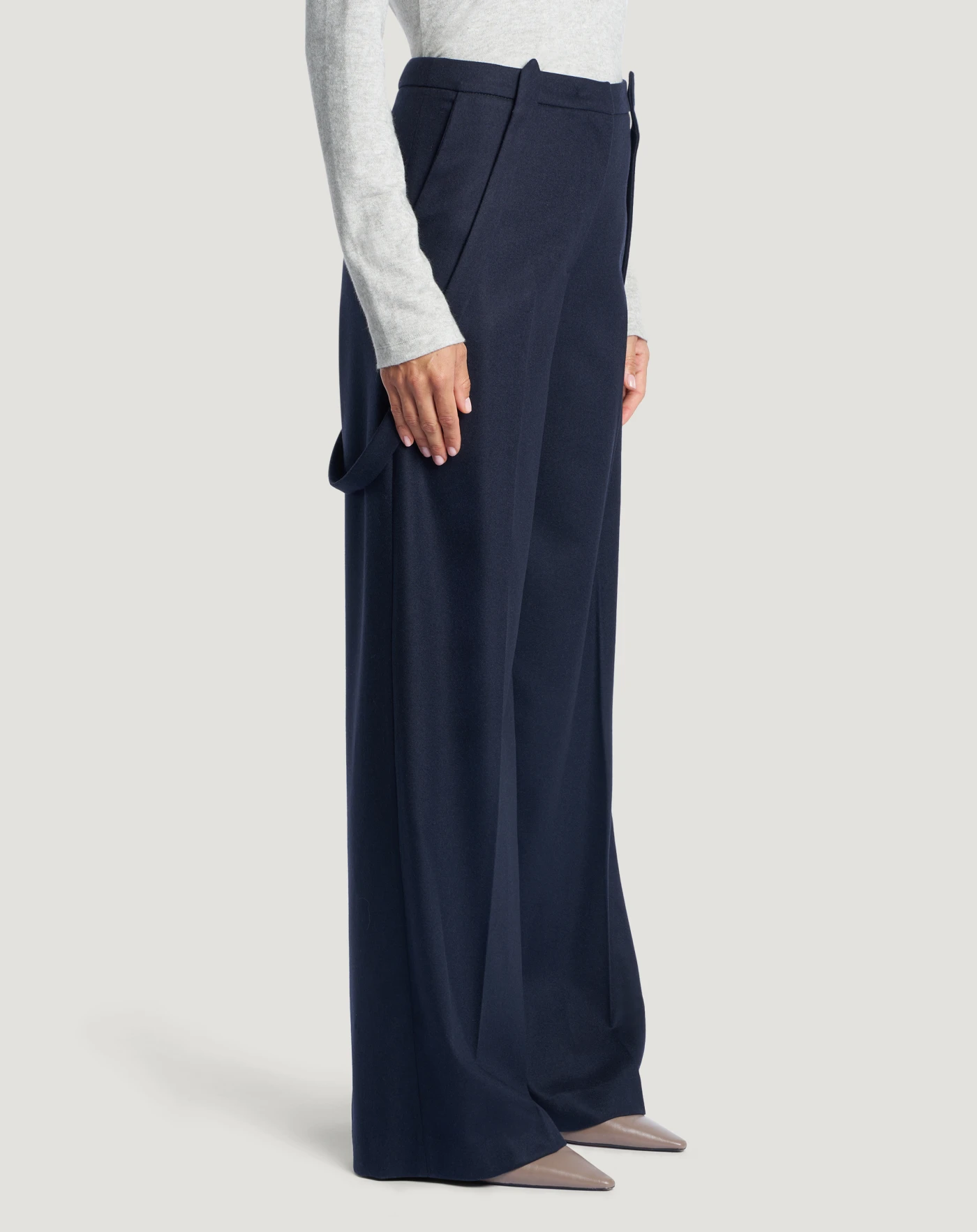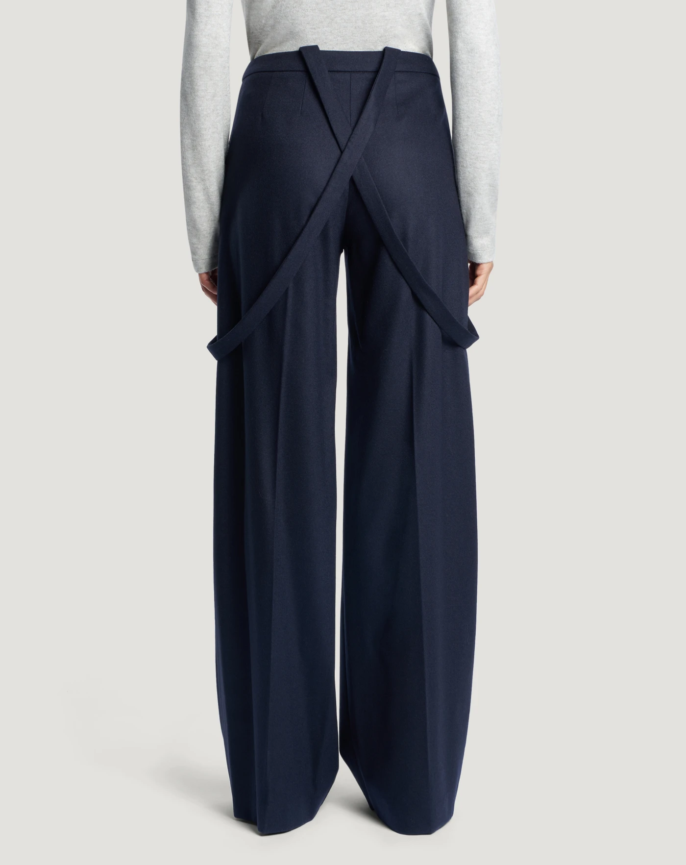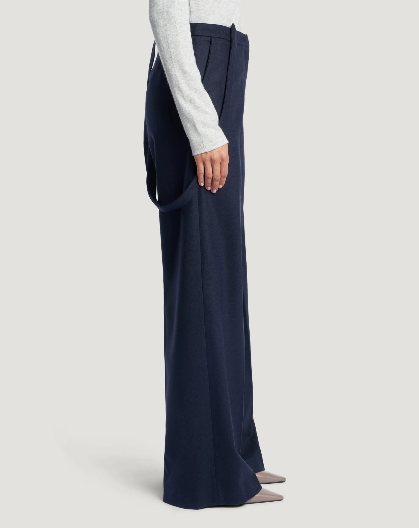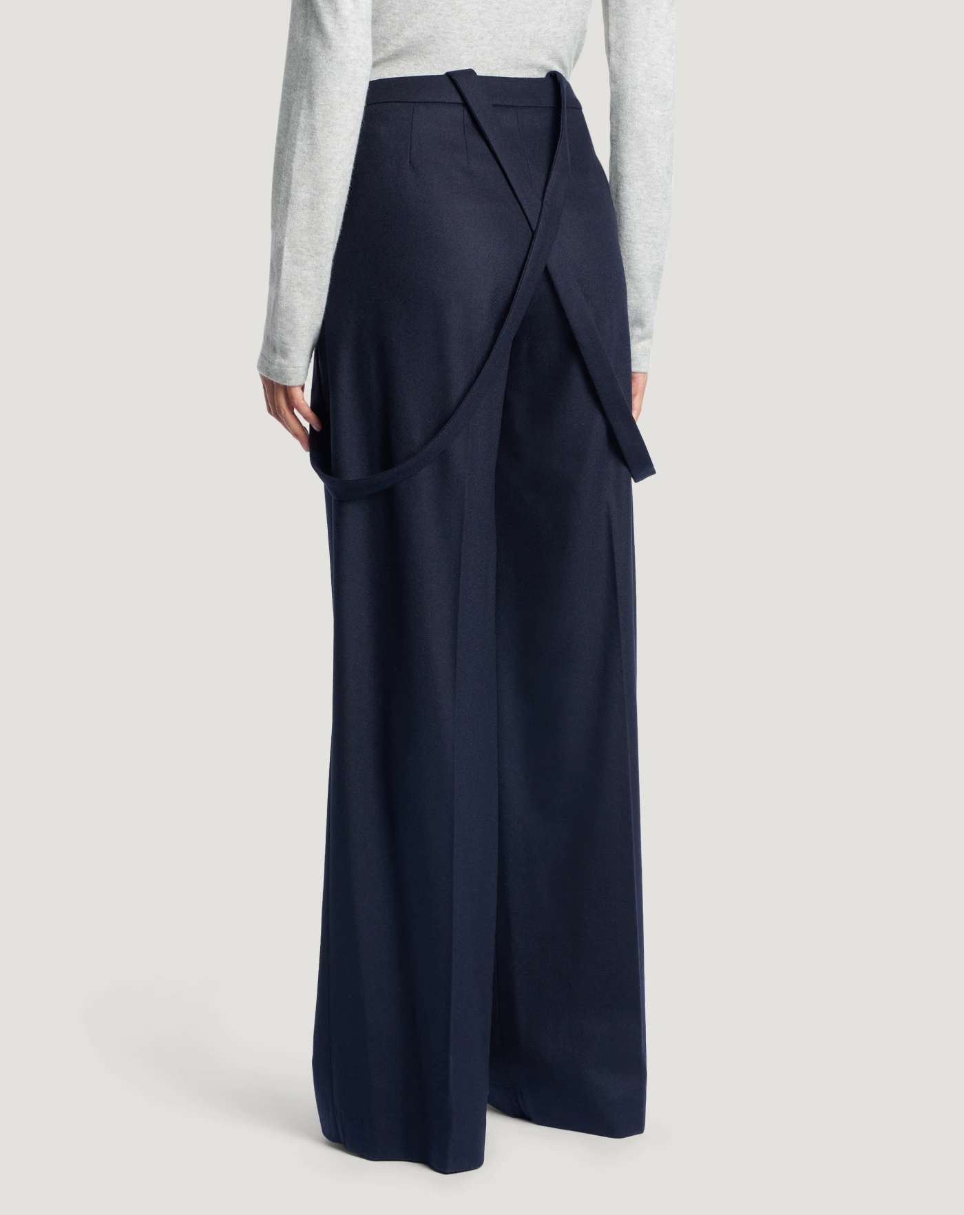 Pantaloni in flanella di lana e cashmere, un tessuto morbido e caldo, perfetto per completare i look di stagione. Con vita bassa, bacino pulito e linea dritta, li puoi indossare con o senza le bretelle in dotazione. La variante blu navy per aggiungere eleganza alle mise quotidiane.