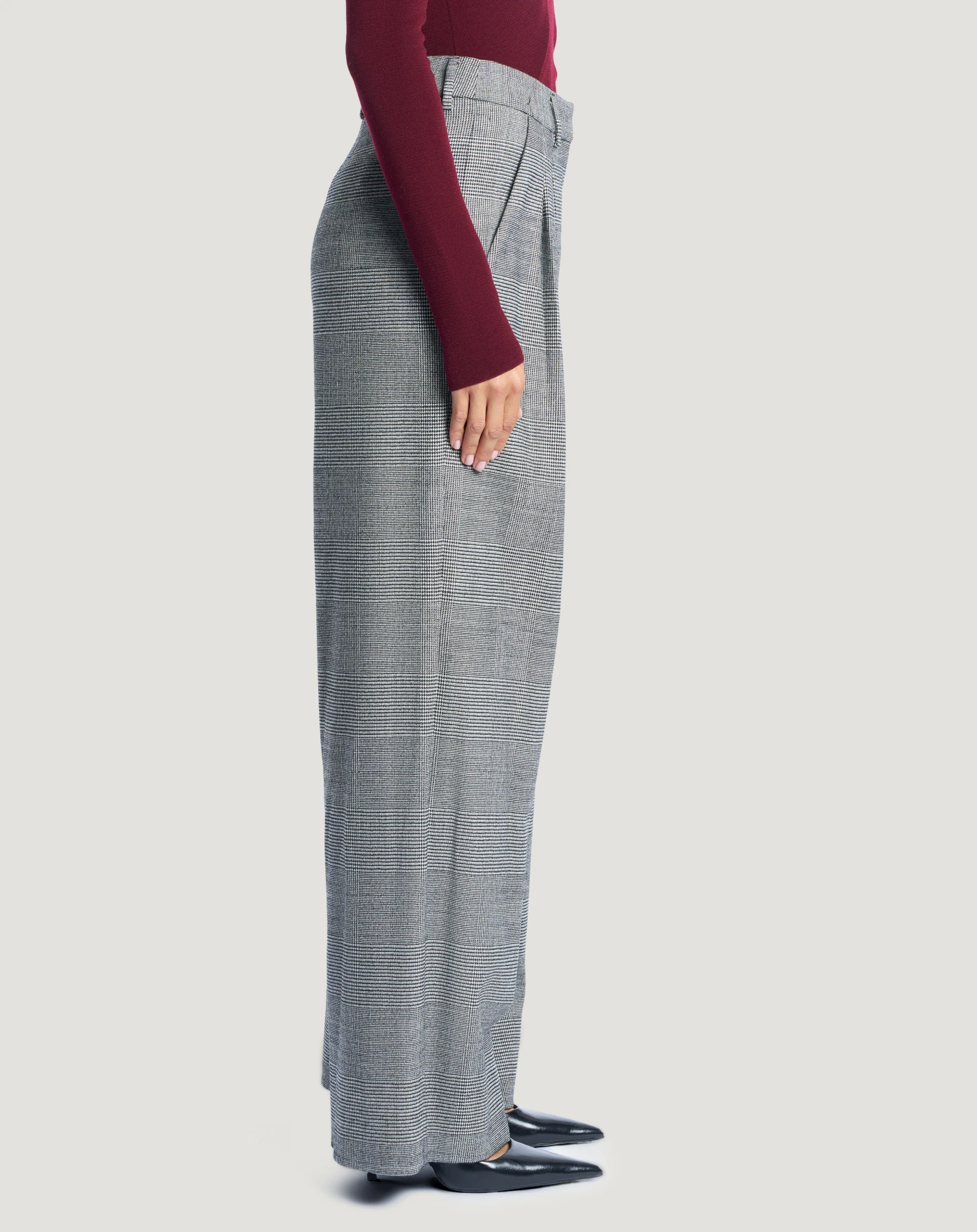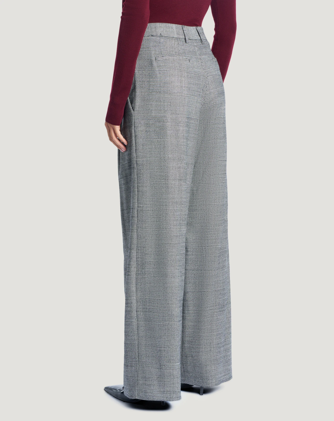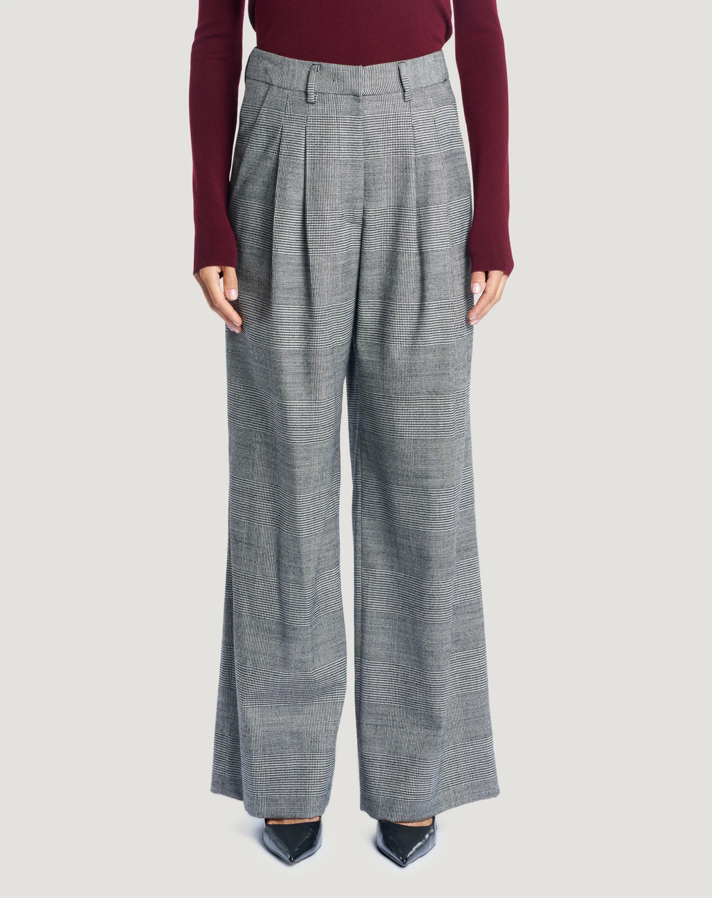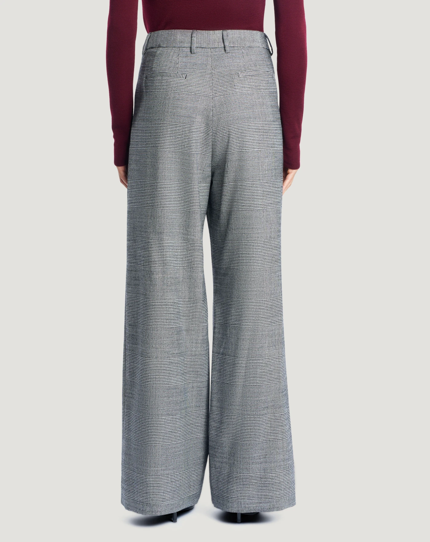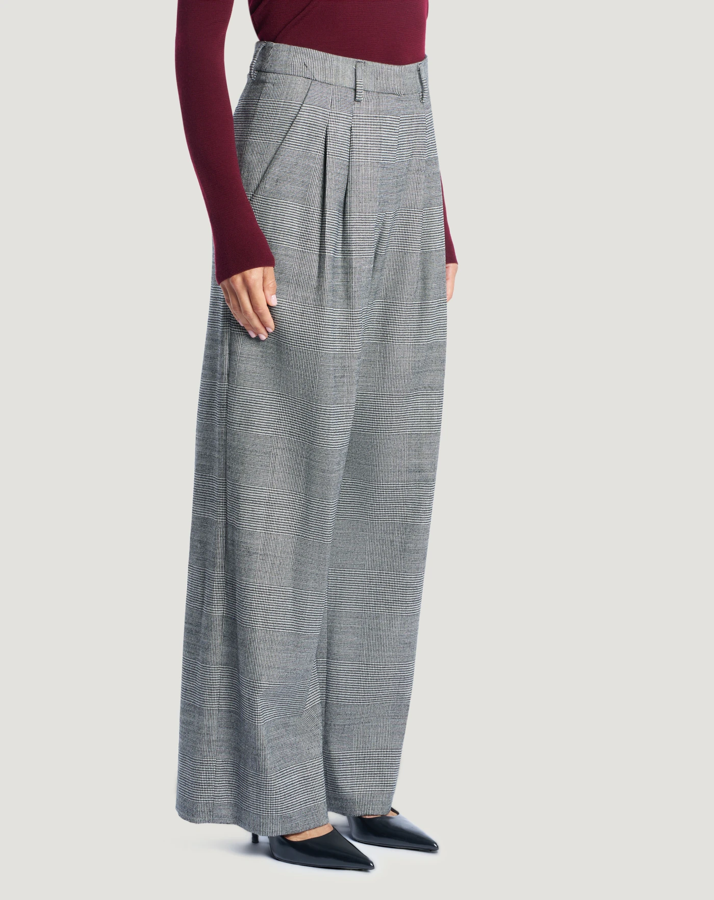 Pantaloni in lana stretch a fantasia check, un tessuto caldo e ricercato per dare una nota grafica allo stile. Con linea ampia e pieghe davanti che creano movimento, scegli il nero per aggiungere un fascino new classic al look.