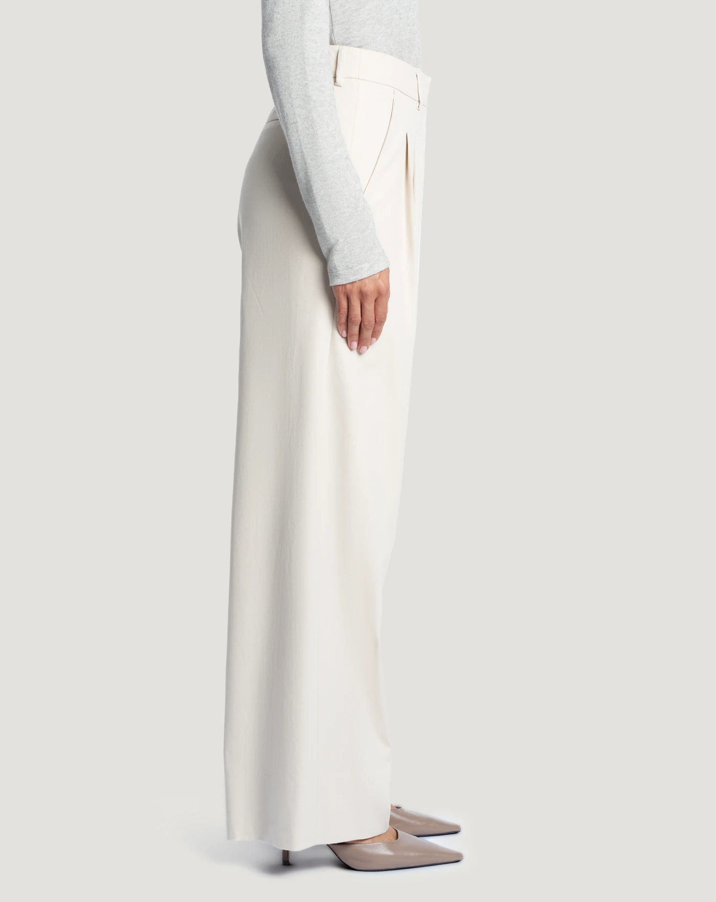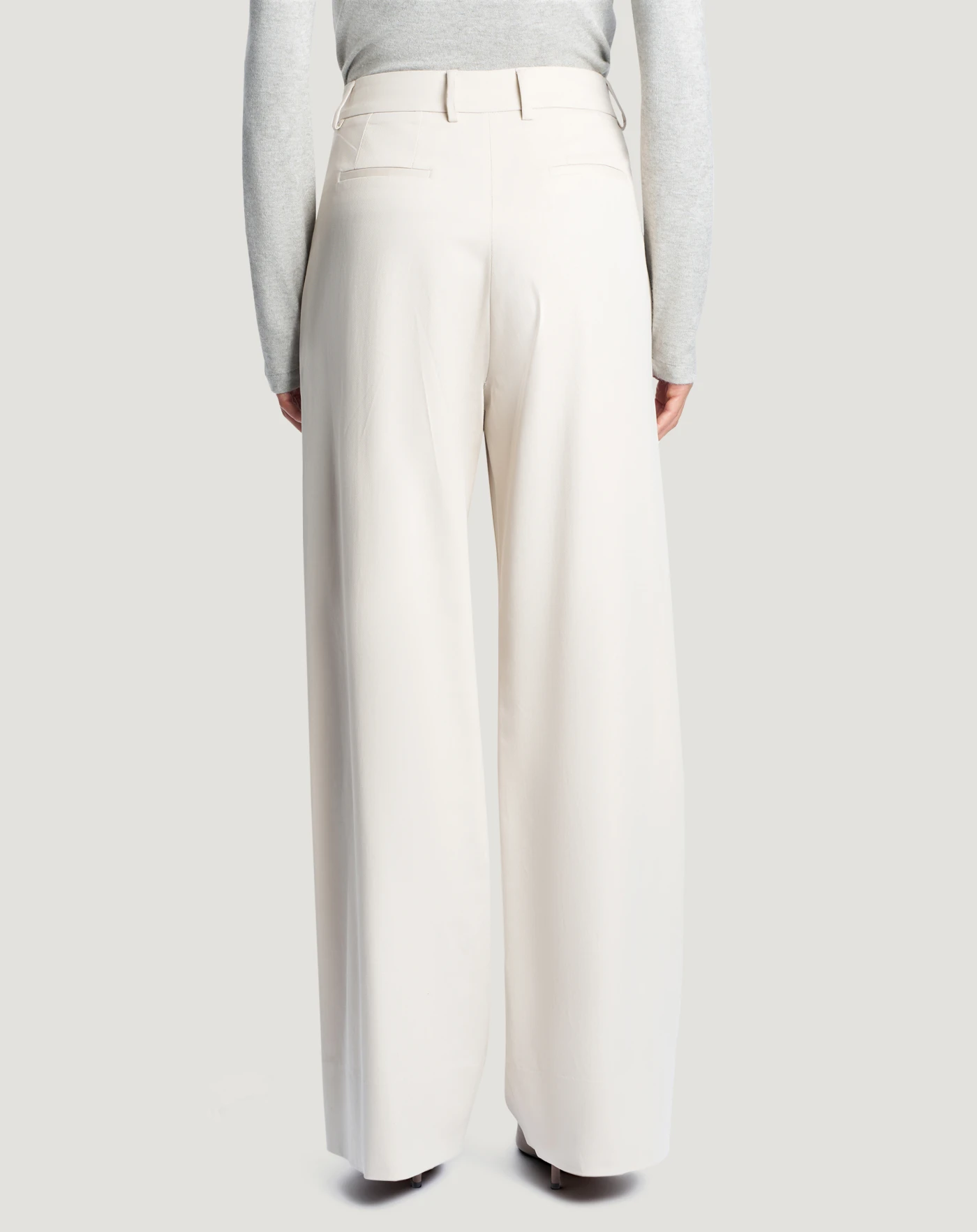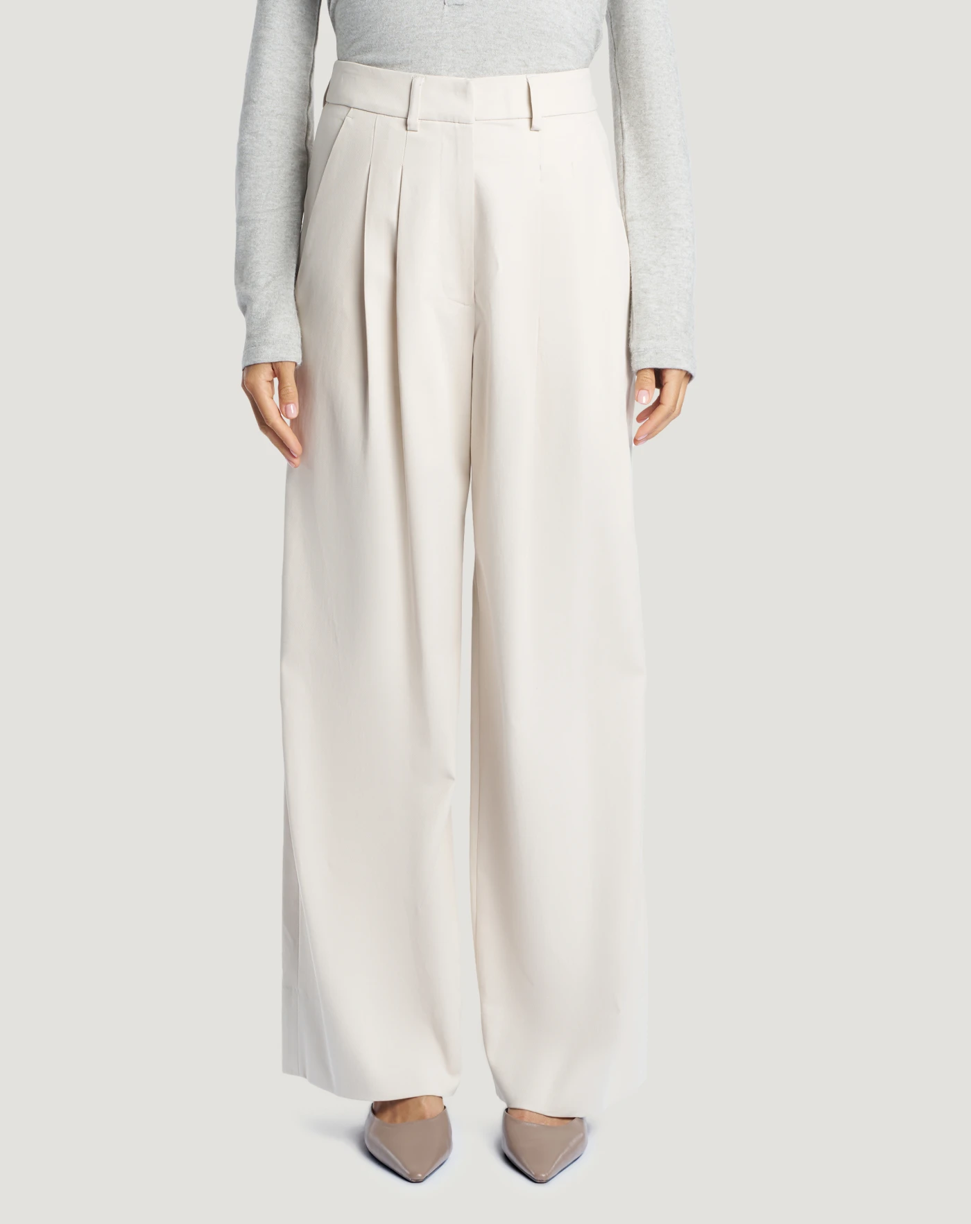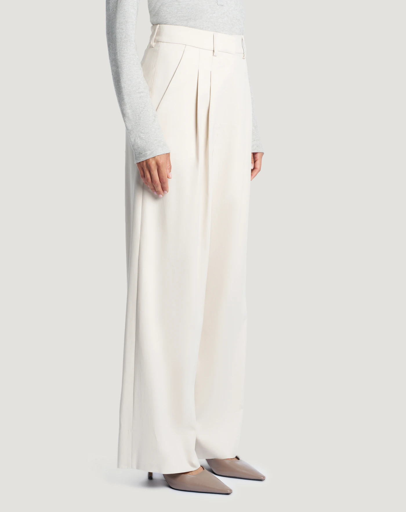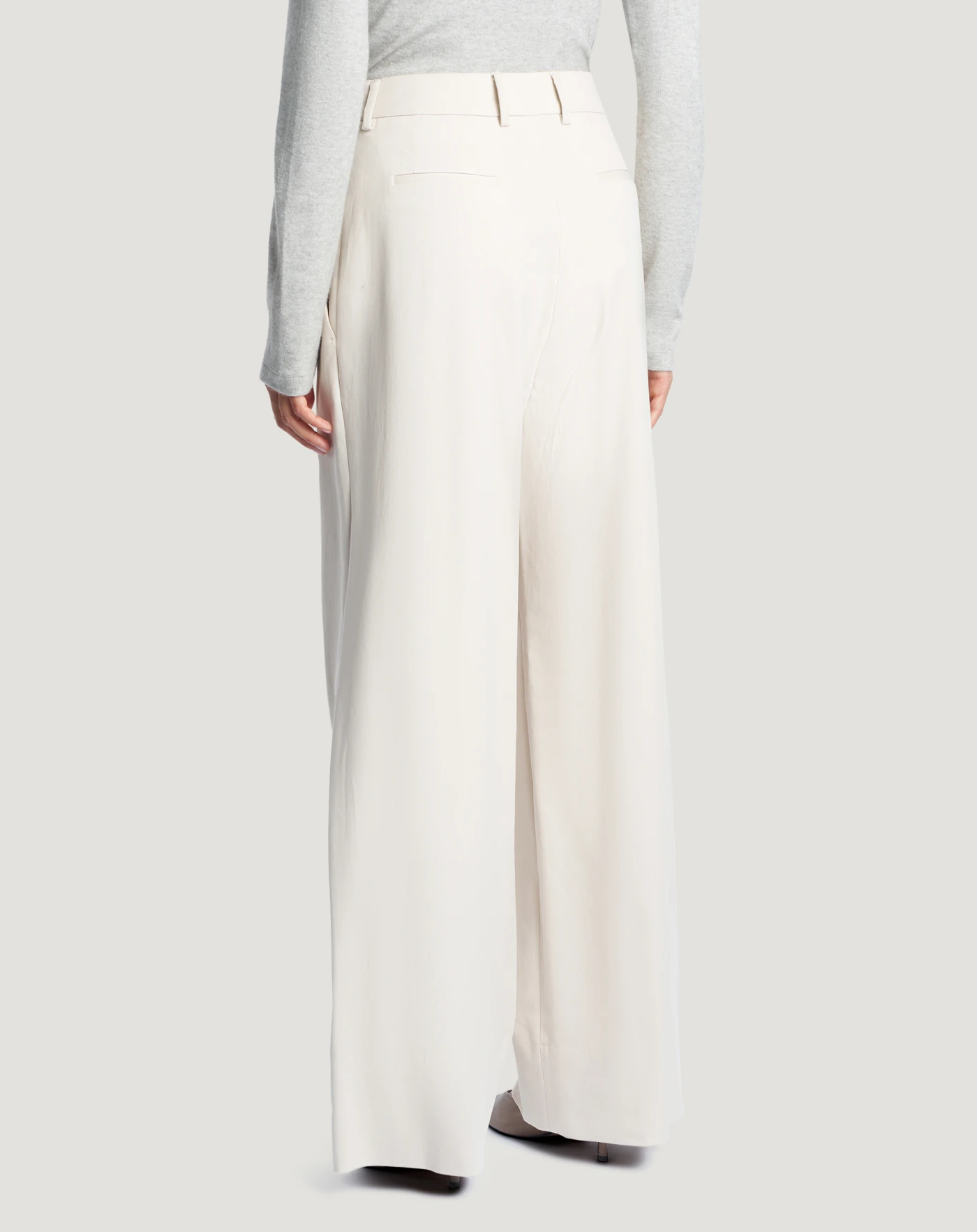 Pantaloni in twill di cotone e cachemire, un tessuto confortevole ed elegante, che segue i movimenti del corpo. Hanno linea ampia e pieghe davanti che creano movimento. Scegli la variante ghiaccio per dare una nota luminosa allo stile.