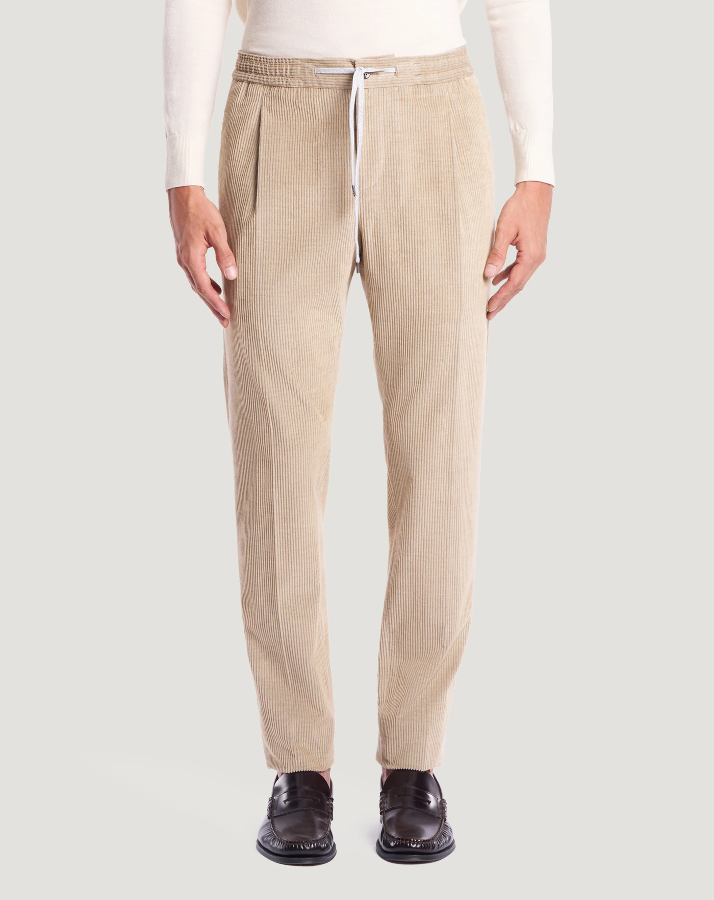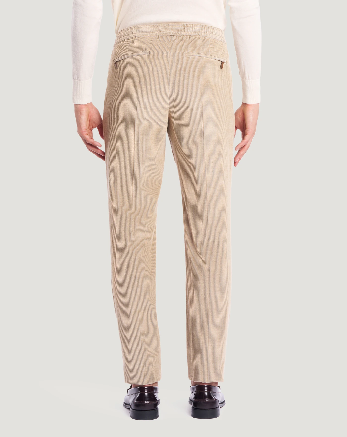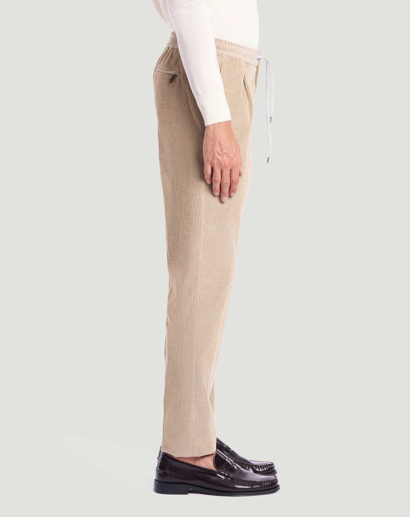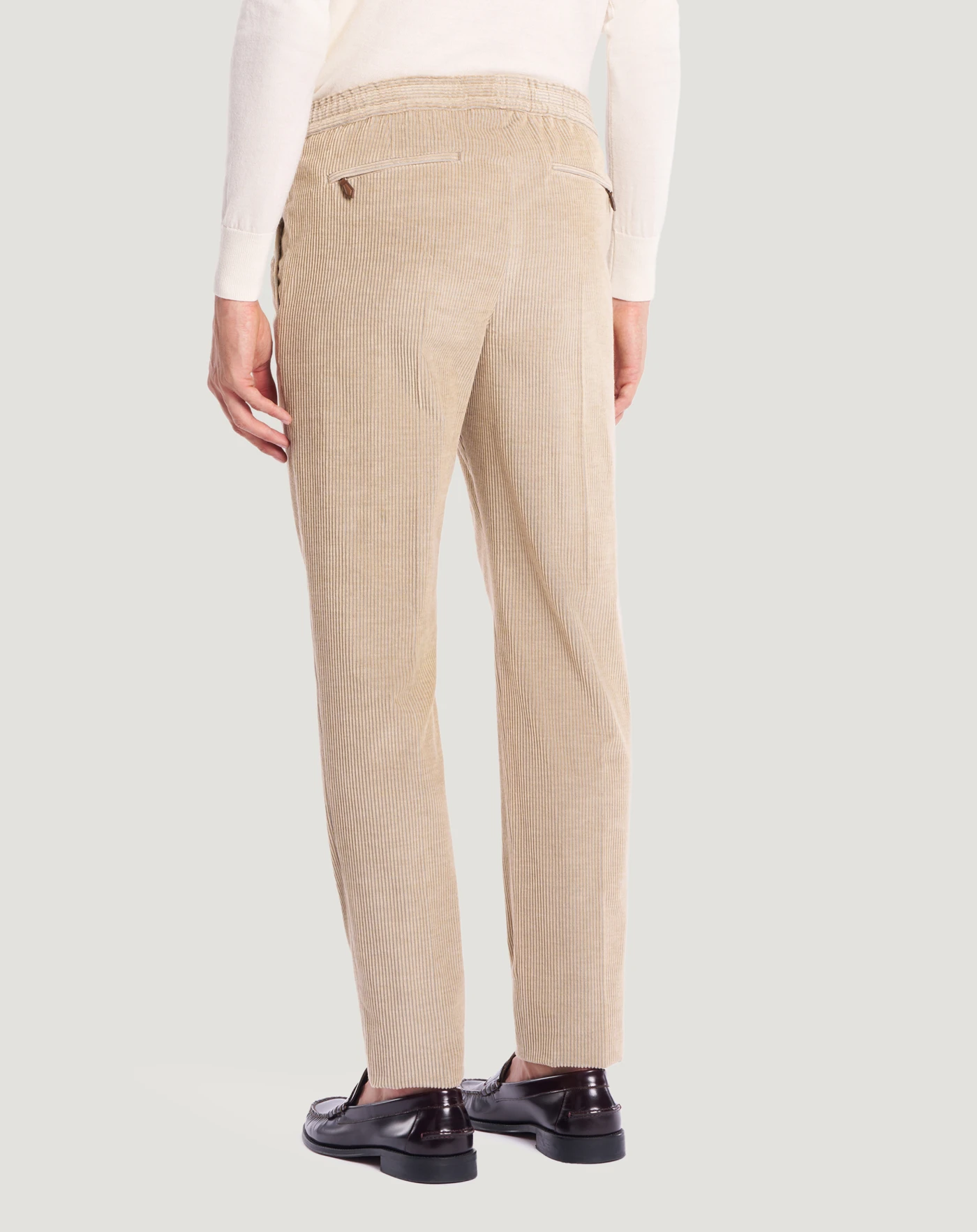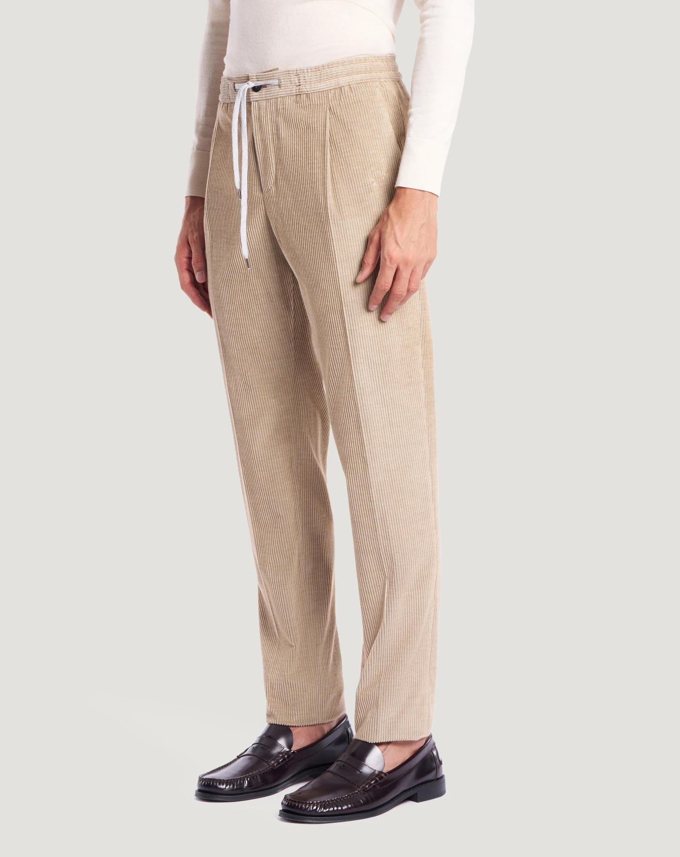Pantaloni in velluto a costine effetto mélange, un tessuto contemporaneo e confortevole.Con elastico in vita e coulisse, donerà una nota elegante e rilassata allo stile. In variante beige per look casual ricercati.